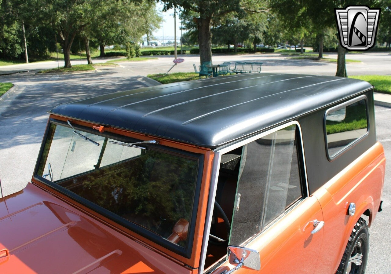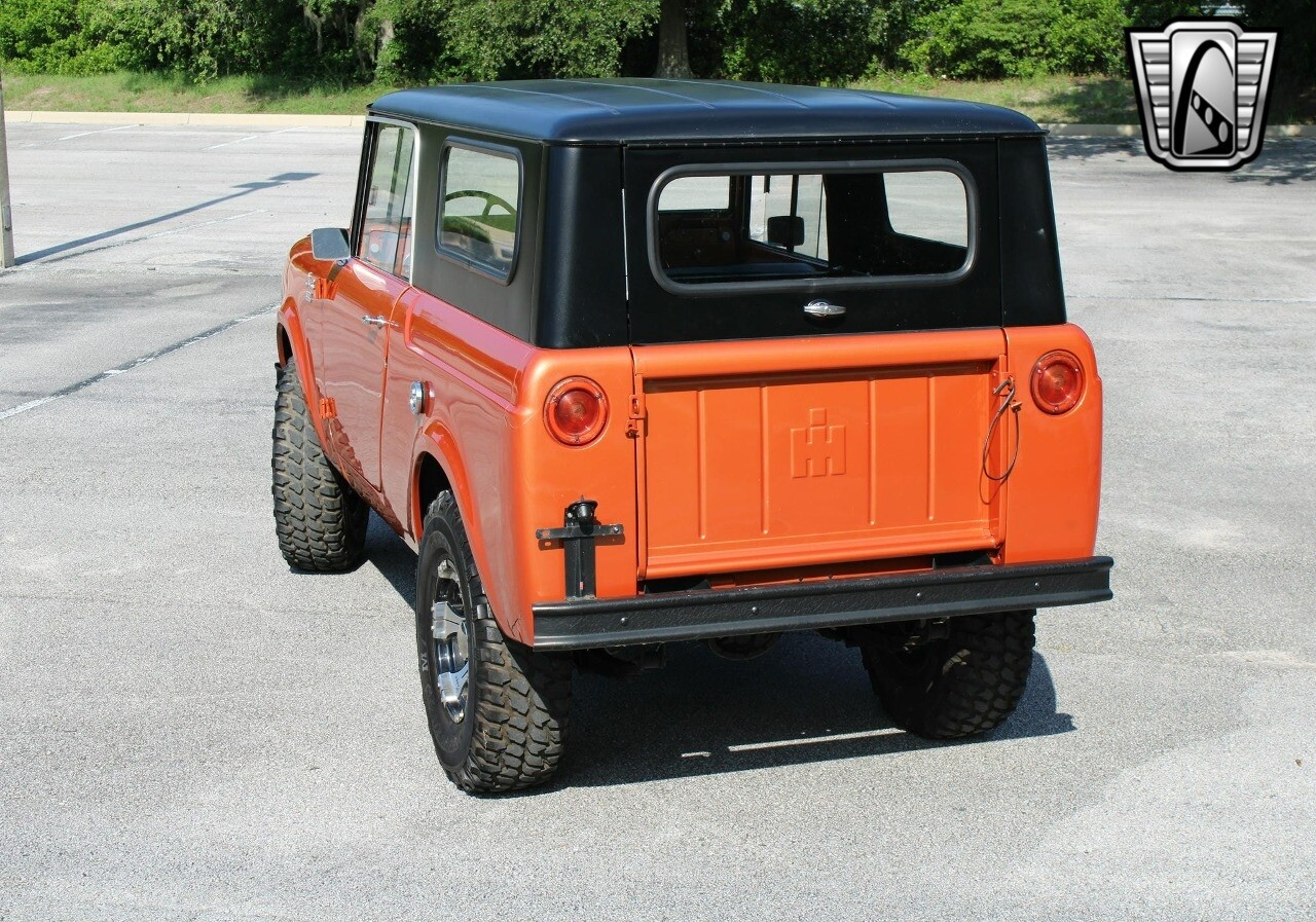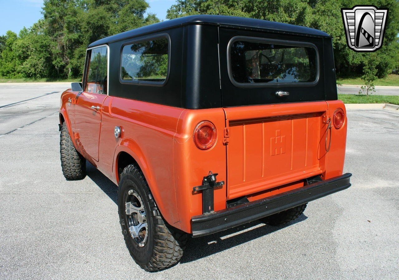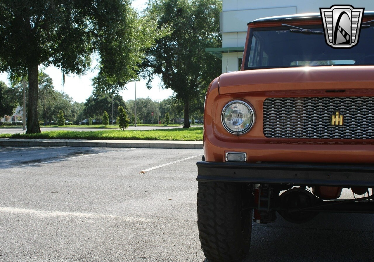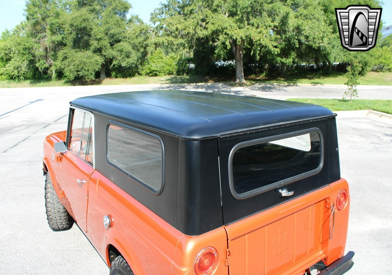 Introducing the 1963 International Harvester Scout, a classic embodiment of rugged utility and timeless design. This particular model stands out with its striking orange exterior, a color that not only commands attention but also pays homage to the vibrant spirit of the 1960s. The Scout's bold exterior is complemented by a sleek black interior, creating a visually appealing contrast that enhances its vintage charm.