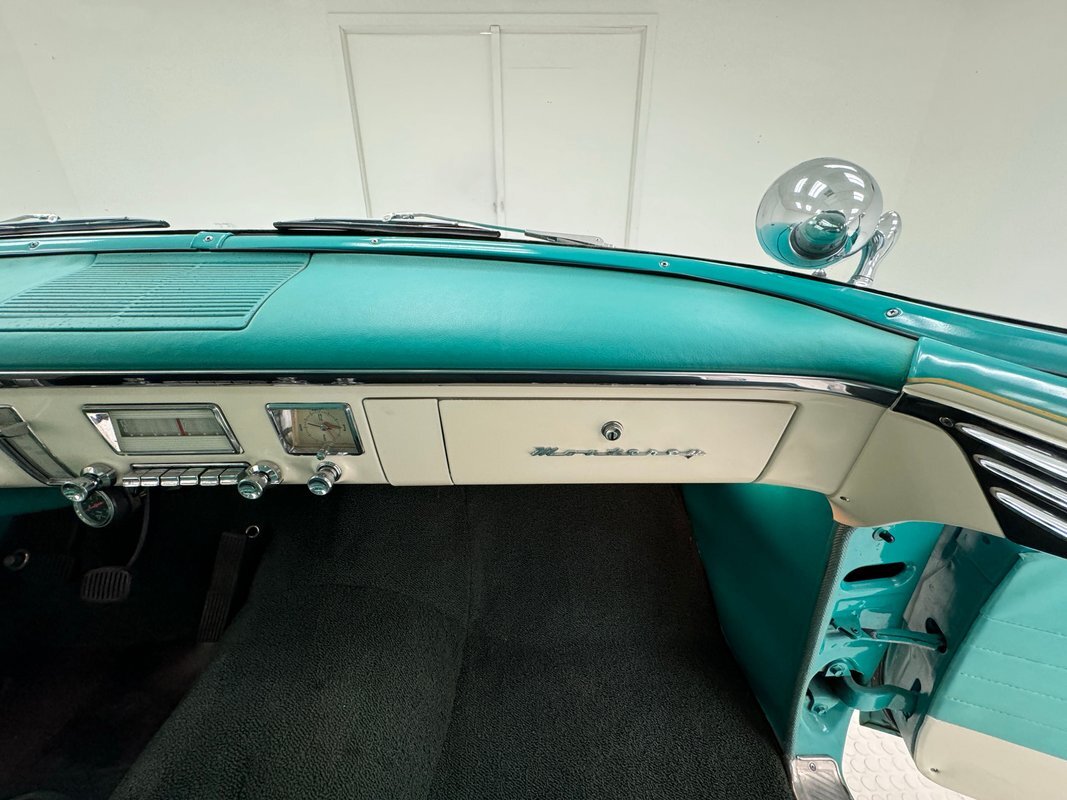Verona Green is sandwiched between panels of Classic White, separated on the body by an ornate and unique side molding is a combination of straight lines, louvered accents, sweeping curved lines, and an integrated gravel guard. There were plenty of bi-colored cars in the 50's but the separation was never as bold as the Monterey's. The roof wears the white and is framed in robust polished metal trim and window frames. Mercurys are known for their use of chrome up front, and this one is no exception with thick crossbars under thinner bars of the grille which travel from one side to the other. Circular ducts added to the hood actually function to bring air into the engine bay which is flanked by two spotlights affixed to the cowl. More chrome is found in the faux side pipes and the rear bumper and bumper bars just under chrome rimmed taillight that are artful ovals. The car has pinstriping and a painted spider on the front fender that had us pause for a second. The paint and metal are great on the car and no noticeable flaws were detected.