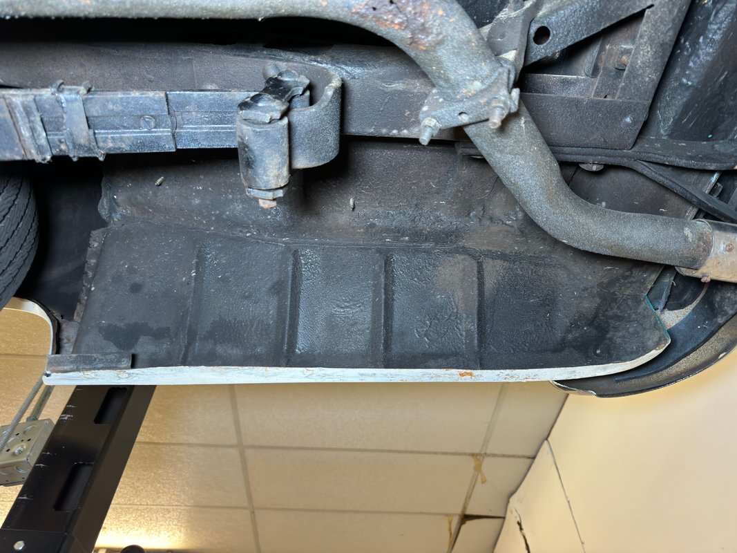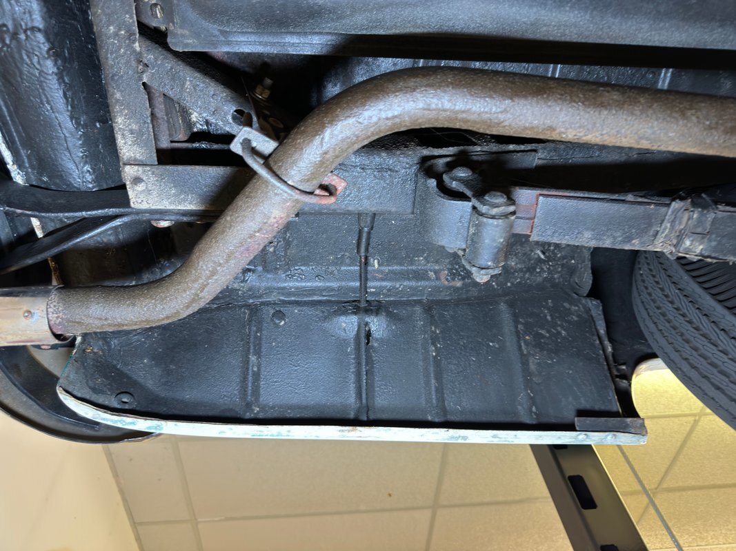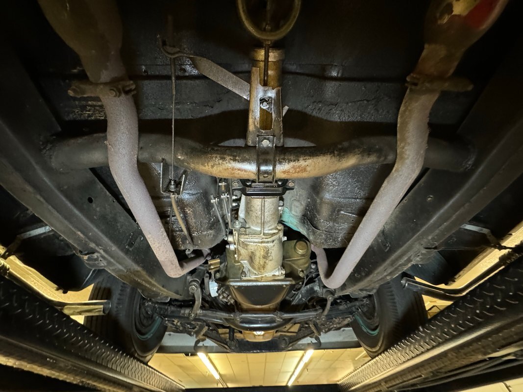Relatively clean underneath with minimal surface rust, mostly reserved for the exhaust which is a dual setup that intersects Cherrybomb mufflers and continue on their journey to the back where they terminate with chrome tips out back. Those side pipes? All show! Mostly dry underneath with one small drop of oil on the oil pan. Coil springs are employed up front and leaf springs are in the back and the car has been lowered.