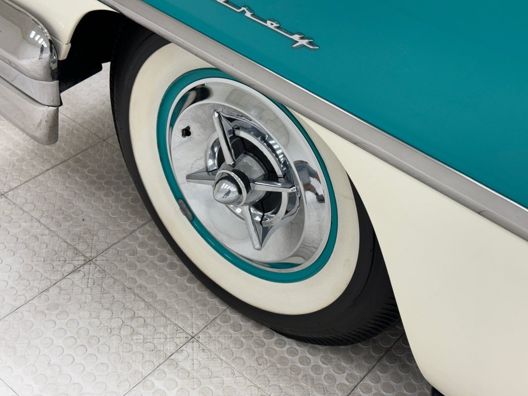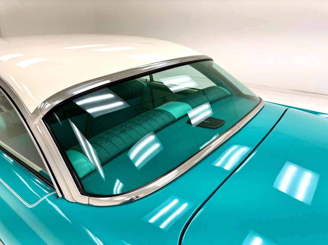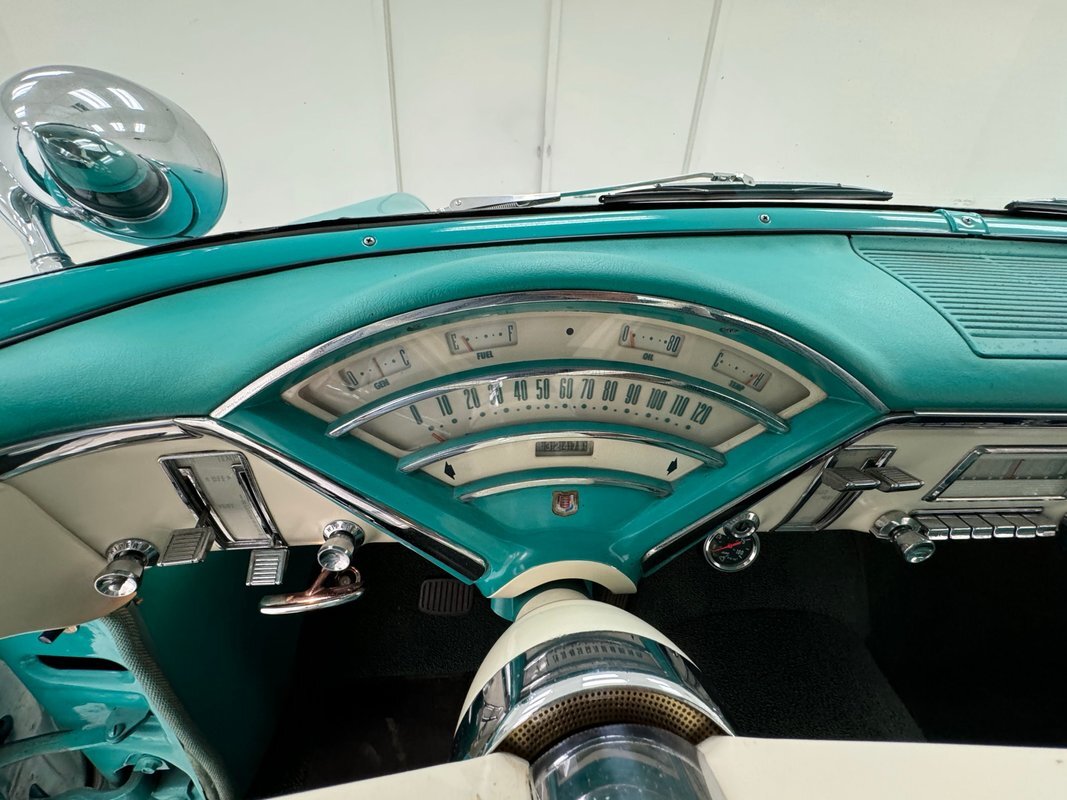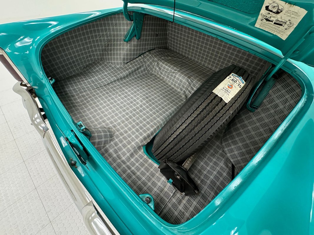 Sharp angles reappear on the door panels where metal trim separates white panels from the turquoise one and both of the big doors are in good shape. A vinyl split bench wraps turquoise vinyl around cloth green inserts over a white base and the pattern is mirrored in the back bench in fine, fifties fashion. A white plastic steering wheel is in good condition and leads to the V-shaped gauge cluster with arching gauges in tiered, delineated rows. Switchgear is metallic and robust, and the center AM radio sits adjacent to a square clock that looks like something out of a country kitchen. Our spider reappears on the floor mounted shifter which rises from the hump covered with turquoise loop carpet showing a bit of usage. The turquoise headliner is in great shape and the trunk is completely lined in a plaid mat and houses a spare.