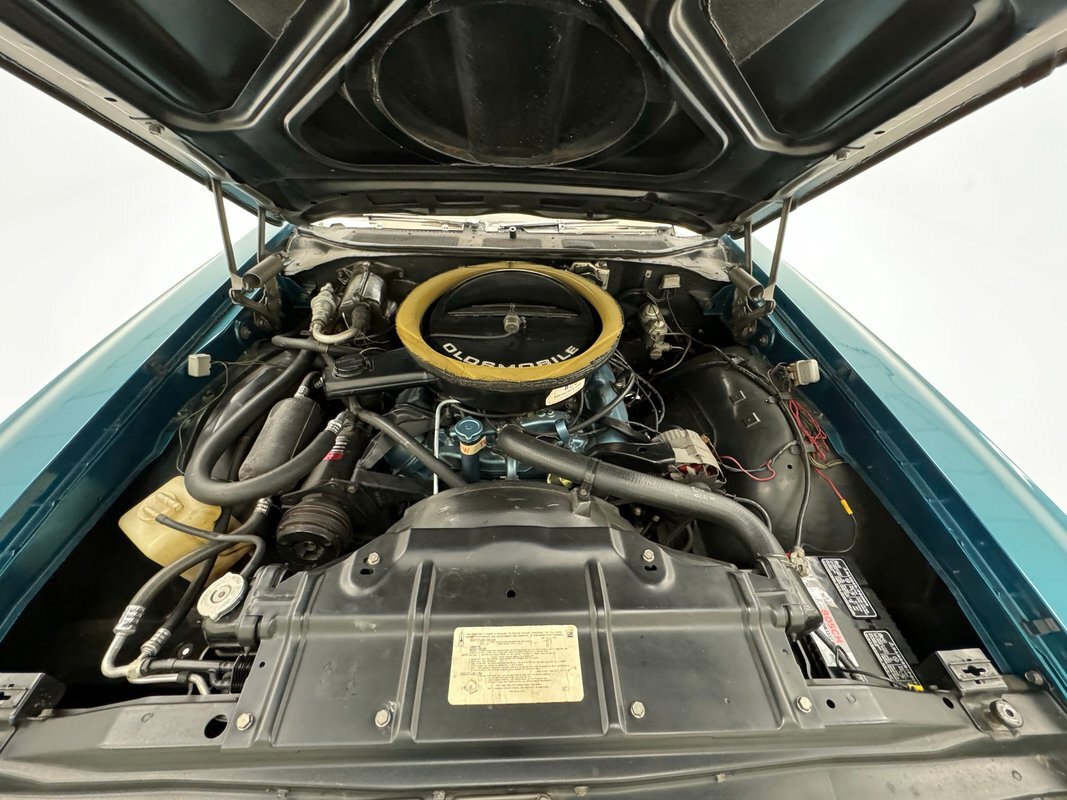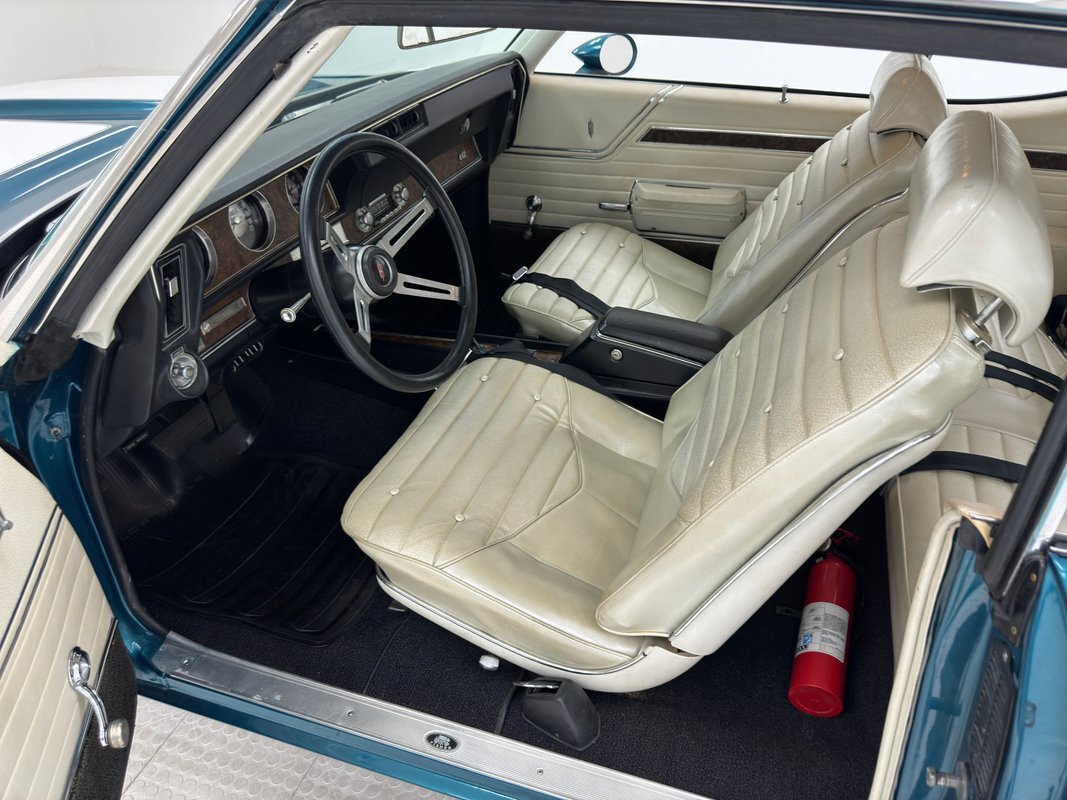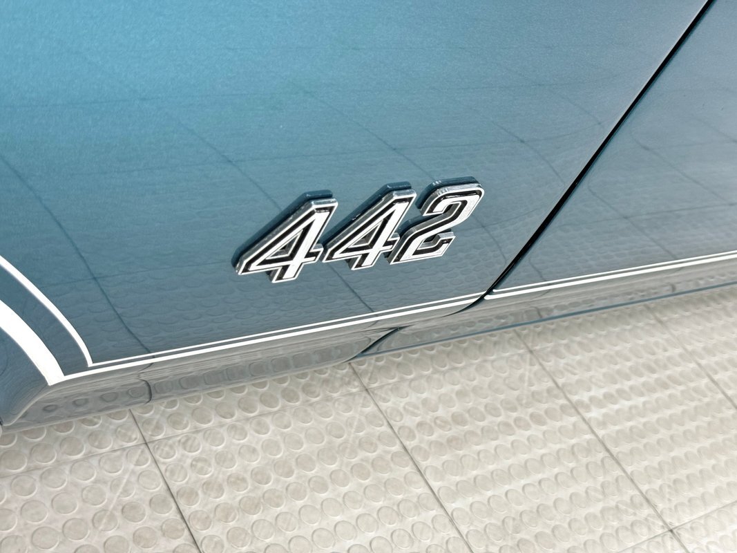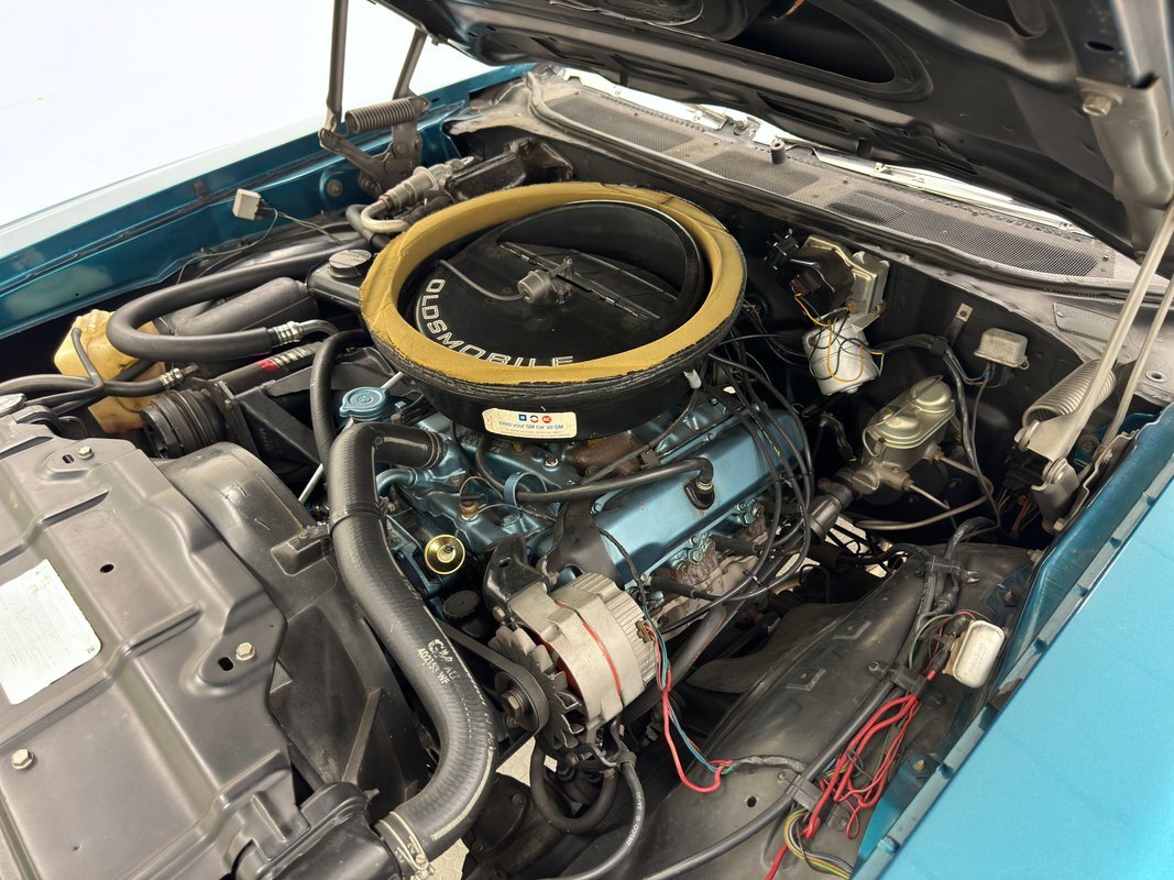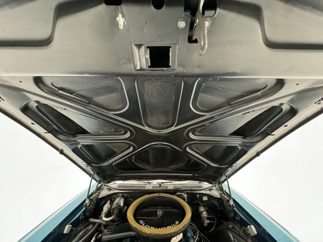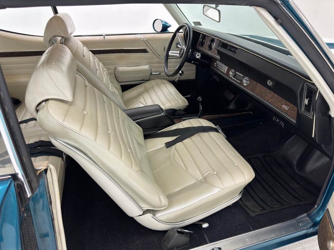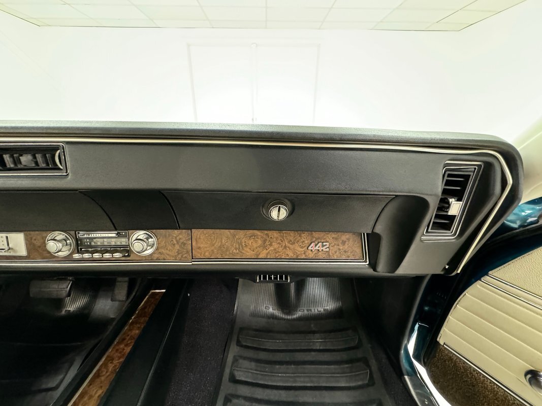 The Aegean sea is an arm of the Mediterranean and forms a bay where beautiful blue water exists off the coast of Greece, and it is for this body of water that Aegean Aqua was selected as the name of the paint that covers this car in two stage beauty. It is, of course, accented by some white highlights as a 442 and that includes white stripes on the W25 twin raised hood scoops, a thin white stripe that rides over the wheel openings and goes from the nose to the tail, and a bright white vinyl top that underlines the C-pillar just over slight fender bulges in the rear. Pairings are common on the car and includes twin headlights on each side, two hood pins, the rectangular hood scoops, a split grille with mirror image sides, sport mirrors color keyed to the body, taillights that have twin vertical bars, and twin trumpet exhaust tips. The chrome and paint on this car are nearly impeccable are the glass, top, and panel gaps. 14-inch Oldsmobile Super Stock II wheels are clean and wear 225/70R14 tires with an early 2020 manufacturing date. The only imperfection we note is a small scratch on the rocker panel below a door. As Porky Pig would say, that's all, folks!