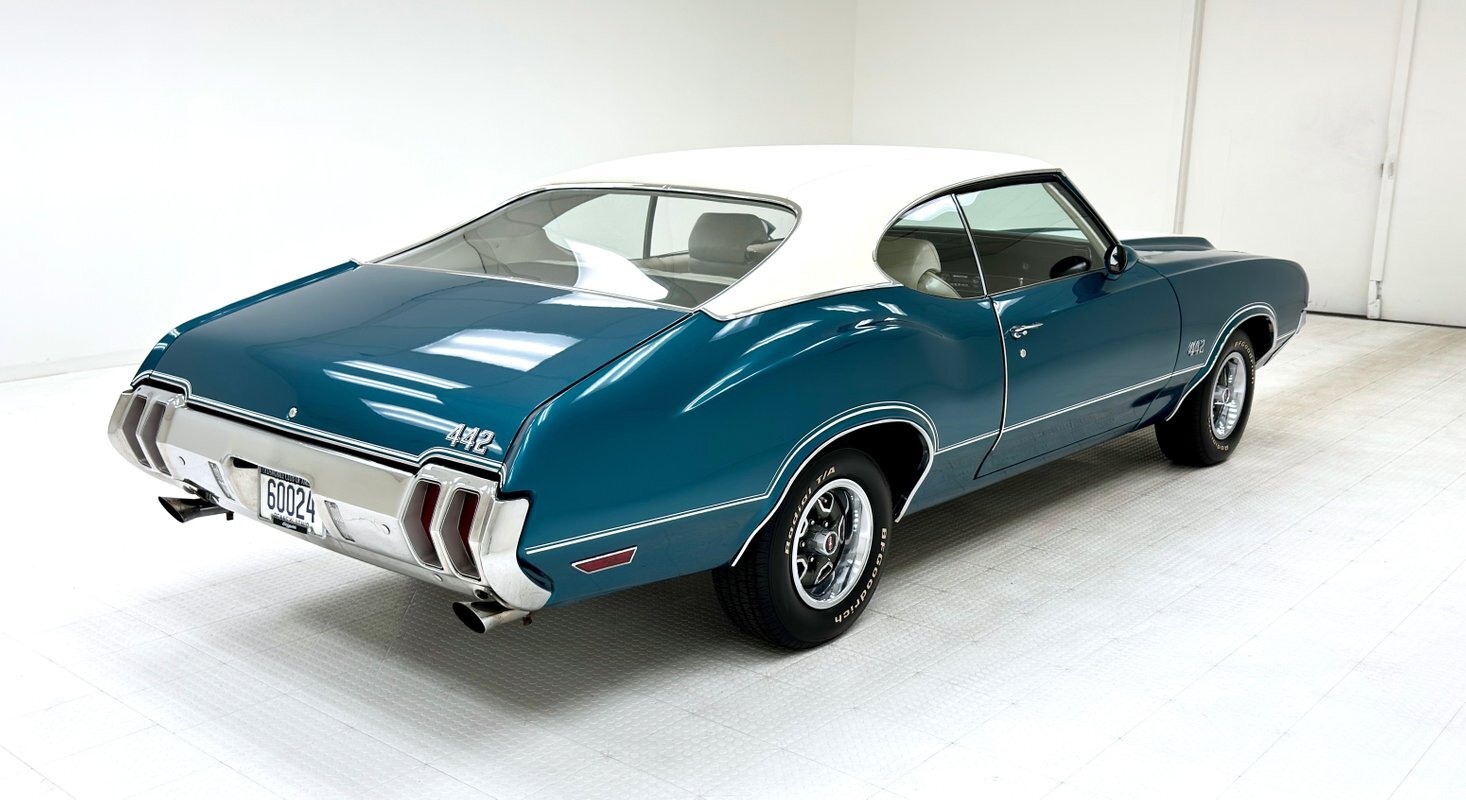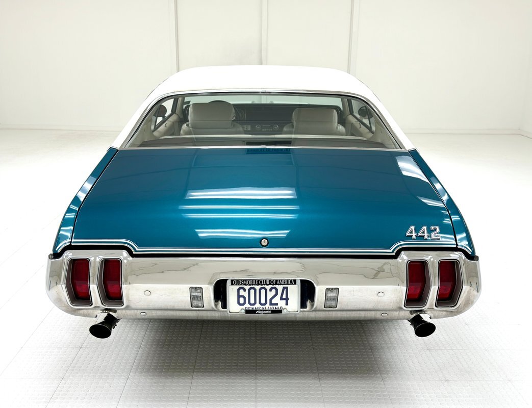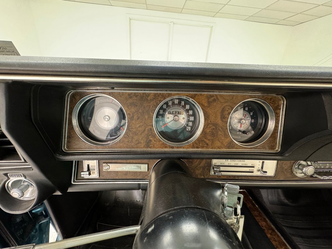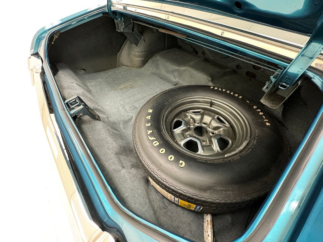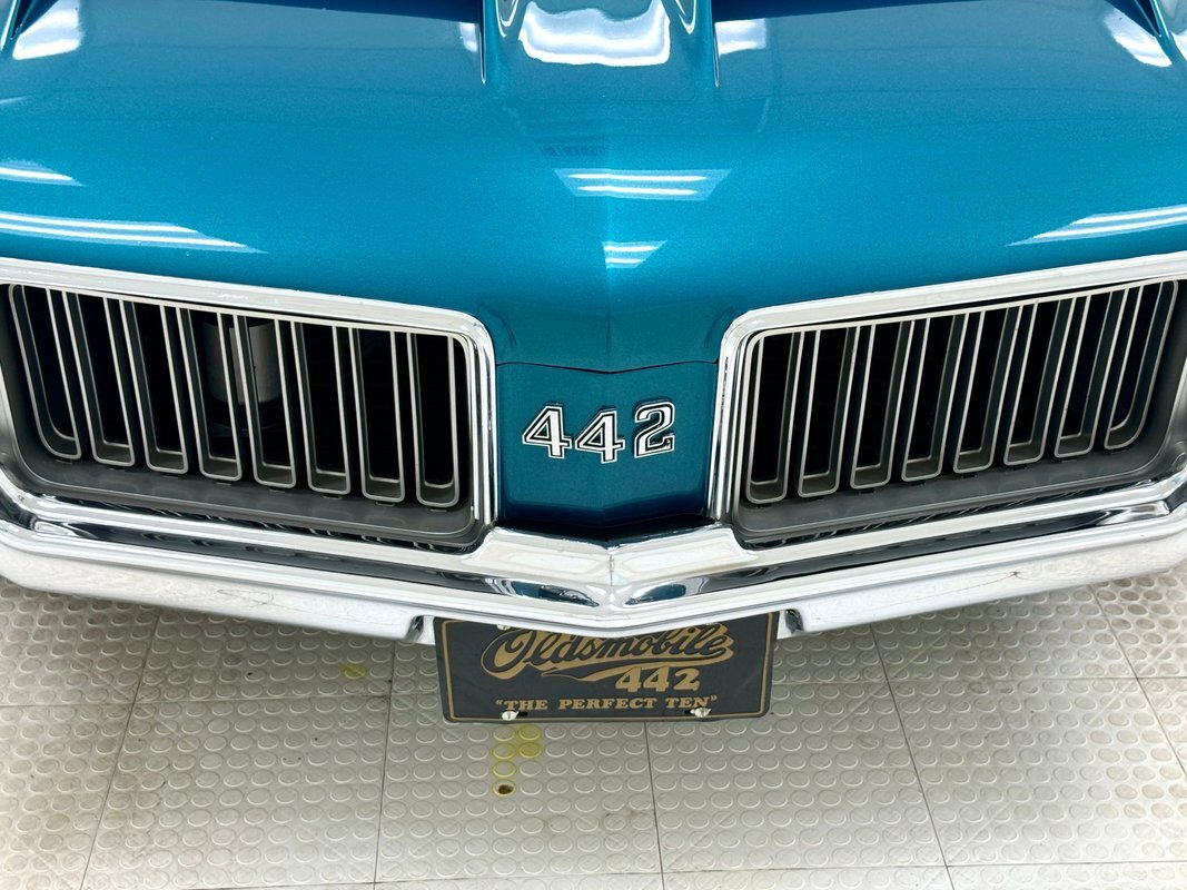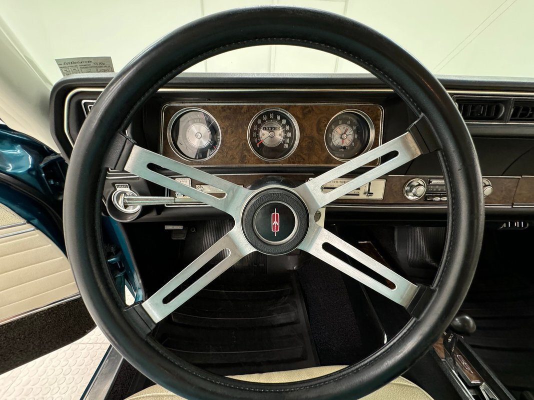 The Aegean sea is an arm of the Mediterranean and forms a bay where beautiful blue water exists off the coast of Greece, and it is for this body of water that Aegean Aqua was selected as the name of the paint that covers this car in two stage beauty. It is, of course, accented by some white highlights as a 442 and that includes white stripes on the W25 twin raised hood scoops, a thin white stripe that rides over the wheel openings and goes from the nose to the tail, and a bright white vinyl top that underlines the C-pillar just over slight fender bulges in the rear. Pairings are common on the car and includes twin headlights on each side, two hood pins, the rectangular hood scoops, a split grille with mirror image sides, sport mirrors color keyed to the body, taillights that have twin vertical bars, and twin trumpet exhaust tips. The chrome and paint on this car are nearly impeccable are the glass, top, and panel gaps. 14-inch Oldsmobile Super Stock II wheels are clean and wear 225/70R14 tires with an early 2020 manufacturing date. The only imperfection we note is a small scratch on the rocker panel below a door. As Porky Pig would say, that's all, folks!