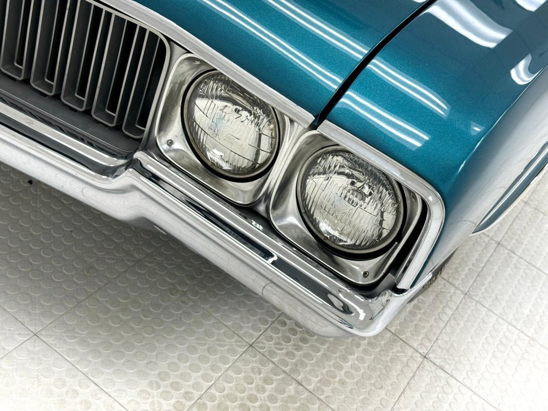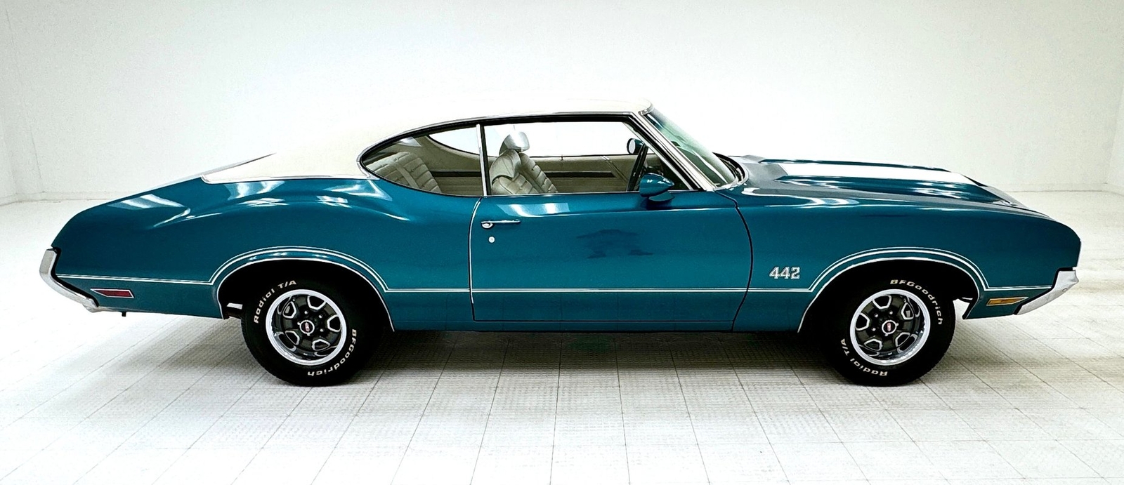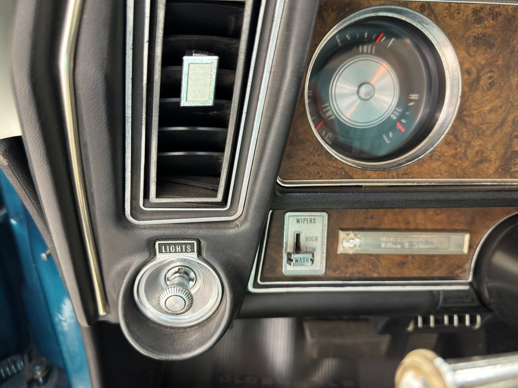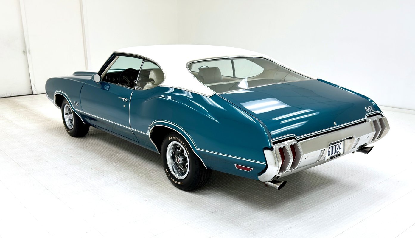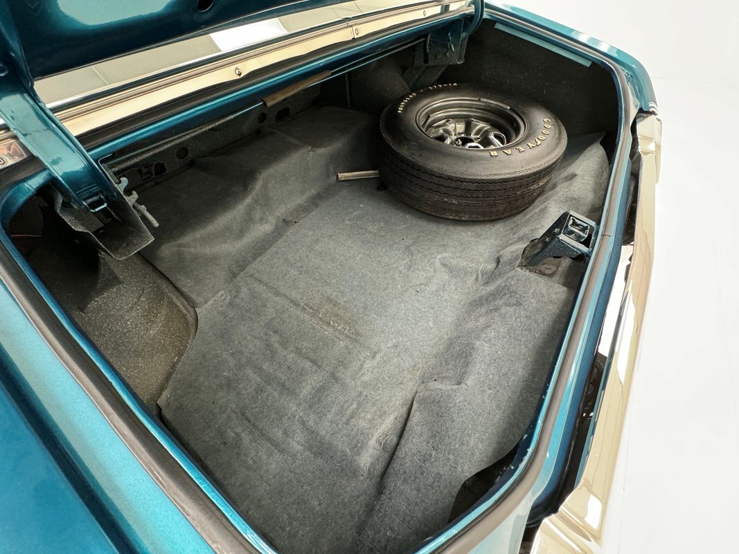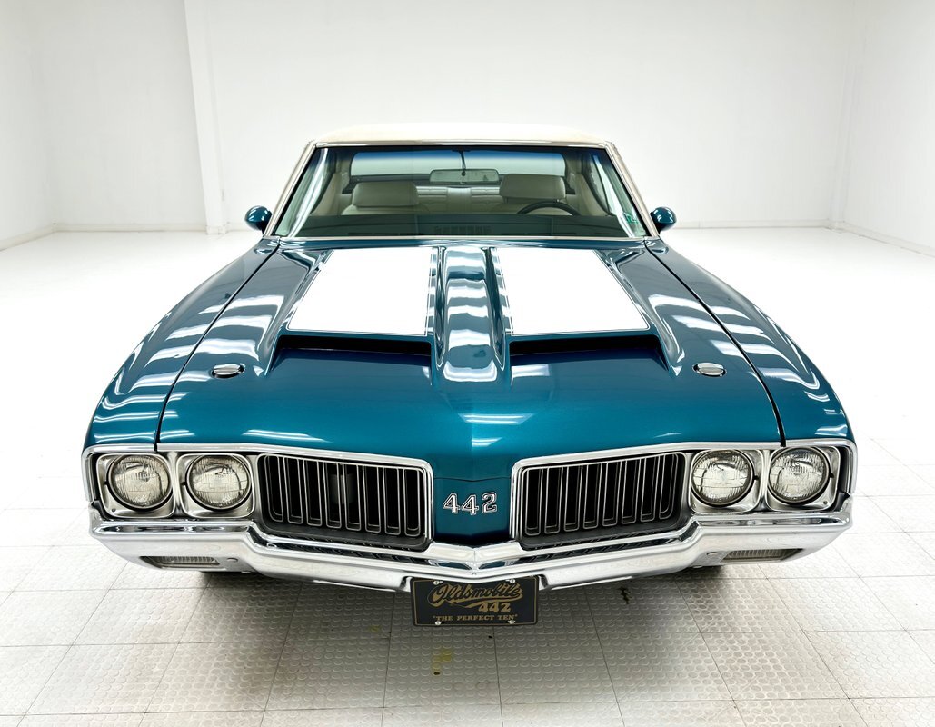 The Aegean sea is an arm of the Mediterranean and forms a bay where beautiful blue water exists off the coast of Greece, and it is for this body of water that Aegean Aqua was selected as the name of the paint that covers this car in two stage beauty. It is, of course, accented by some white highlights as a 442 and that includes white stripes on the W25 twin raised hood scoops, a thin white stripe that rides over the wheel openings and goes from the nose to the tail, and a bright white vinyl top that underlines the C-pillar just over slight fender bulges in the rear. Pairings are common on the car and includes twin headlights on each side, two hood pins, the rectangular hood scoops, a split grille with mirror image sides, sport mirrors color keyed to the body, taillights that have twin vertical bars, and twin trumpet exhaust tips. The chrome and paint on this car are nearly impeccable are the glass, top, and panel gaps. 14-inch Oldsmobile Super Stock II wheels are clean and wear 225/70R14 tires with an early 2020 manufacturing date. The only imperfection we note is a small scratch on the rocker panel below a door. As Porky Pig would say, that's all, folks!