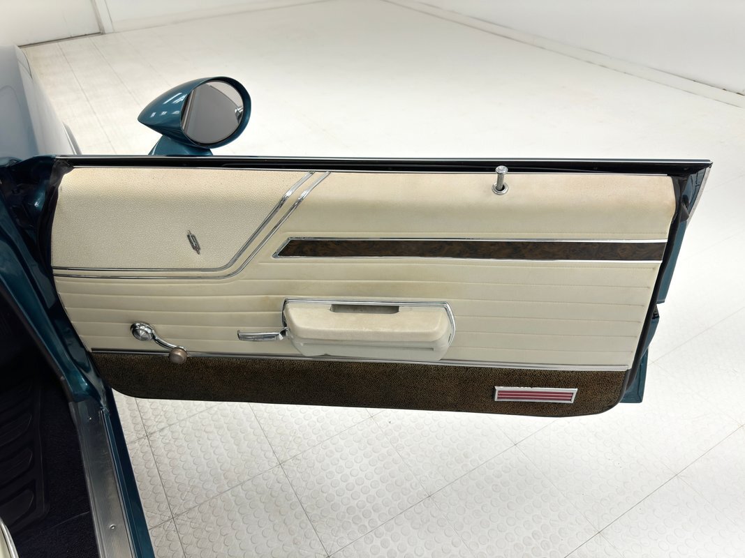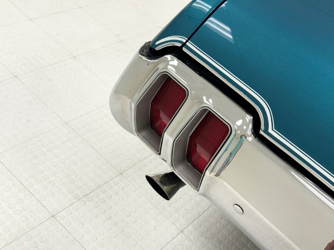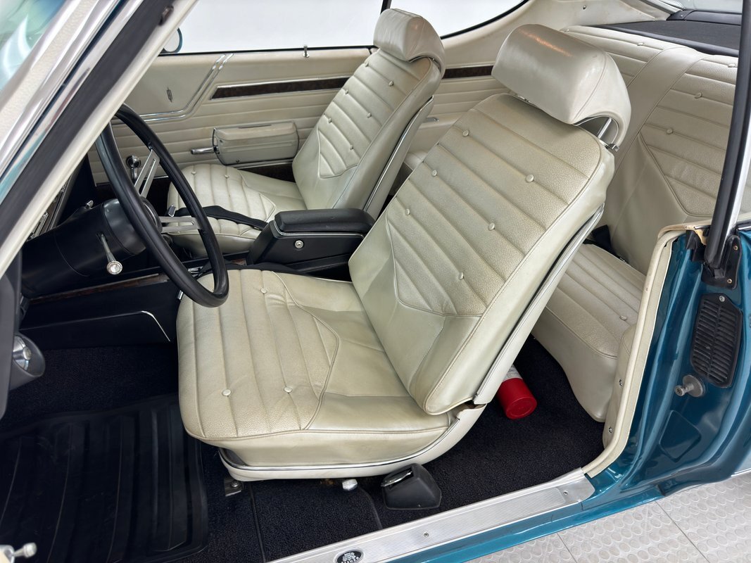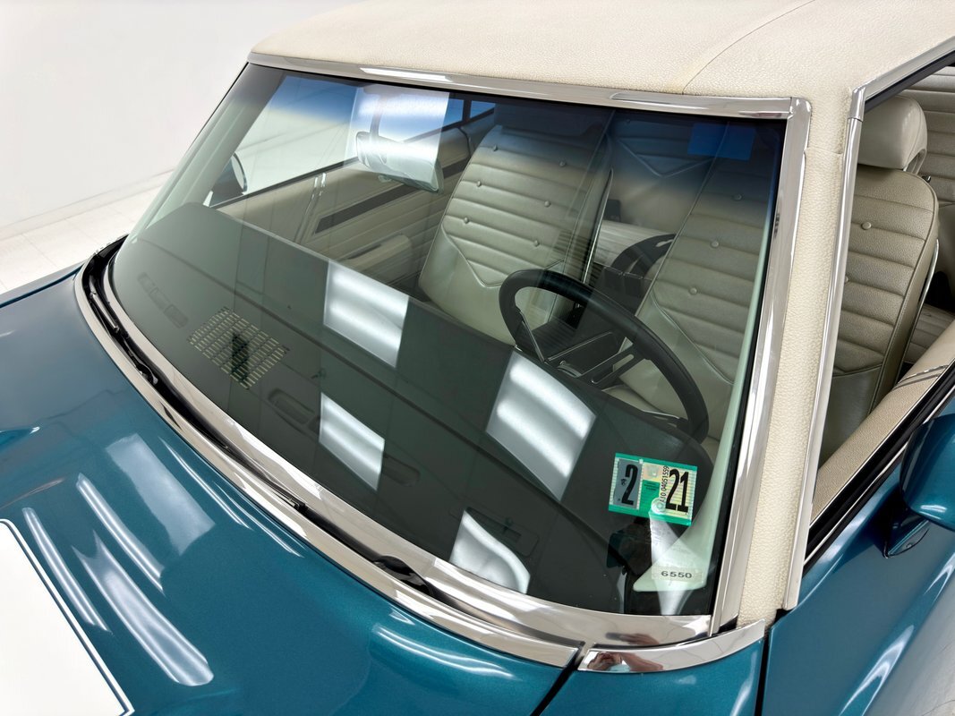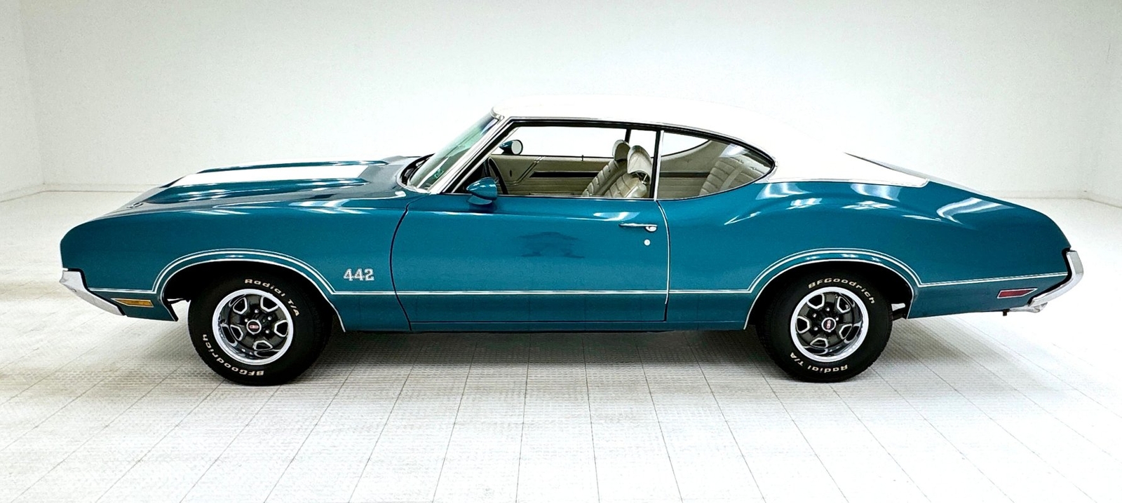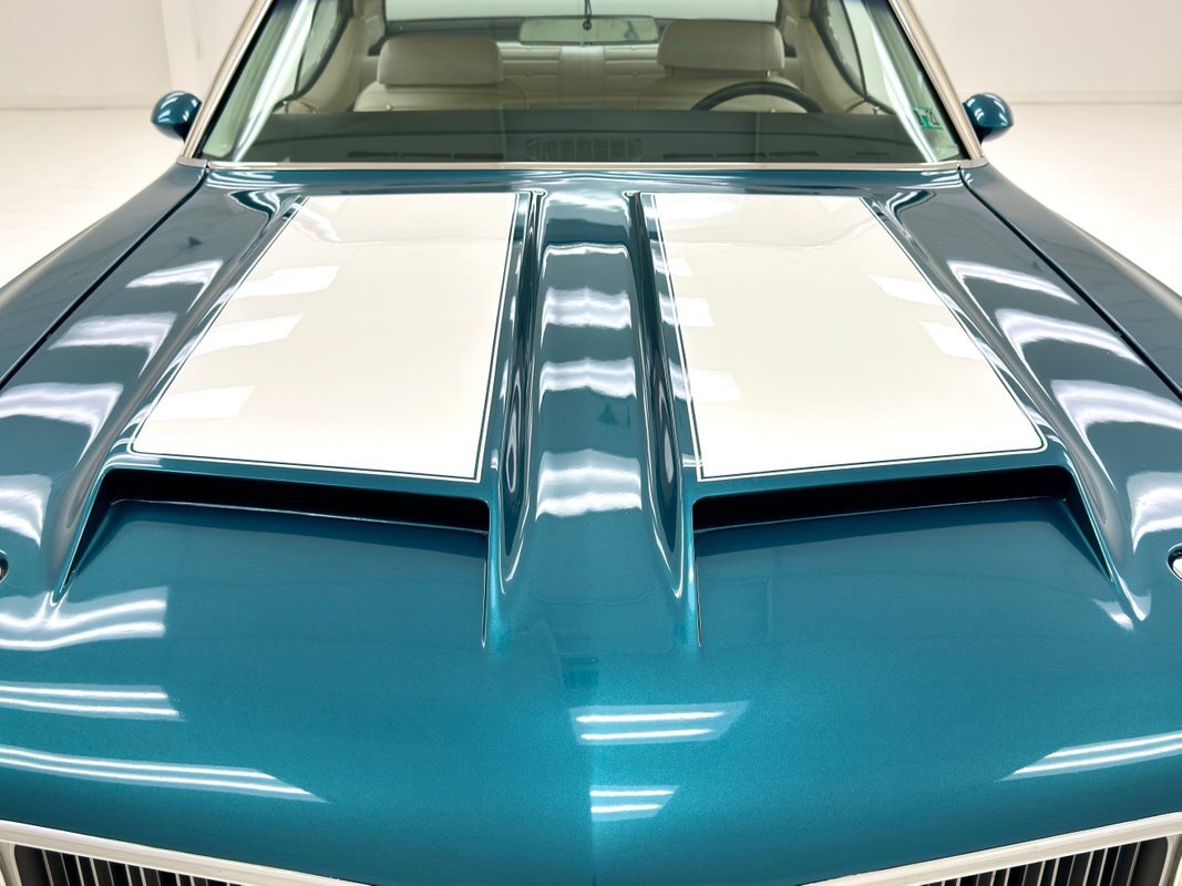 The Aegean sea is an arm of the Mediterranean and forms a bay where beautiful blue water exists off the coast of Greece, and it is for this body of water that Aegean Aqua was selected as the name of the paint that covers this car in two stage beauty. It is, of course, accented by some white highlights as a 442 and that includes white stripes on the W25 twin raised hood scoops, a thin white stripe that rides over the wheel openings and goes from the nose to the tail, and a bright white vinyl top that underlines the C-pillar just over slight fender bulges in the rear. Pairings are common on the car and includes twin headlights on each side, two hood pins, the rectangular hood scoops, a split grille with mirror image sides, sport mirrors color keyed to the body, taillights that have twin vertical bars, and twin trumpet exhaust tips. The chrome and paint on this car are nearly impeccable are the glass, top, and panel gaps. 14-inch Oldsmobile Super Stock II wheels are clean and wear 225/70R14 tires with an early 2020 manufacturing date. The only imperfection we note is a small scratch on the rocker panel below a door. As Porky Pig would say, that's all, folks!