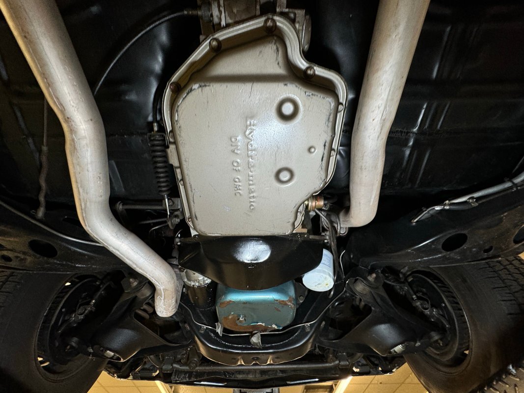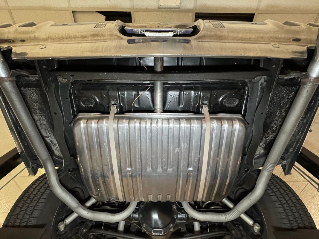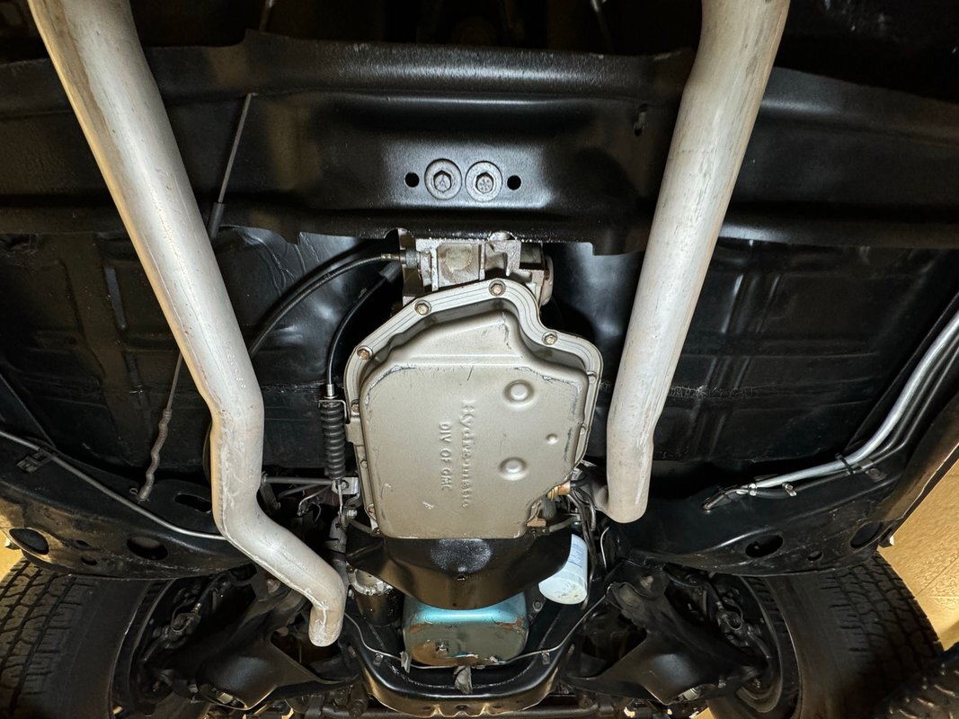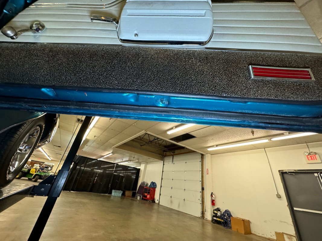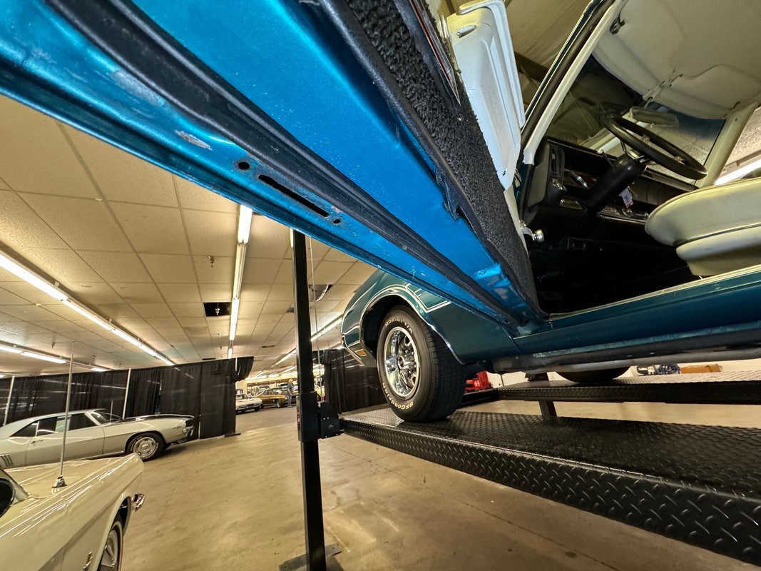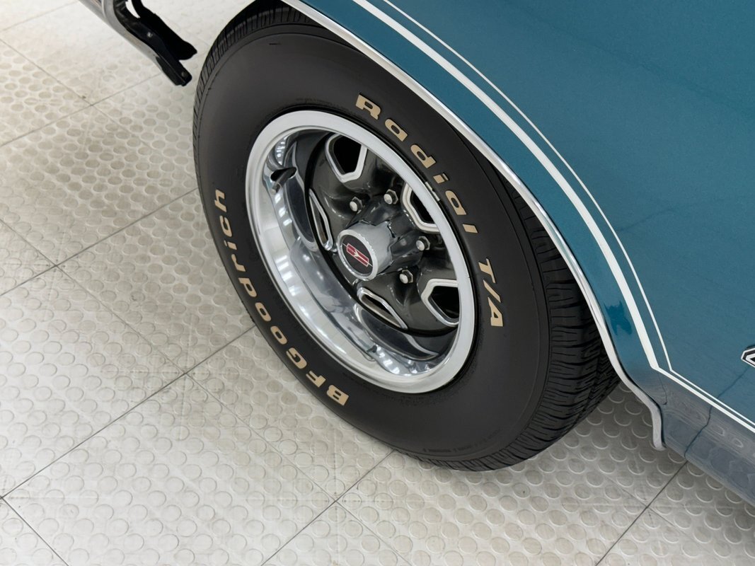 Twist the pins and pop the hood and we're impressed with the very clean numbers matching 455ci V8 with a W30 cam inside and a Holley 4-barrel carburetor on top. The original Rochester Quadrajet will come with the car. Grabbing that power and sending it to the rear 12 bolt is the numbers matching TH400 3-speed automatic transmission. Brakes on board are drums at each corner. UndercarriageSuper clean on the bottom side with a lack of surface rust, road dirt, grease build up, and errant fluids. Suspension consists of coil springs up front and a 4 link with coil springs in the back. The dual exhaust encounters a pair of stainless Borla mufflers before trumpeting out the back.