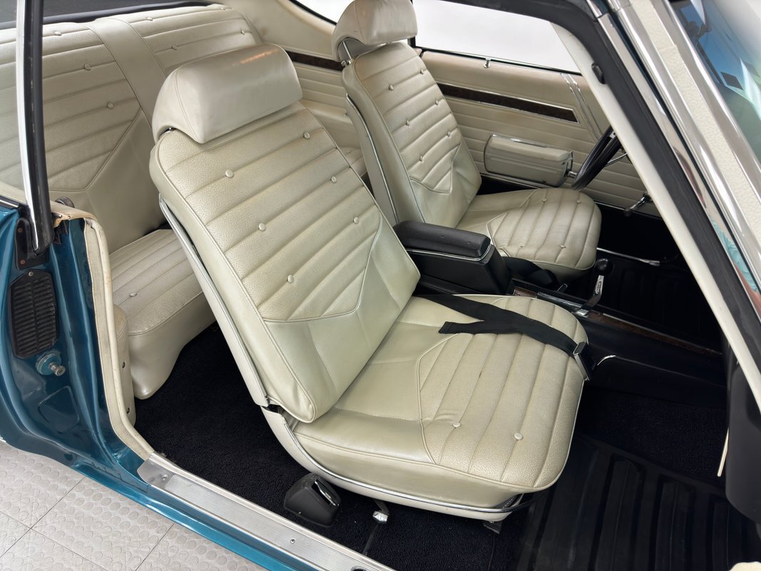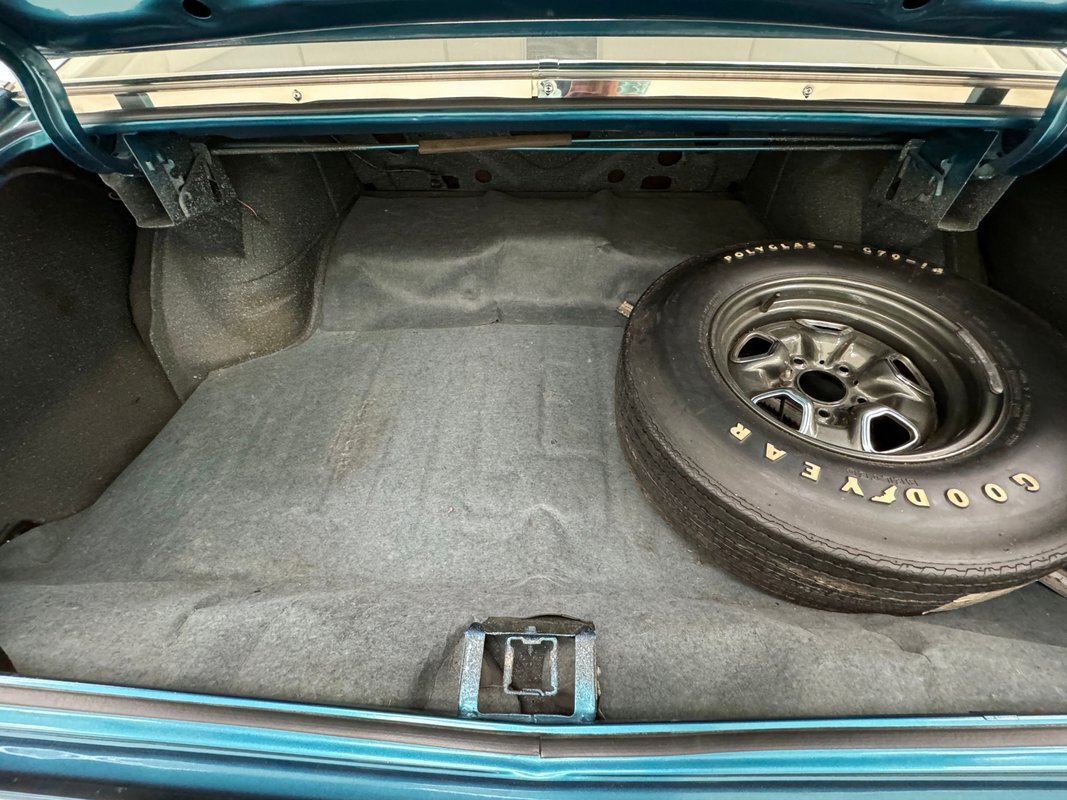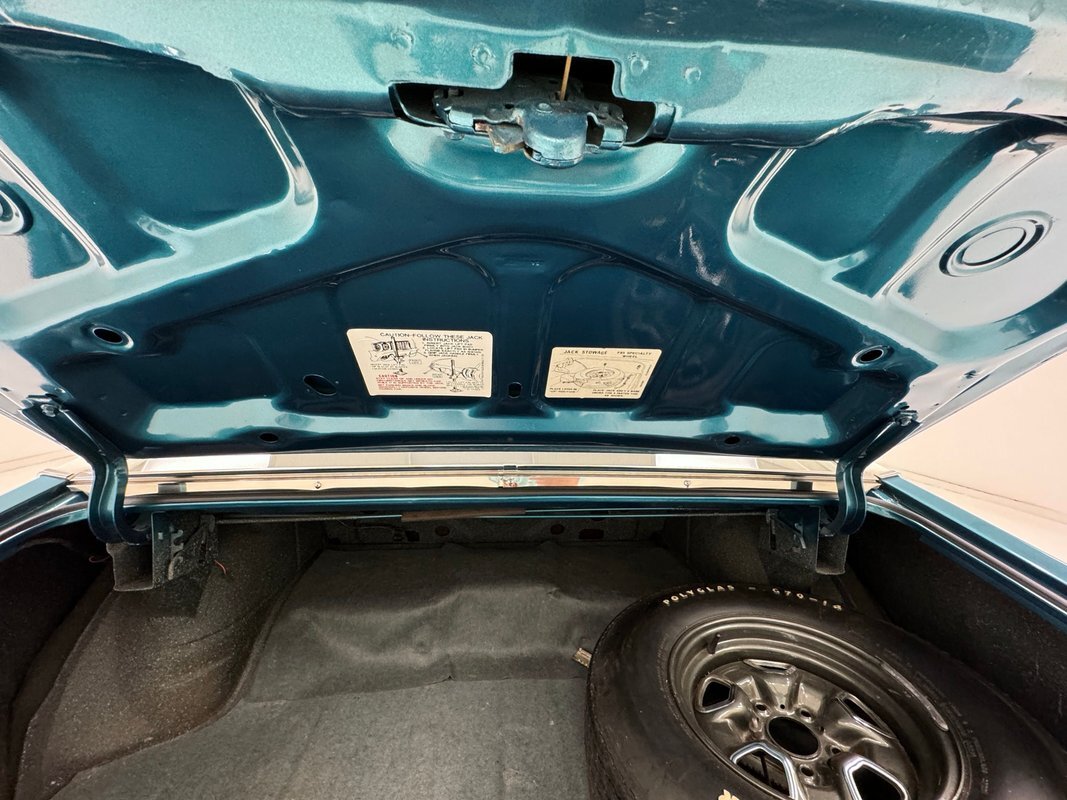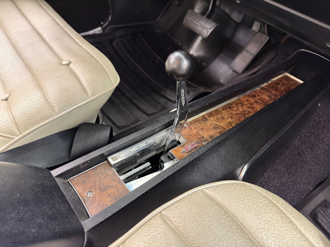Ivory is the color of choice on the interior, and it starts with vinyl door panels that show a bit of patina and some uneven coloring but remain handsome with a burlwood wood grain strip and carpeted lowers. Front bucket seats utilize the ivory vinyl in an elegant design with button backs and tuck and roll patterning over smooth panels. Again, a touch of patina with some minor creases are noted on the driver's seat but no tears or wear through. The rear seats mirror the design and carry on the door pattern on the side walls, adding an ashtray to the side armrests. An X is formed by the spokes of the sport steering wheel and it leads to a very simple gauge cluster embedded on burlwood wood grain trim and includes a clock in the center of the tachometer is a clever bit of dual purpose usage. Burlwood applique covers the lower dash as well which houses the climate controls and the AM/FM radio. In the center console, the famed Dual Gate shifter, often called "his and hers" and allows for manual and automatic operation, topped by a pewter knobbed Hurst stick. Black loop carpet is on the floor protected by vintage looking rubber mats that accommodate the high beam foot switch. The ivory headliner is in very good condition and the trunk is relatively clean, lined with a gray mat and housing a spare on a Super Stock wheel.