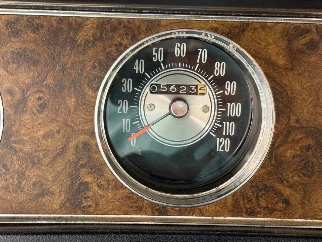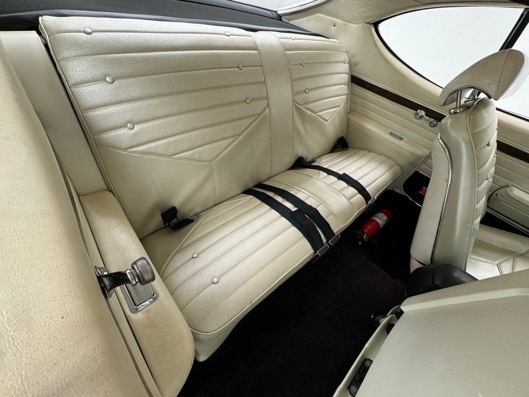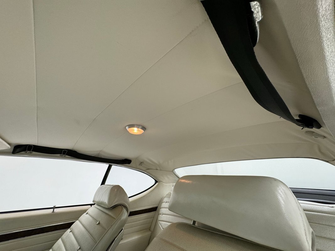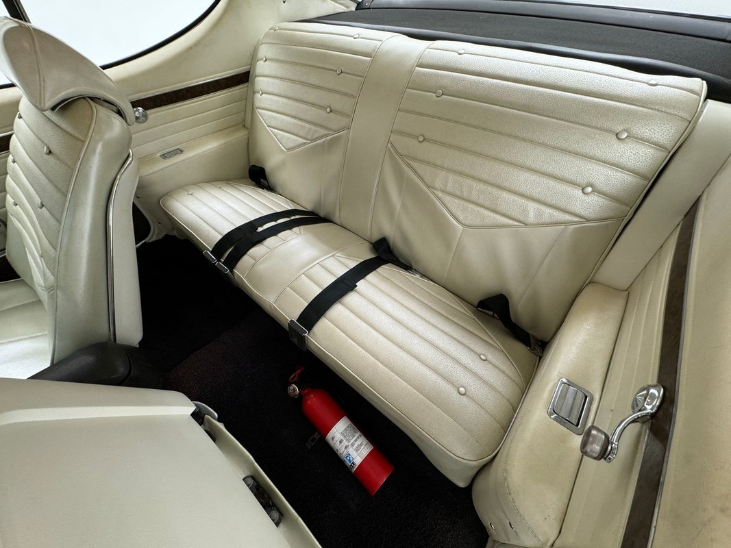 Ivory is the color of choice on the interior, and it starts with vinyl door panels that show a bit of patina and some uneven coloring but remain handsome with a burlwood wood grain strip and carpeted lowers. Front bucket seats utilize the ivory vinyl in an elegant design with button backs and tuck and roll patterning over smooth panels. Again, a touch of patina with some minor creases are noted on the driver's seat but no tears or wear through. The rear seats mirror the design and carry on the door pattern on the side walls, adding an ashtray to the side armrests. An X is formed by the spokes of the sport steering wheel and it leads to a very simple gauge cluster embedded on burlwood wood grain trim and includes a clock in the center of the tachometer is a clever bit of dual purpose usage. Burlwood applique covers the lower dash as well which houses the climate controls and the AM/FM radio. In the center console, the famed Dual Gate shifter, often called "his and hers" and allows for manual and automatic operation, topped by a pewter knobbed Hurst stick. Black loop carpet is on the floor protected by vintage looking rubber mats that accommodate the high beam foot switch. The ivory headliner is in very good condition and the trunk is relatively clean, lined with a gray mat and housing a spare on a Super Stock wheel.