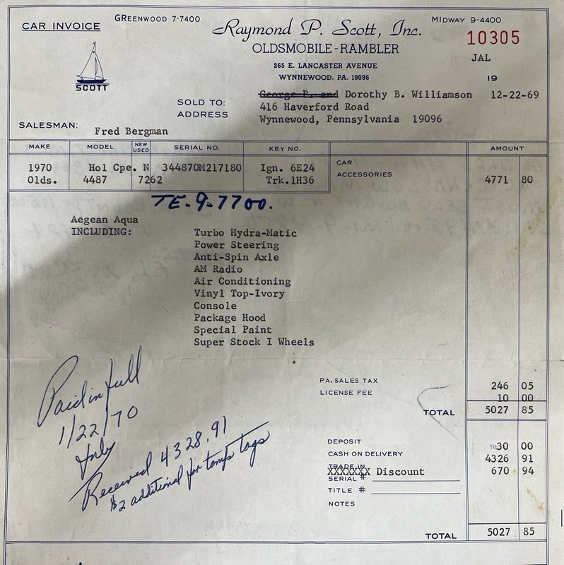 For consignment, a 1970 Oldsmobile 442 hardtop with a numbers matching drivetrain that includes the engine and transmission. If you have a Chilton's manual for 1970-1987 Cutlass RWD, this car is on the cover of the book as it was selected by Chilton after it had appeared and won several car shows.