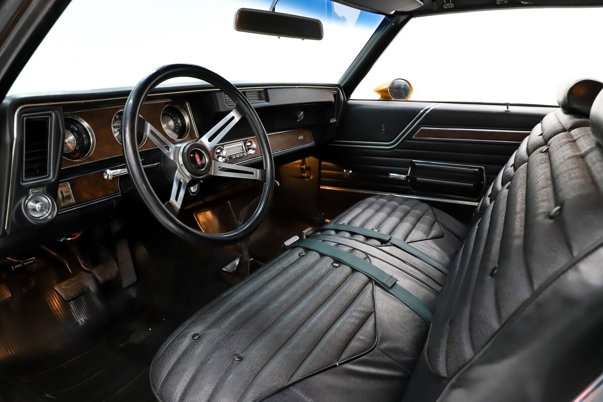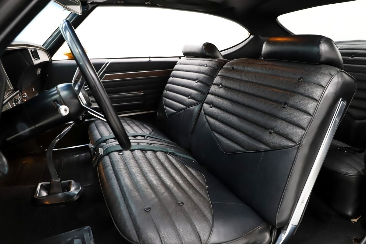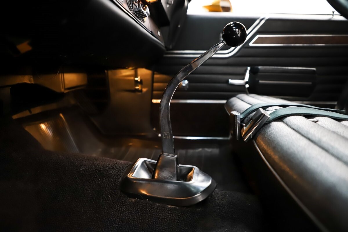 INTERIOR: All original interior and it looks close to new! All the upholstery, door panels, carpet, headliner are original and still looks great. The dash area is mint- knobs, heater controls, lenses, vents etc. He did not order gauges because he preferred his own. You can see the indentation on the dash from his tachometer. It has the lamp group, original mats, vanity mirror and a sport wheel. He also ordered power windows. The seatbelts, visors, rear shelf are mint. Original Hurst shifter for a bench seat.
