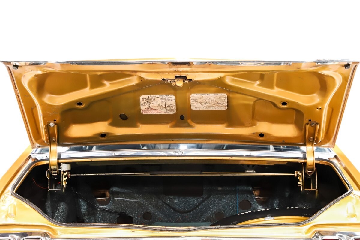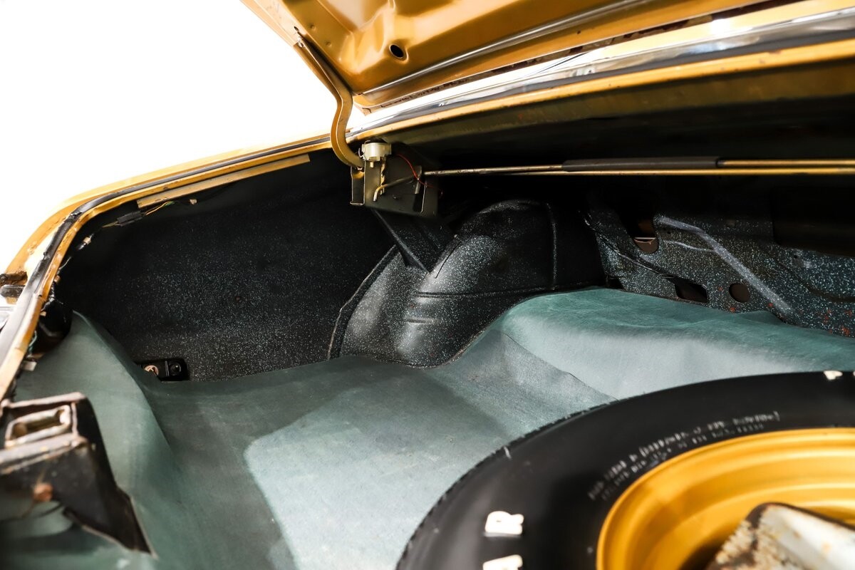 TRUNK COMPARTMENT: Completely original spatter paint in mint shape. Under the trunk lid is original paint and decals. Original spare and jack assembly. Original weatherstrip with the paint marking at the top for the assembly line worker. It has a working trunk light, reproduction mat.