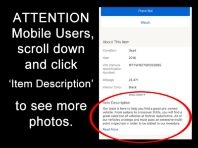 All sales transactions must be completed within 7 calendar days of auction close. Prices subject to change without notice and do not include Title, License, Registration Fees, State or Local Taxes or Processing Fees, if any. Please contact seller first for vehicle availability. Although every effort is made to present accurate and reliable information, use of this information is voluntary, and should only be deemed reliable after an independent review of its accuracy, completeness, and timeliness. It is the sole responsibility of the customer to verify the existence of options, accessories and the vehicle condition before time of sale. Any and all differences must be addressed prior to time of sale. No expressed or implied warranties, including the availability or condition of the equipment listed is made. EPA mileage estimates for comparison purposes only. Actual mileage may vary depending on driving conditions, driving habits, and vehicle maintenance.