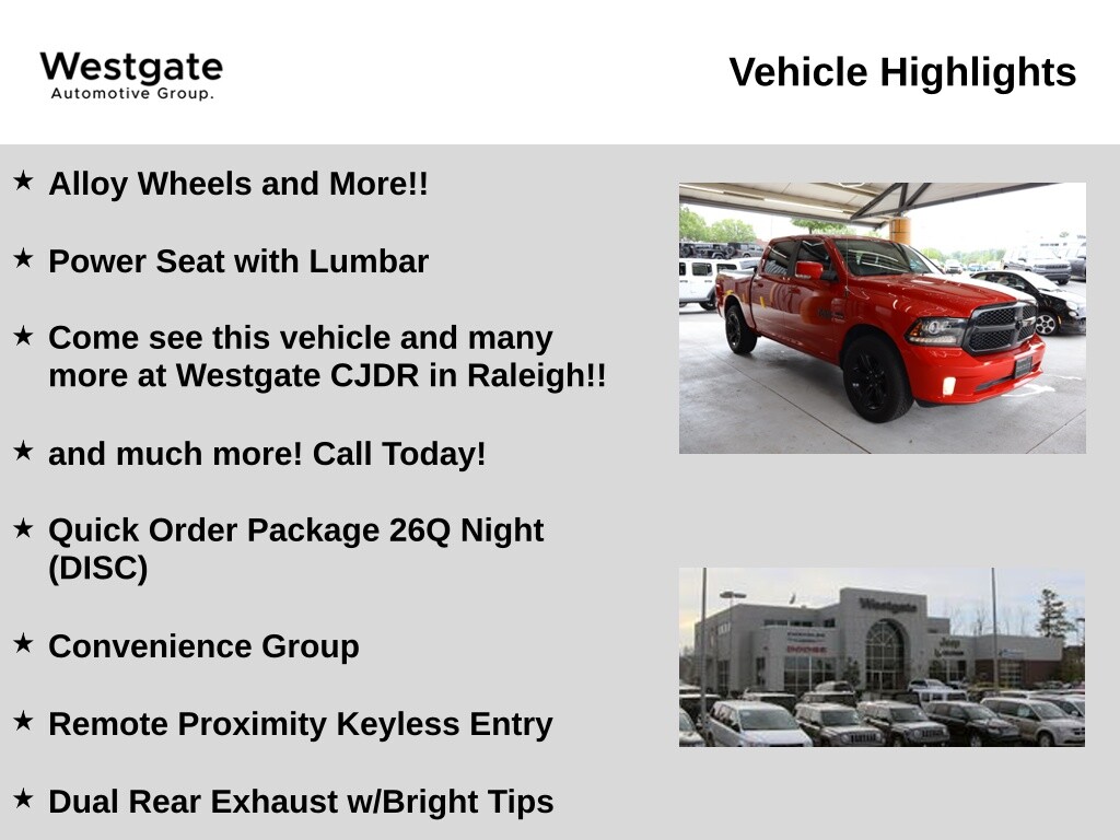 Clean CARFAX. Alloy Wheels and More!!, Power Seat with Lumbar, Come see this vehicle and many more at Westgate CJDR in Raleigh!!, and much more! Call Today!, 4x4 Flat Black Badge, Auto High Beam Headlamp Control, Black Exterior Truck Badging, Black Painted Honeycomb Grille, Black Ram Head Tailgate Badge, Black Ram Tailgate Nameplate, Center Hub, Convenience Group, Dual Rear Exhaust w/Bright Tips, Flat Black 5.7L Hemi Badge, Flat Black Ram 1500 Badge, Keyless Enter-N-Go, Quick Order Package 26Q Night (DISC), Rain Sensitive Windshield Wipers, Ram 1500 Night Special Edition, Remote Proximity Keyless Entry, Wheels: 20 x 9 Semi-Gloss Black Aluminum.