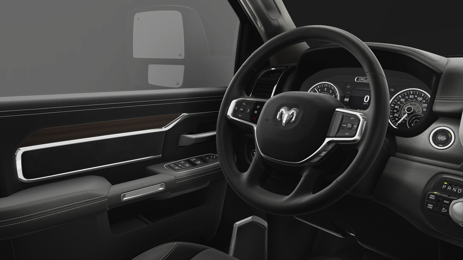 Quick Order Package 2GH Laramie. Off Road Package. Sport Appearance Package: Body Color Grille Surround; Black Interior Accents; Sport Performance Hood; Sport Decal; 20'' X 8.0'' Polished Aluminum Wheels; ParkSense Front/rear Park Assist System. Laramie Level B Equipment Group: Google Android Auto; SiriusXM Radio Service; Blind Spot and Cross Path Detection; LED Tail Lamps; Power Adjustable Pedals with Memory; For Details. Visit ; For More Info. Call 800-643-2112; Integrated Voice Command with Bluetooth®; 12'' Touchscreen Display; Auto Power-Folding Mirrors; Front LED Fog Lamps; Mirror Running Lights; Alexa Built-In; Apple CarPlay; Power Adjustable Convex Aux Mirrors; Forward and Reverse Utility Lights; Disassociated Touchscreen Display; Ramcharger Wireless Charging Pad; Remote Tailgate Release; 17 Speaker Harman/kardon Premium Sound; Center Hub; 2nd Row in Floor Storage Bins; Rear Window Defroster; Rain Sensitive Windshield Wipers; Rear Power Sliding Window; Connectivity - US/Canada; GPS Navigation; 4G LTE Wi-Fi Hot Spot; GPS Antenna Input; Exterior Mirrors with Heating Element; Auto Dim Exterior Mirror; SiriusXM with 360L; Global Telematics Box Module; Connected Travel and Traffic Services; Heated Second Row Seats; LED Reflector Headlamps; Foam Bottle Insert (door Trim Panel); Off-Road Information Pages; Selectable Tire Fill Alert; Trailer Tow Pages; HD Radio; Uconnect 5 Navigation with 12.0'' Display Radio; Power Heated Fold Telescopic Mirrors with Memory; Exterior Mirrors with Supplemental Signals; Exterior Mirrors Courtesy Lamps; Auto High Beam Headlamp Control; Chrome Exterior Mirrors; Exterior Mirrors with Memory; Power Adjust Mirrors; Power Telescoping Mirrors; Auto Dim Exterior Passenger Mirror; Auto Adjust in Reverse Exterior Mirrors; ParkSense Front/rear Park Assist System. Chrome Bumper Package: Bright Rear Bumper; Bright Front Bumper. MOPAR Spray in Bedliner. Blind Spot and Cross Path Detection. Leather Trimmed Bucket Seats. Anti-Spin Differential Rear Axle. Tow Hooks. **Equipment listed is based on original vehicle build and subject to change. Please confirm the accuracy of the included equipment by calling the dealer prior to purchase.**