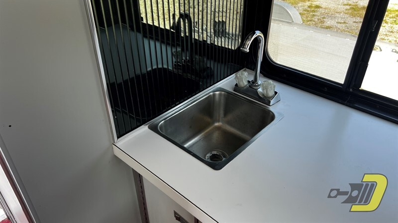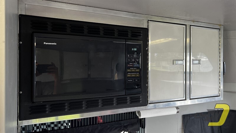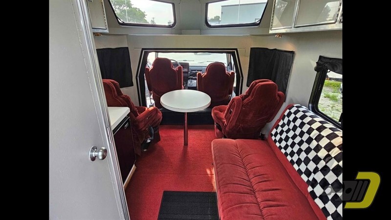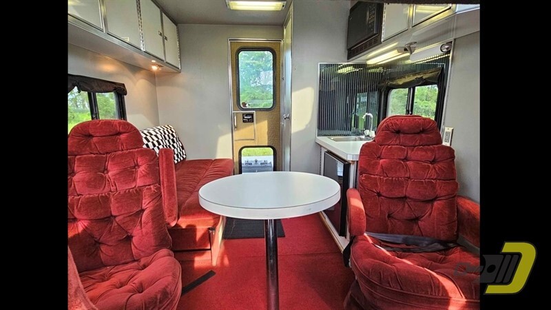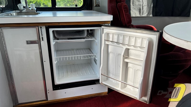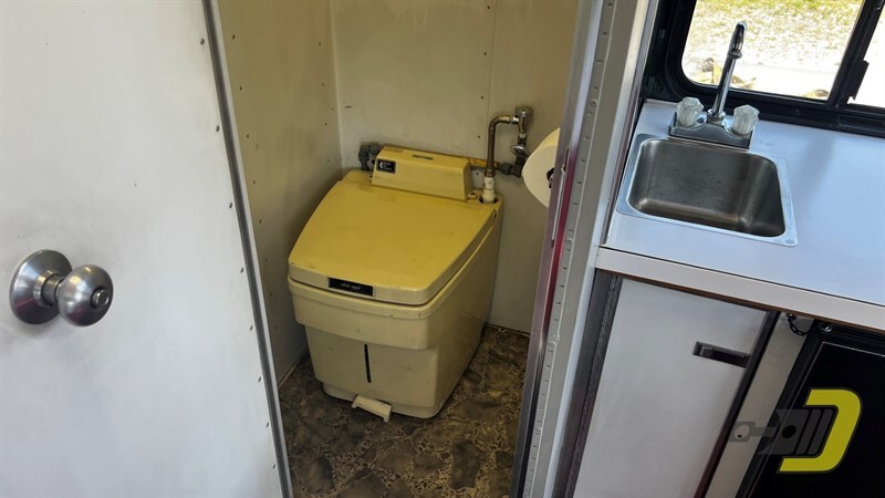 The living space was recently redone with new paint and new window treatments plus a matching partition behind the driver compartment. Up front is a removable table flanked by two rotating and locking captain’s chairs with seat belts. Further back is a couch that folds into a bed. That faces a counter section and small sink along with a refrigerator underneath and microwave above. A private half bath is at the rear of the cabin. There are two primary 12Vdc light fixtures along with many individual reading lights. There is an abundance of overhead storage as well.
