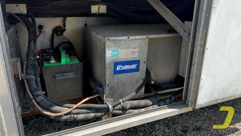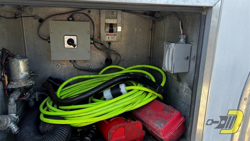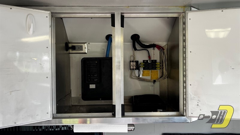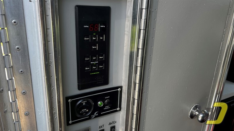 Line voltage (120Vac) is available from the on-board Onan 6.6kW diesel generator which shares the vehicle’s fuel tank. It starts easily and has local controls as well as a remote panel in the living space. A convenient 30A shore power connection is also provided along with a transfer switch. An electric Cruisair HVAC unit with an interior panel provides temperature control for the living space. Both heat and air conditioning functions work properly. An auxiliary heater using engine coolant is also present.