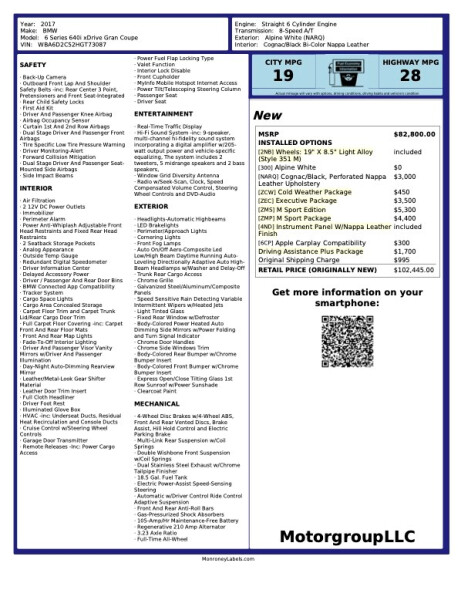 Stunning 2017 BMW 640i Drive Gran Coupe in Alpine White with Cognac and Black Leather Interior. Only two owners since new, last owner purchase with BMW Maintenance Program and didn’t miss a beat, all services complete by the Authorized BMW Dealer with attention to every detail. Remarkable condition inside and out, mechanically and cosmetically, they don’t get any nicer than this one. Only 65k miles on a 2017 ! Loaded with all the BMW amenities plus Cognac/Black, Perforated Nappa Leather Upholstery, Cold Weather Package with Heated Rear Seats and Heated Steering Wheel. Executive Package with Front Ventilated Seats Soft-Close Automatic Doors, Multi-Contour Seats, Head-Up Display, harman/kardon Surround Sound System and 4-Zone Automatic Climate Control. M Sport Edition with Wheels: 19 x 8.5 Light Alloy (Style 351M) Double-spoke , 4-Zone Automatic Climate Control, out Lines Designation Outside, Instrument Panel w/Nappa Leather Finish, Contrast Stitching, Ceramic Controls, Shadowline Exterior Trim, Front Ventilated Seats M Sport Edition (7MH) Soft-Close Automatic Doors, Increased Top Speed Limiter, M Steering Wheel, Anthracite Alcantara Headliner, Power Rear Sunshade & Rear Side Windowshades and Aerodynamic Kit, Driving Assistance Plus Package including Active Blind Spot Detection, Active Driving Assistant, Side and Top View Cameras, Speed Limit Info. All in this BMW sticker at $102,445 when it was new, TRULY a fantastic Luxury Car Buy ! Excellent financing available with approved credit.