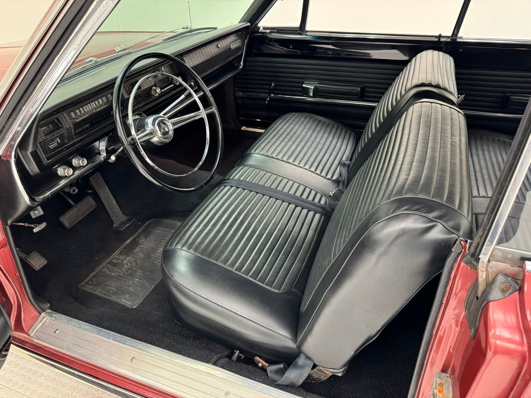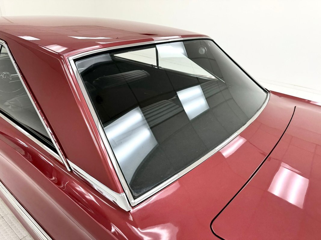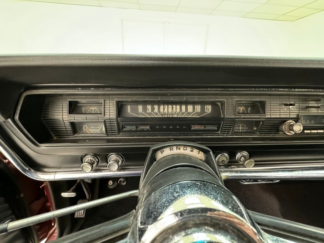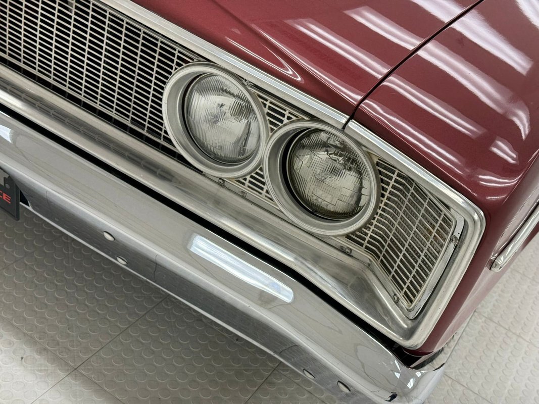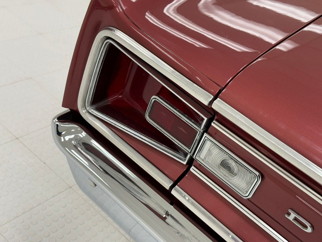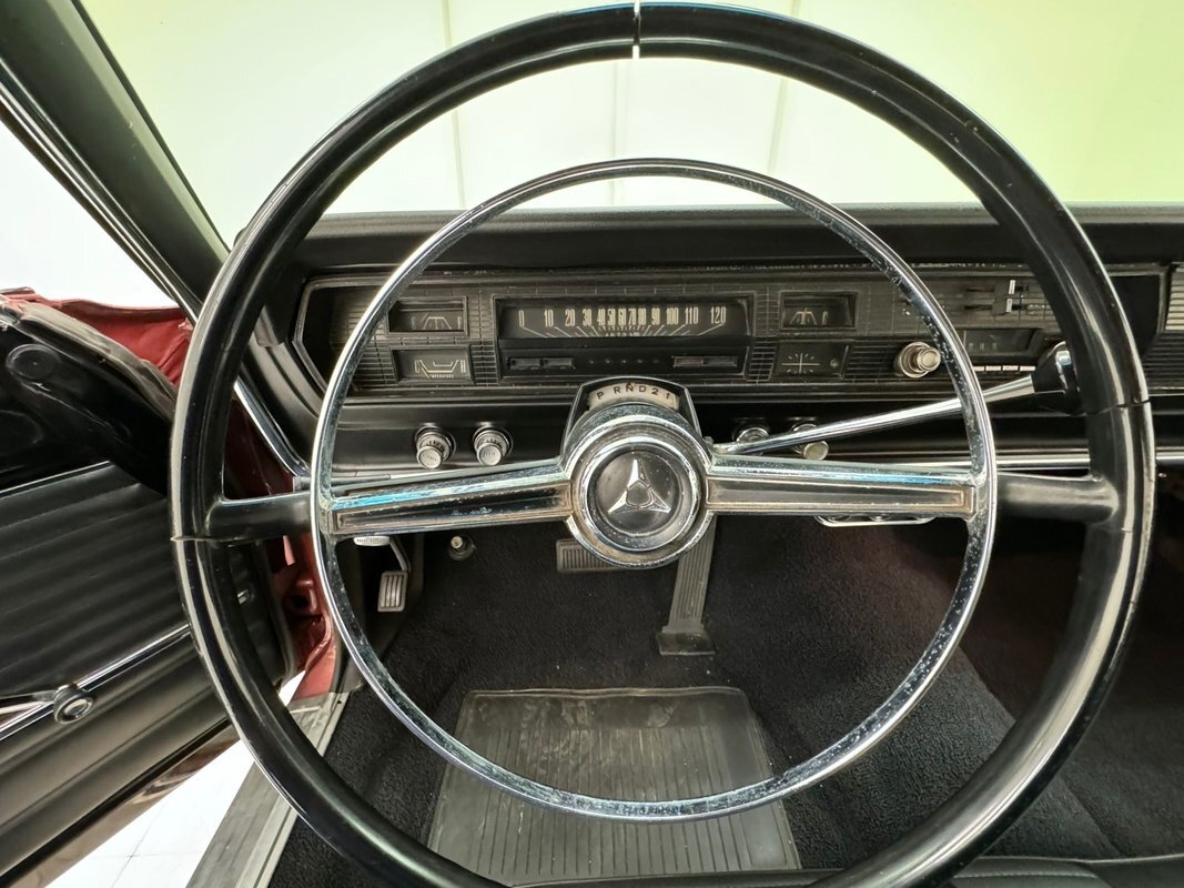 Two stage Red Metallic paint covers this car in fine fashion. It's not a flashy bright red but one that's more pedestrian brick red. In typical mid 60's fashion, the car has more right angles than a Rubic's cube and both the front and rear fascia are perfectly vertical. Four headlights are embedded in a finely grated grille that bends to meet the front fenders as they extend past the nose. The chrome bumpers and other metal work, including the window trim, mirror, side spears, and door handles, are in excellent condition. The sharply angled rear pillar is perhaps the most striking feature of the car, although the trapezoid shaped taillights are pretty amazing too. 15-inch Magnum 500 wheels are wrapped with 215/65/15 tires with a mid-2022 date code. Imperfections included paint bubbles on the decklid and an antenna base plate that is loose.