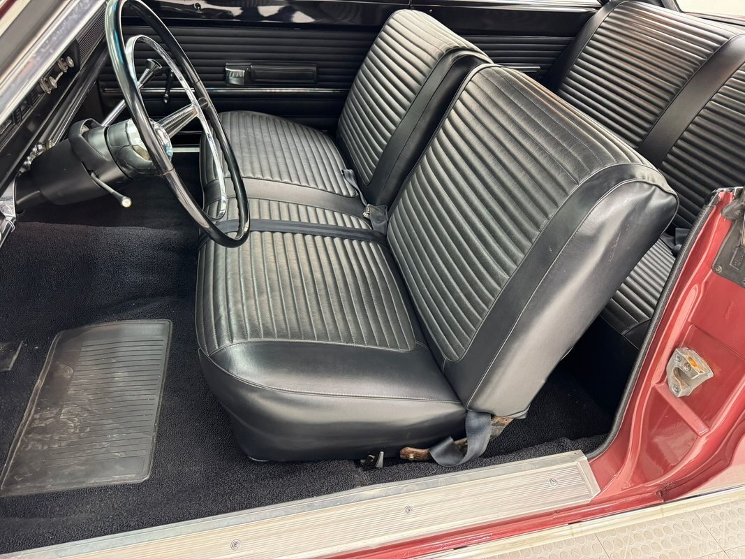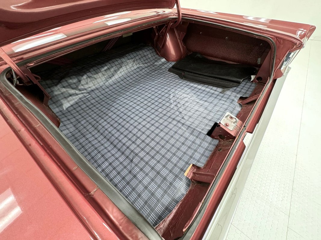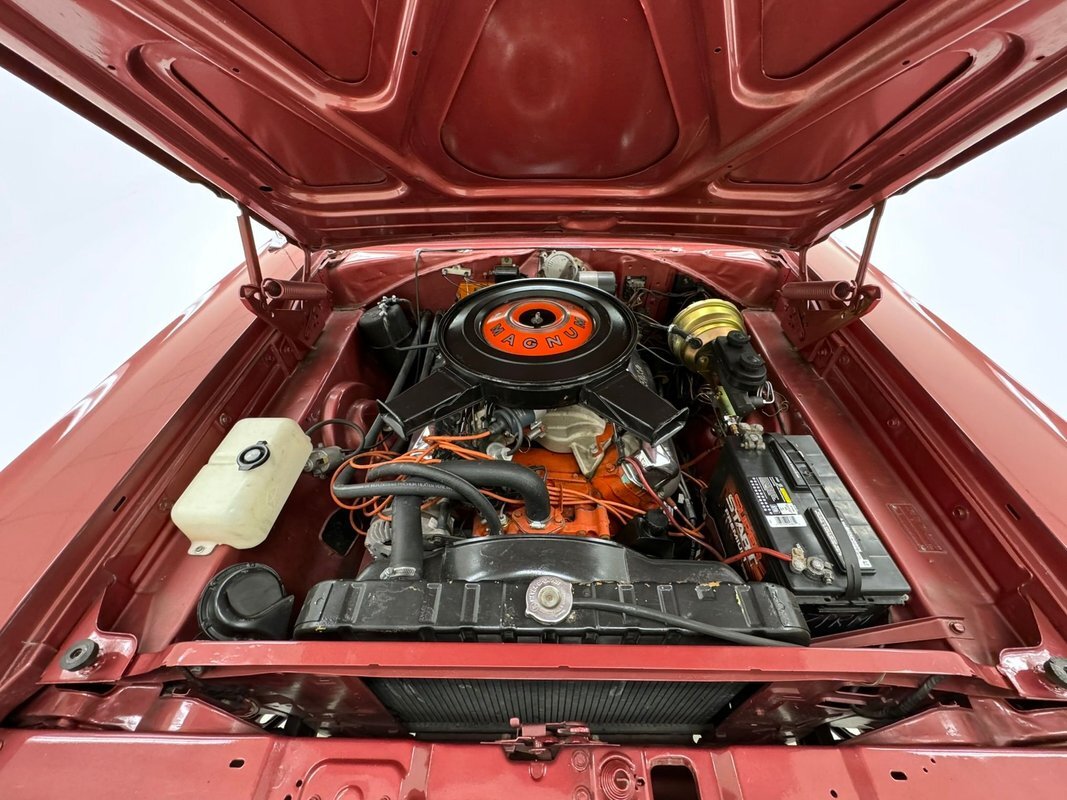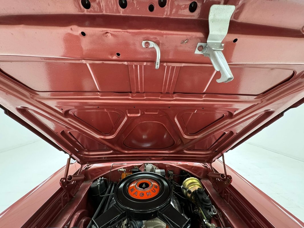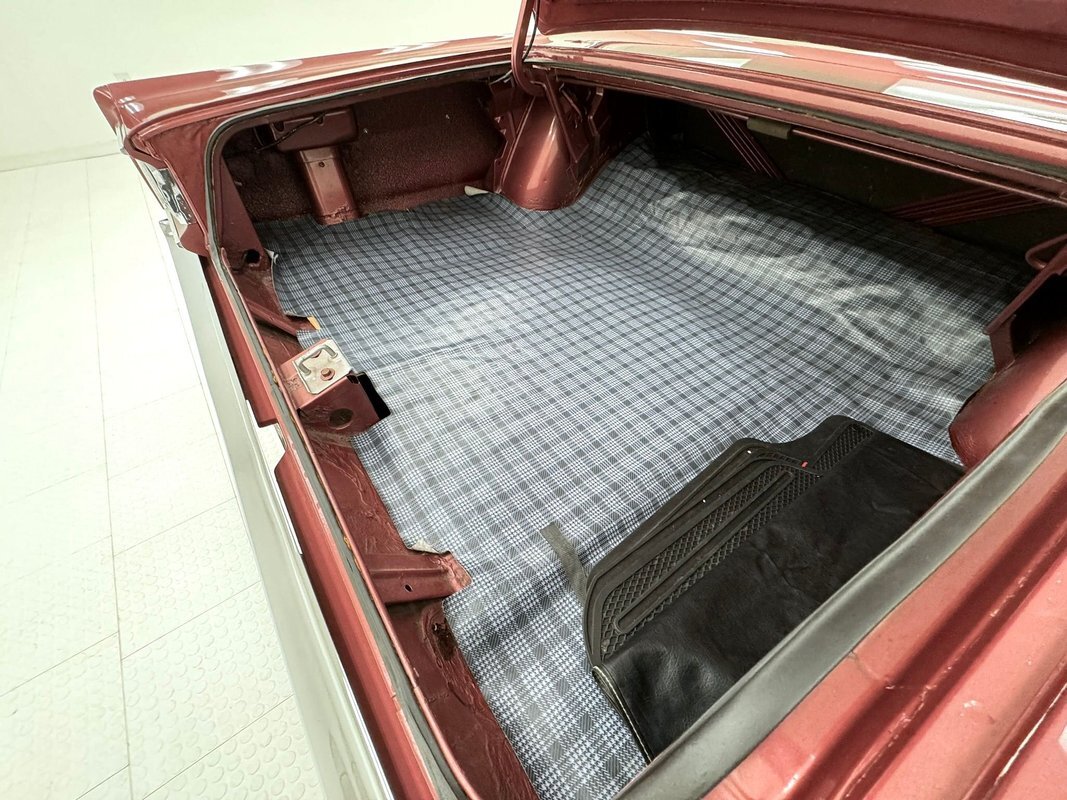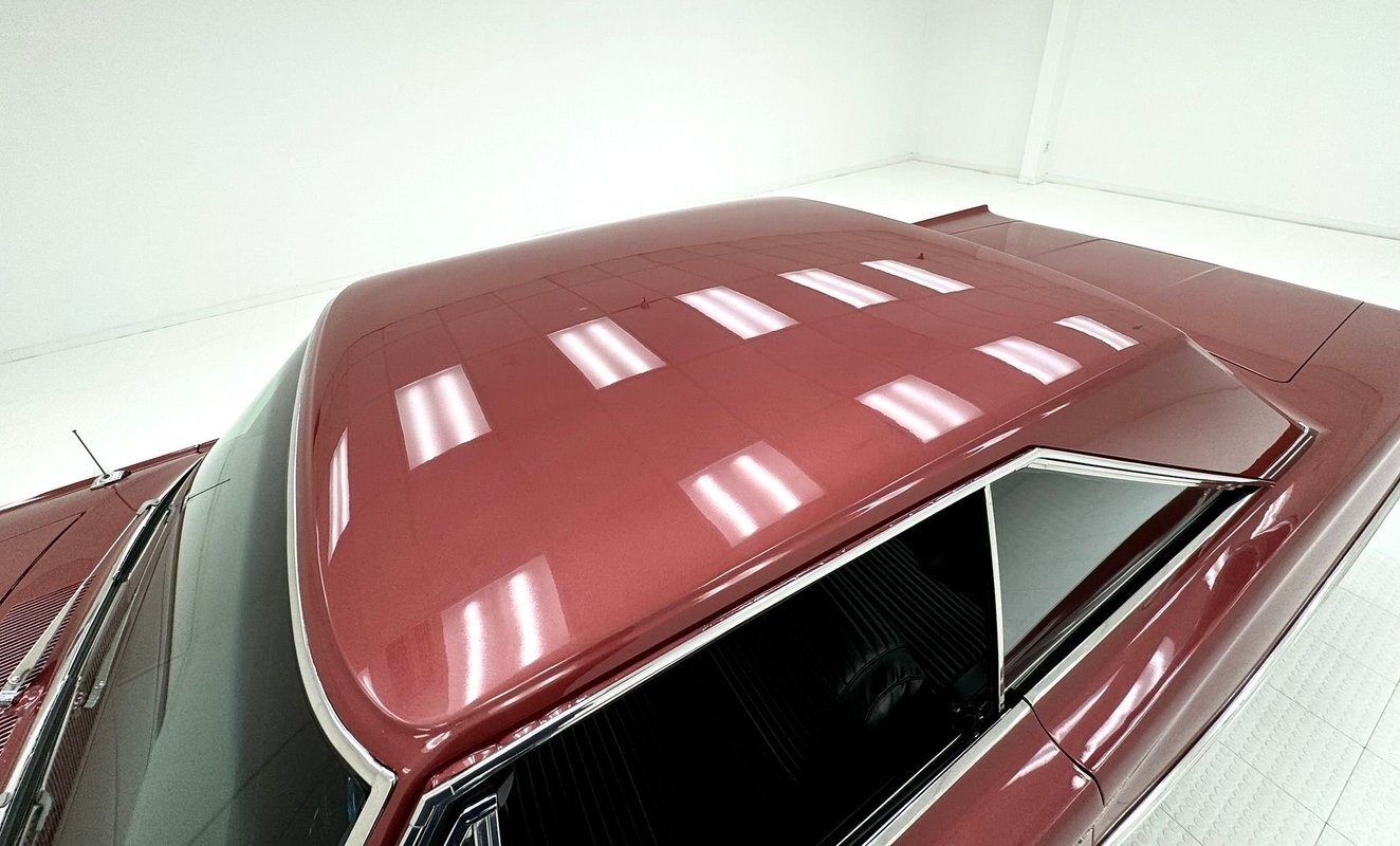Two stage Red Metallic paint covers this car in fine fashion. It's not a flashy bright red but one that's more pedestrian brick red. In typical mid 60's fashion, the car has more right angles than a Rubic's cube and both the front and rear fascia are perfectly vertical. Four headlights are embedded in a finely grated grille that bends to meet the front fenders as they extend past the nose. The chrome bumpers and other metal work, including the window trim, mirror, side spears, and door handles, are in excellent condition. The sharply angled rear pillar is perhaps the most striking feature of the car, although the trapezoid shaped taillights are pretty amazing too. 15-inch Magnum 500 wheels are wrapped with 215/65/15 tires with a mid-2022 date code. Imperfections included paint bubbles on the decklid and an antenna base plate that is loose.