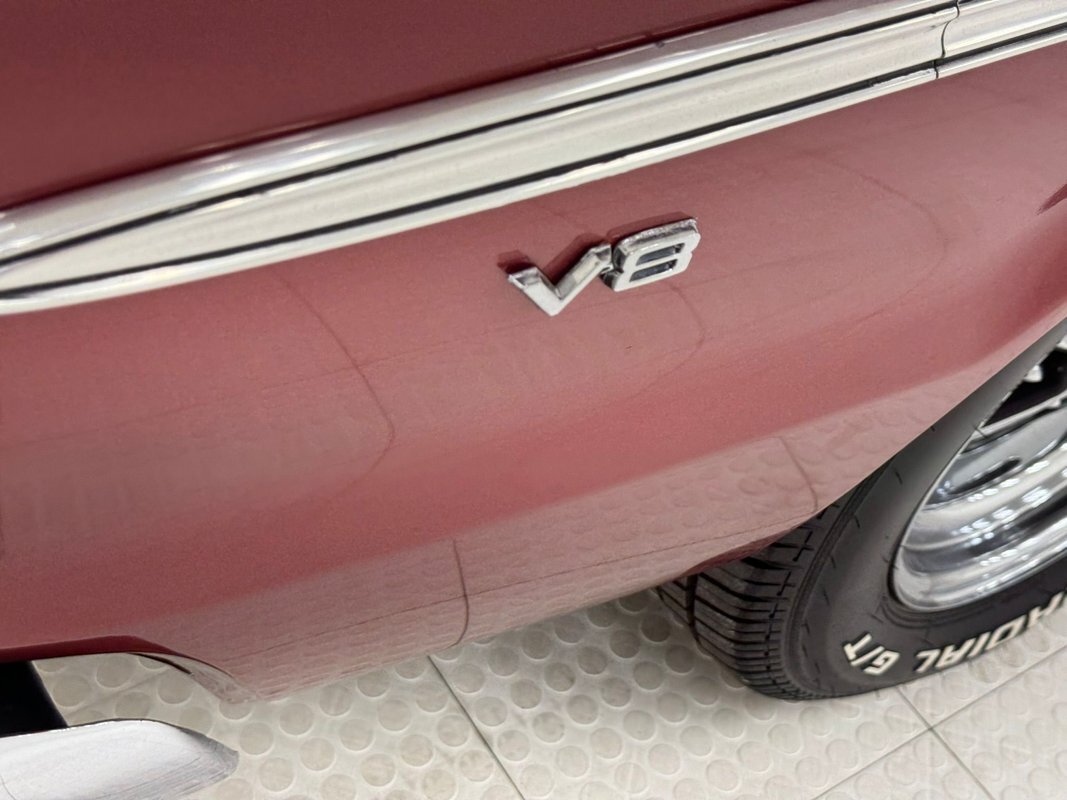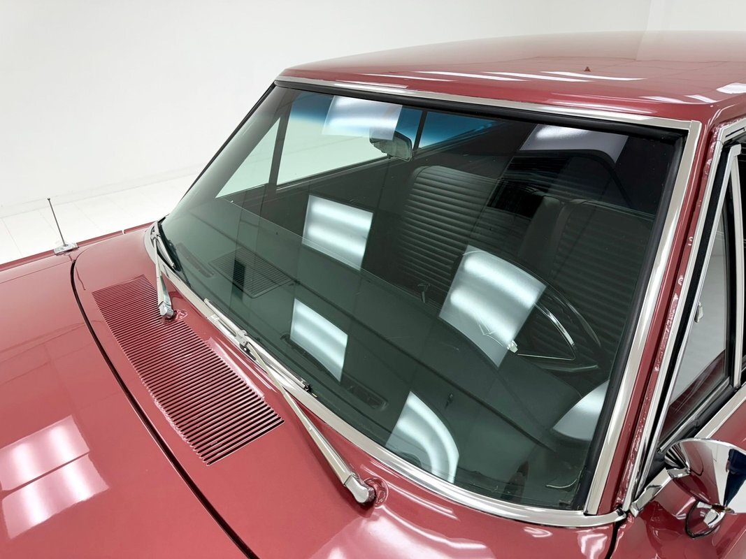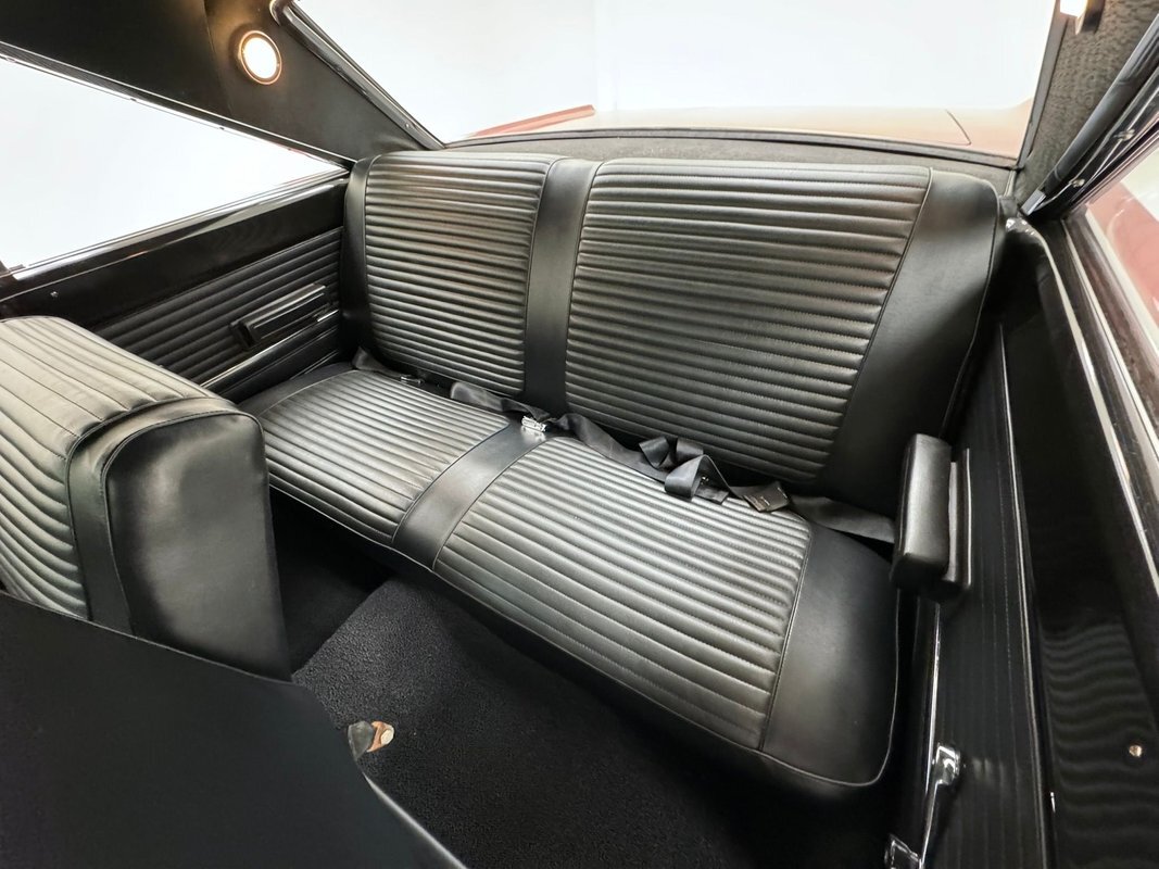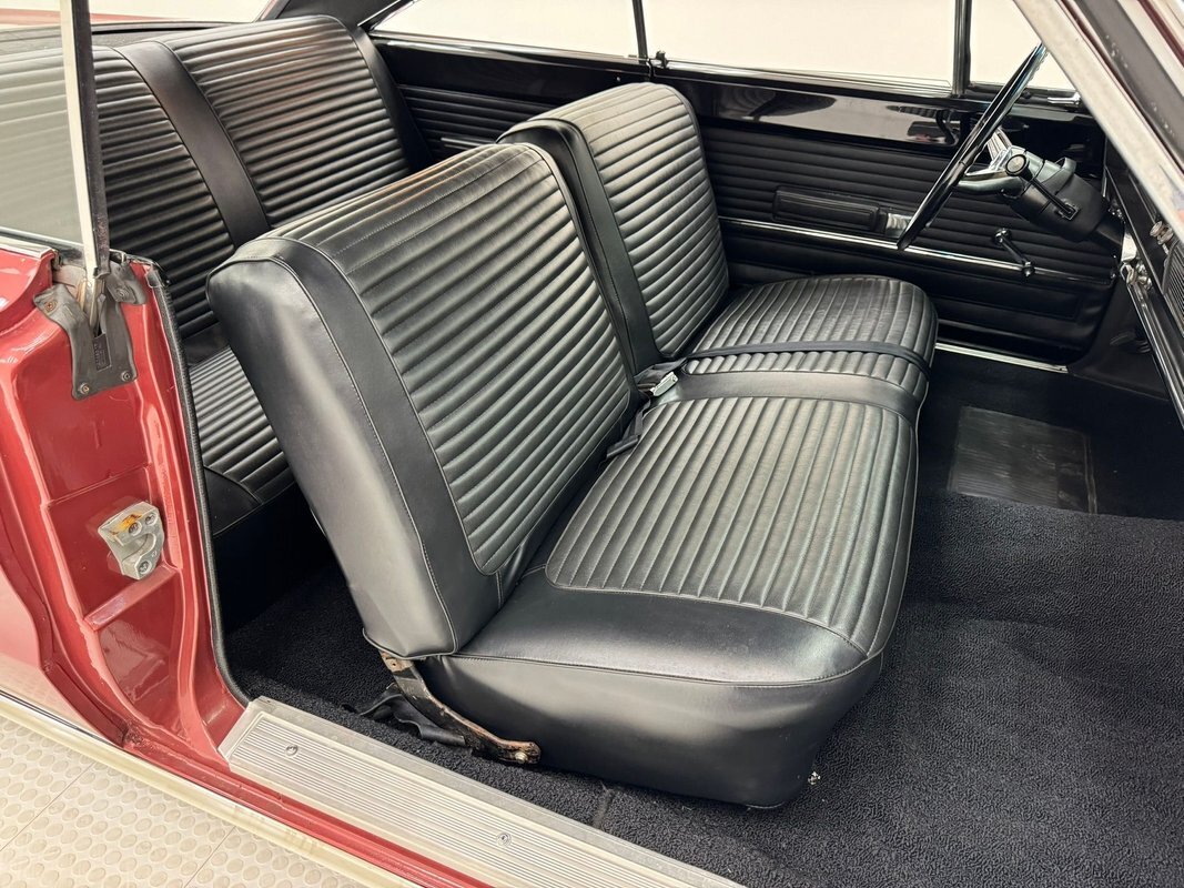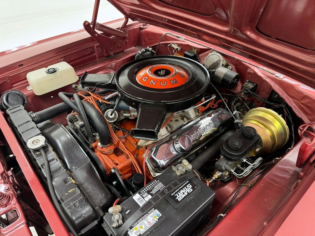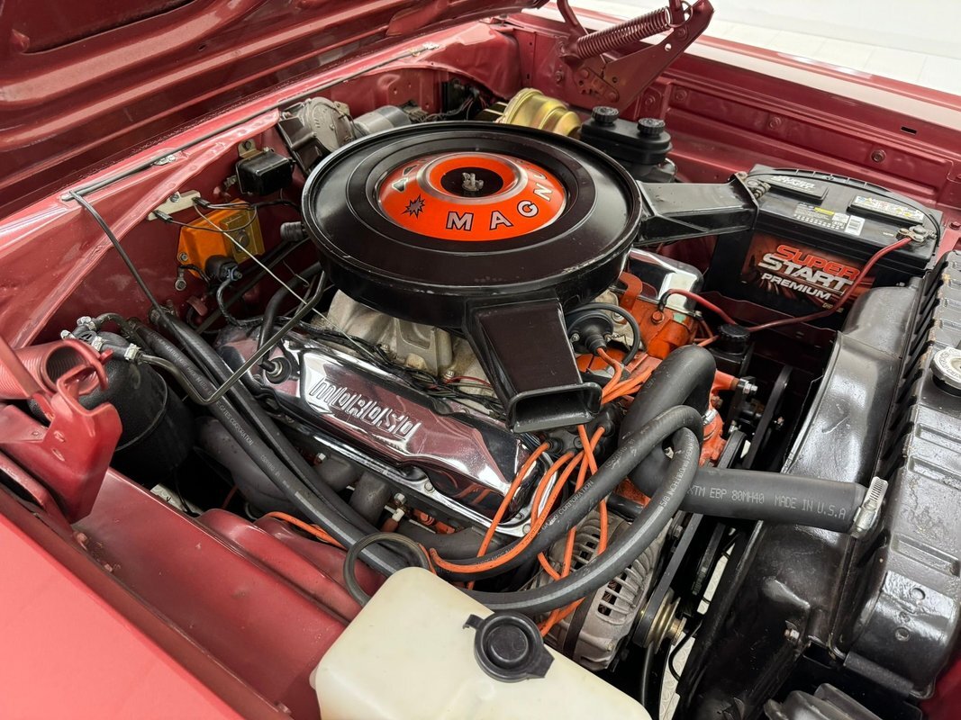 Two stage Red Metallic paint covers this car in fine fashion. It's not a flashy bright red but one that's more pedestrian brick red. In typical mid 60's fashion, the car has more right angles than a Rubic's cube and both the front and rear fascia are perfectly vertical. Four headlights are embedded in a finely grated grille that bends to meet the front fenders as they extend past the nose. The chrome bumpers and other metal work, including the window trim, mirror, side spears, and door handles, are in excellent condition. The sharply angled rear pillar is perhaps the most striking feature of the car, although the trapezoid shaped taillights are pretty amazing too. 15-inch Magnum 500 wheels are wrapped with 215/65/15 tires with a mid-2022 date code. Imperfections included paint bubbles on the decklid and an antenna base plate that is loose.