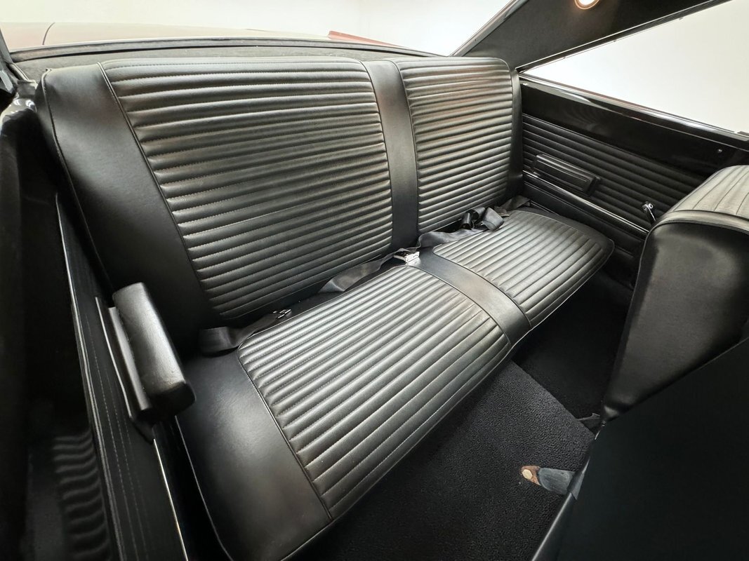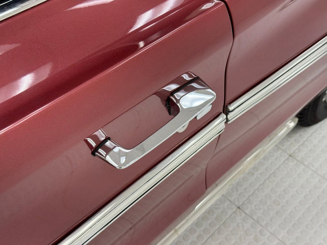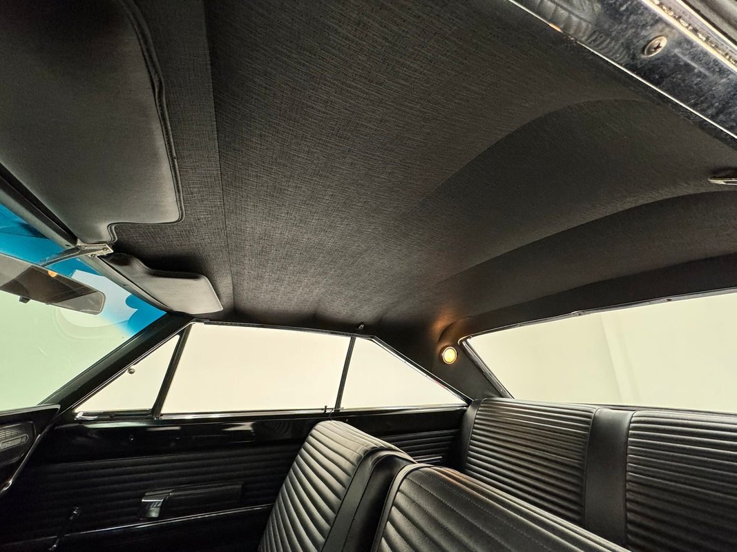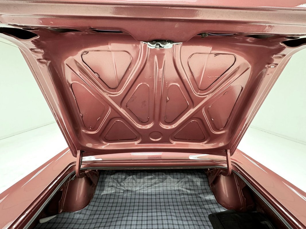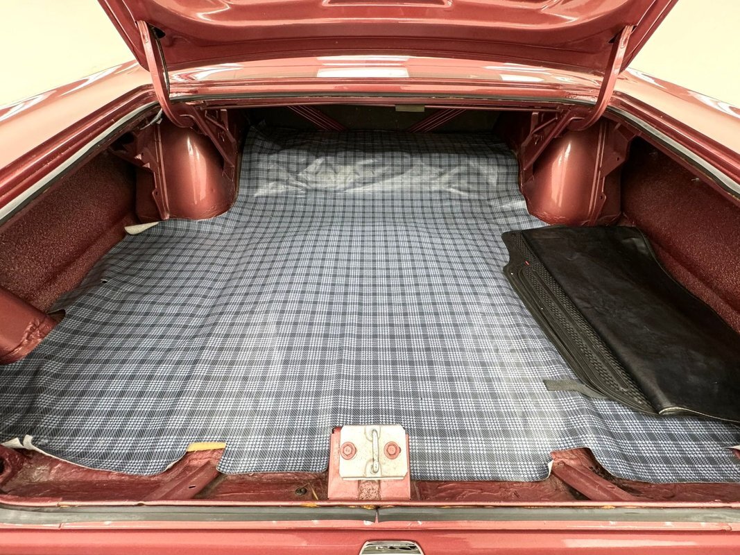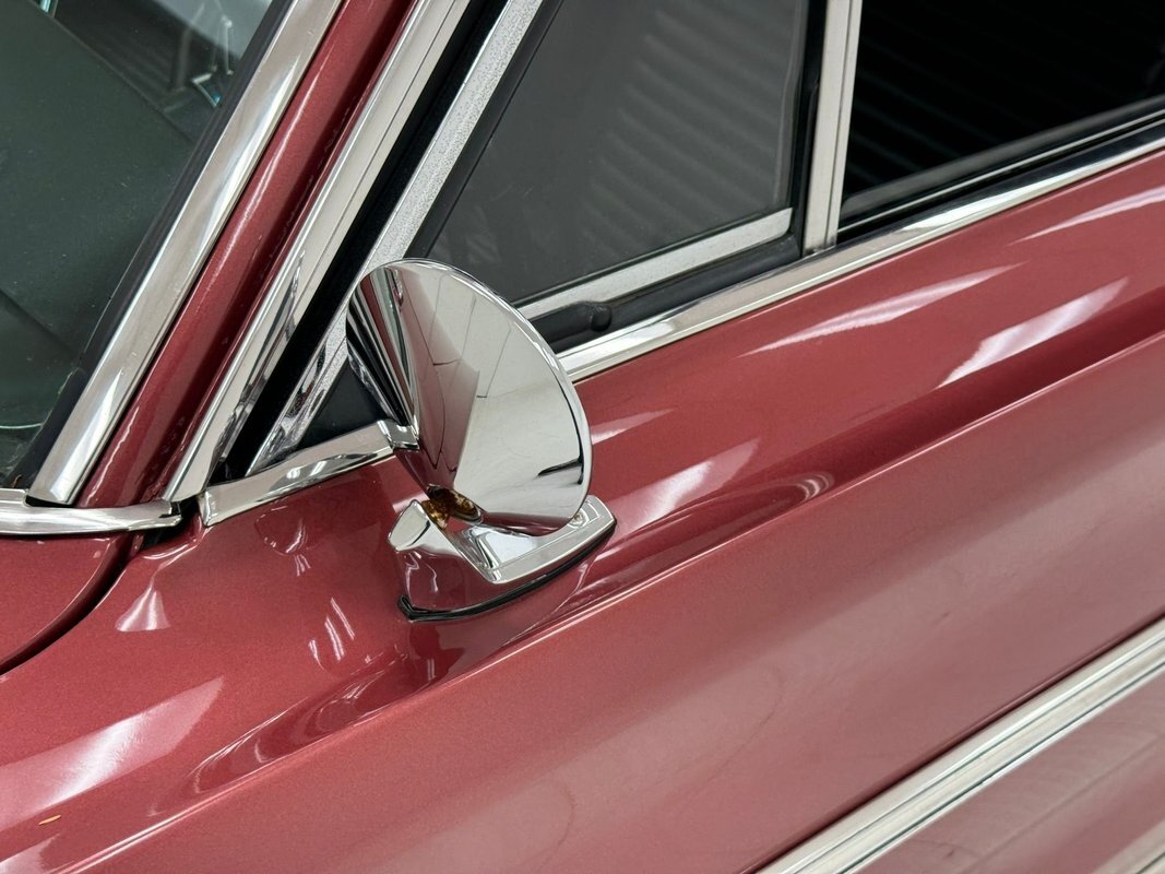 Two stage Red Metallic paint covers this car in fine fashion. It's not a flashy bright red but one that's more pedestrian brick red. In typical mid 60's fashion, the car has more right angles than a Rubic's cube and both the front and rear fascia are perfectly vertical. Four headlights are embedded in a finely grated grille that bends to meet the front fenders as they extend past the nose. The chrome bumpers and other metal work, including the window trim, mirror, side spears, and door handles, are in excellent condition. The sharply angled rear pillar is perhaps the most striking feature of the car, although the trapezoid shaped taillights are pretty amazing too. 15-inch Magnum 500 wheels are wrapped with 215/65/15 tires with a mid-2022 date code. Imperfections included paint bubbles on the decklid and an antenna base plate that is loose.