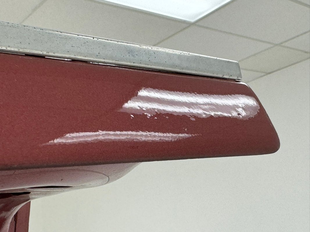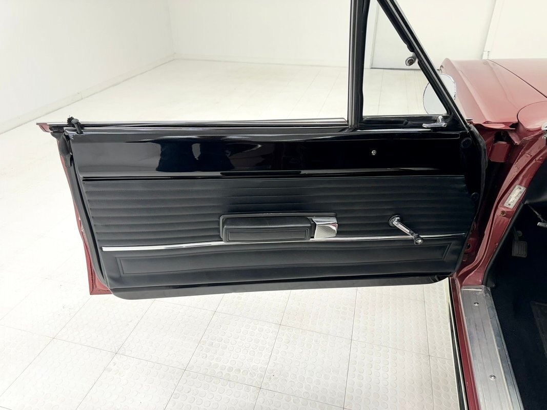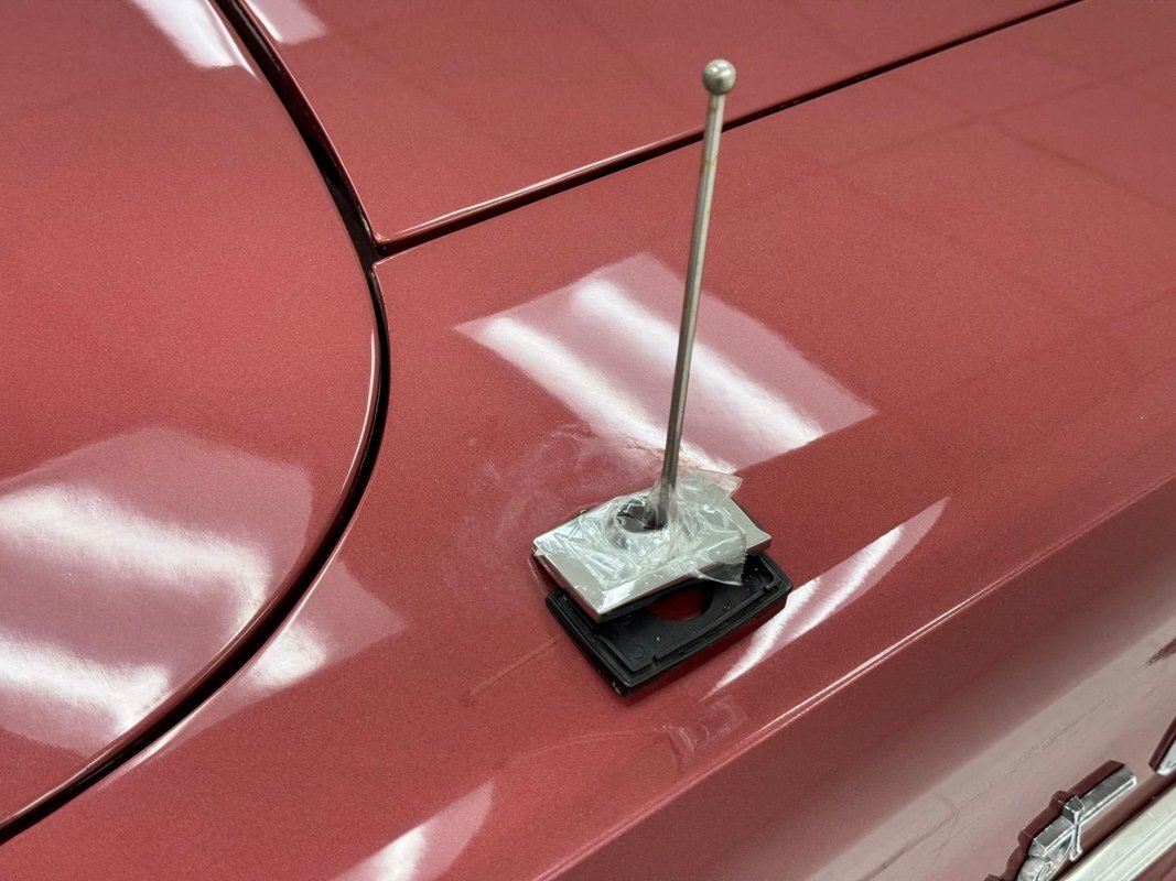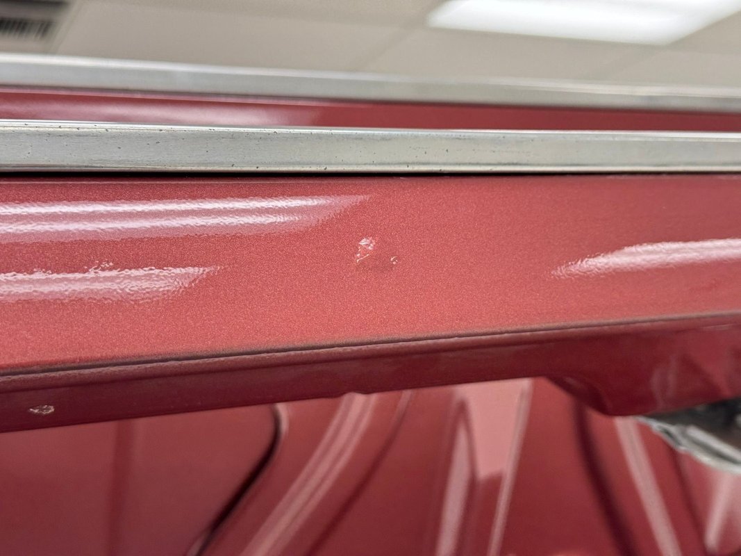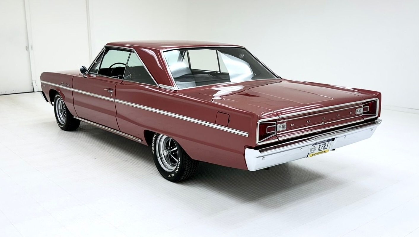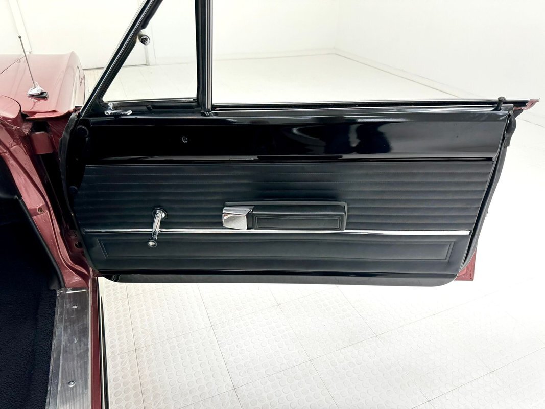 Two stage Red Metallic paint covers this car in fine fashion. It's not a flashy bright red but one that's more pedestrian brick red. In typical mid 60's fashion, the car has more right angles than a Rubic's cube and both the front and rear fascia are perfectly vertical. Four headlights are embedded in a finely grated grille that bends to meet the front fenders as they extend past the nose. The chrome bumpers and other metal work, including the window trim, mirror, side spears, and door handles, are in excellent condition. The sharply angled rear pillar is perhaps the most striking feature of the car, although the trapezoid shaped taillights are pretty amazing too. 15-inch Magnum 500 wheels are wrapped with 215/65/15 tires with a mid-2022 date code. Imperfections included paint bubbles on the decklid and an antenna base plate that is loose.