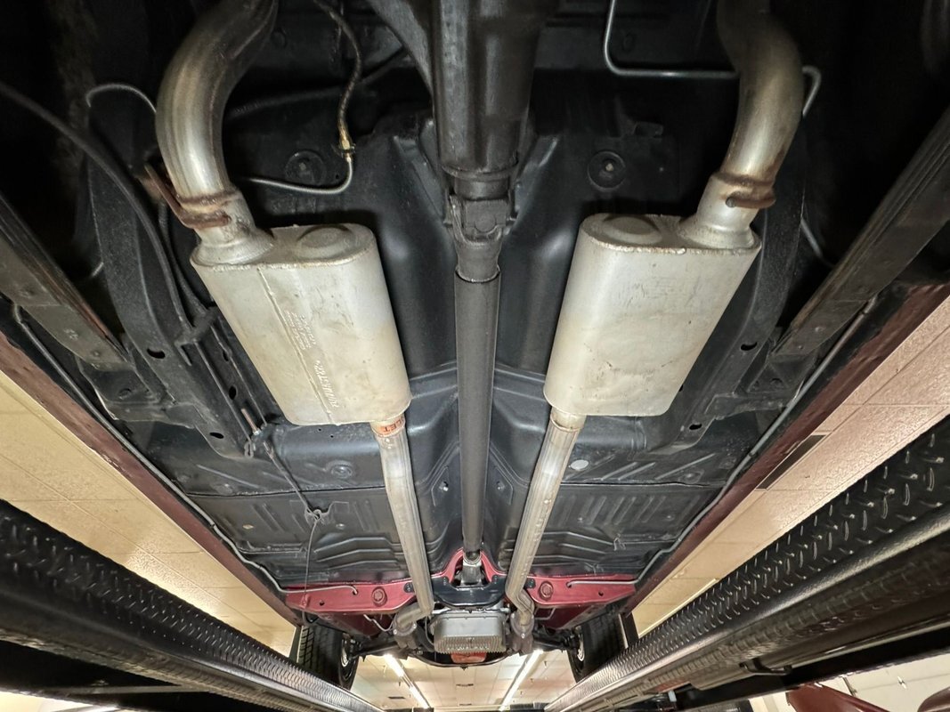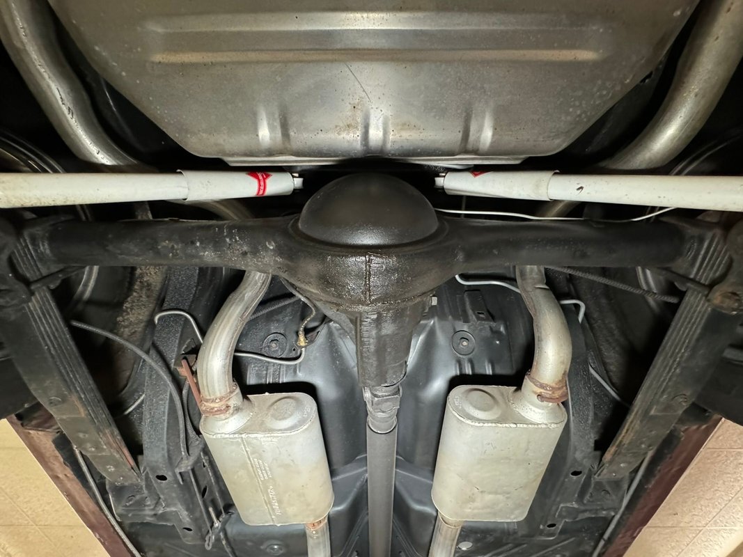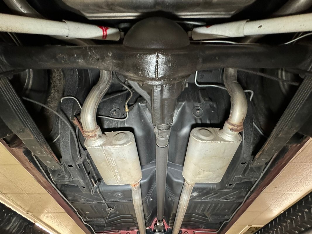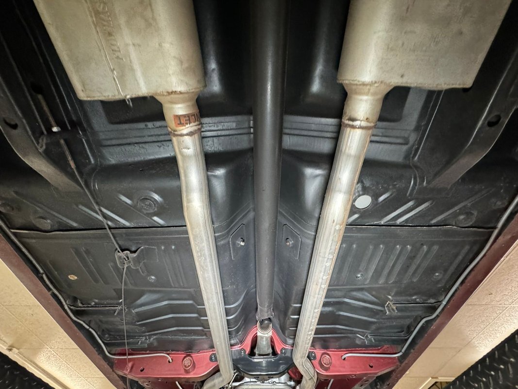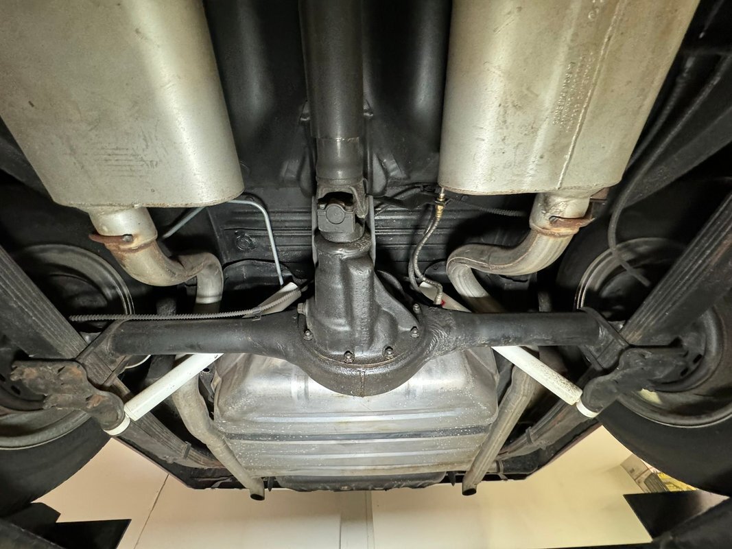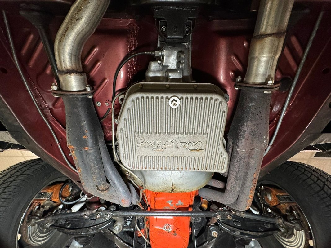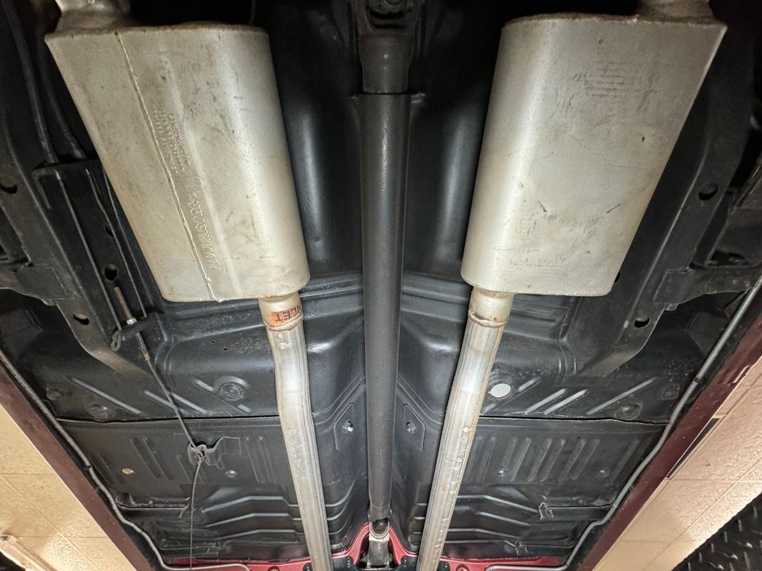 Pleasantly clean and dry underneath with minimal surface rust and no dirt or grease build up anywhere! The dual exhaust flow from headers to meet Flowmaster mufflers then a tailpipe that terminates discreetly under the car. Torsion bar suspension is found up front while leaf springs out back. Clean!