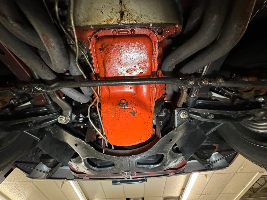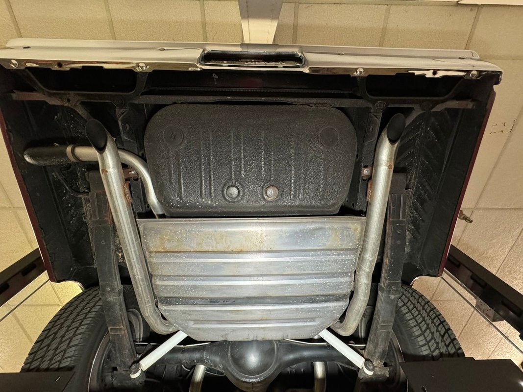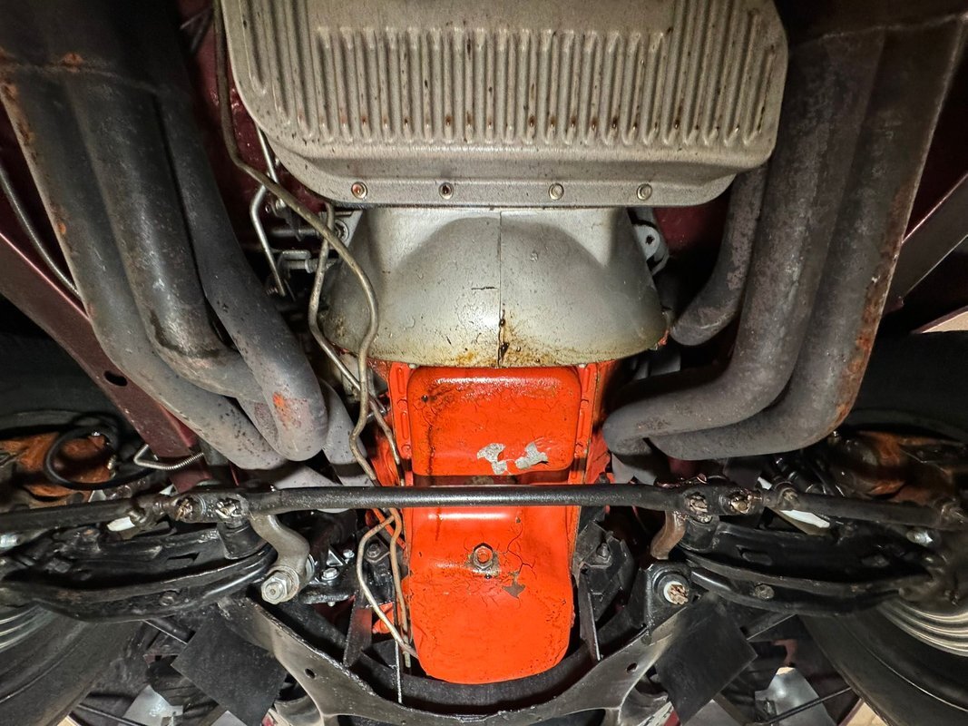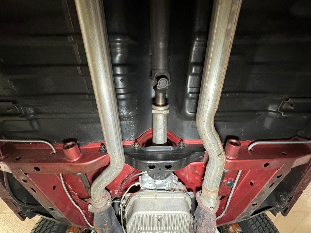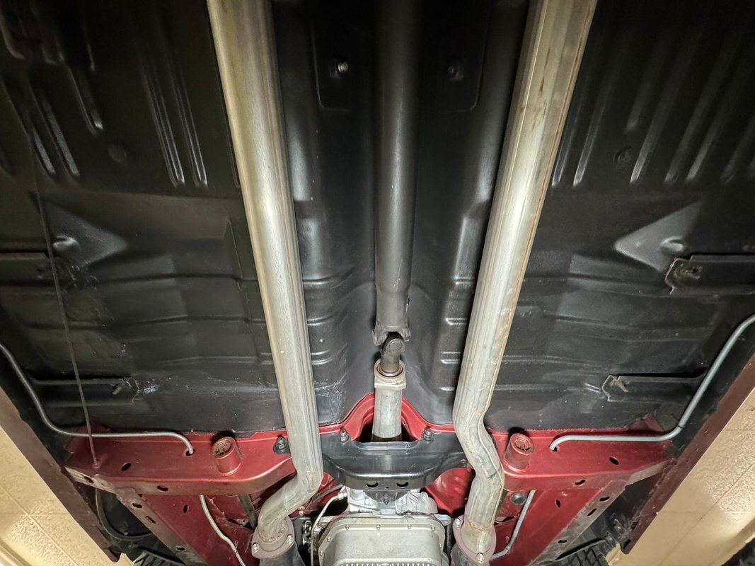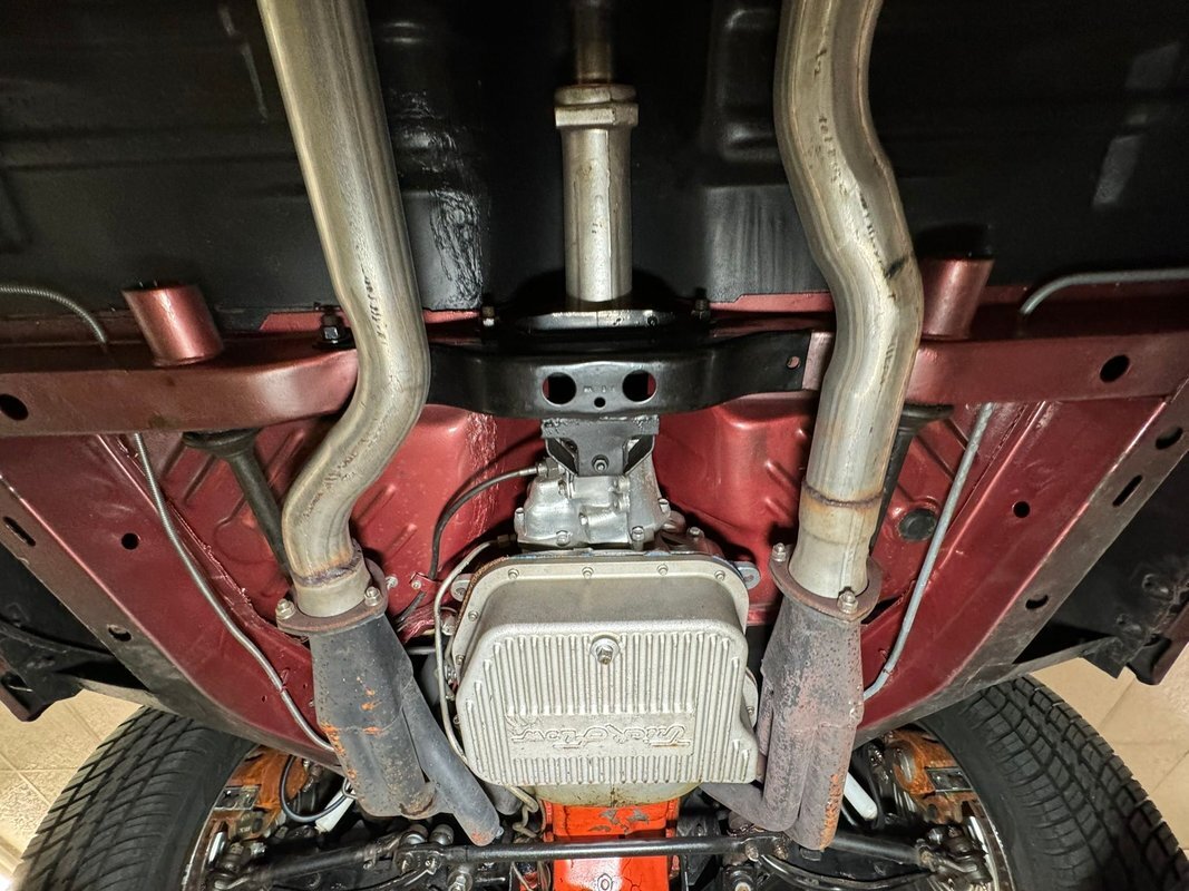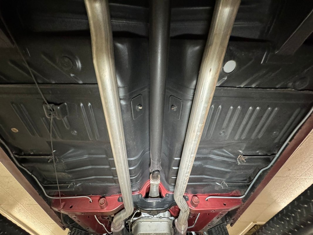 Pleasantly clean and dry underneath with minimal surface rust and no dirt or grease build up anywhere! The dual exhaust flow from headers to meet Flowmaster mufflers then a tailpipe that terminates discreetly under the car. Torsion bar suspension is found up front while leaf springs out back. Clean!