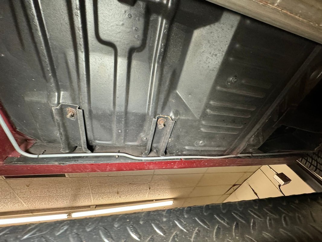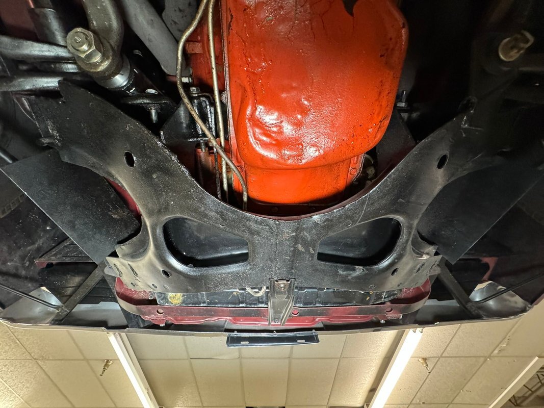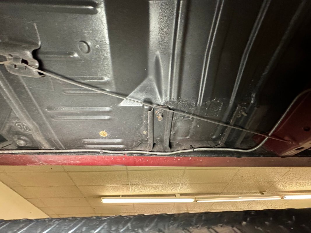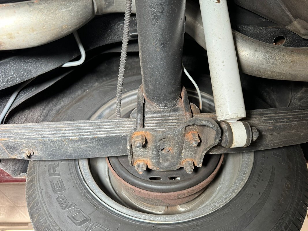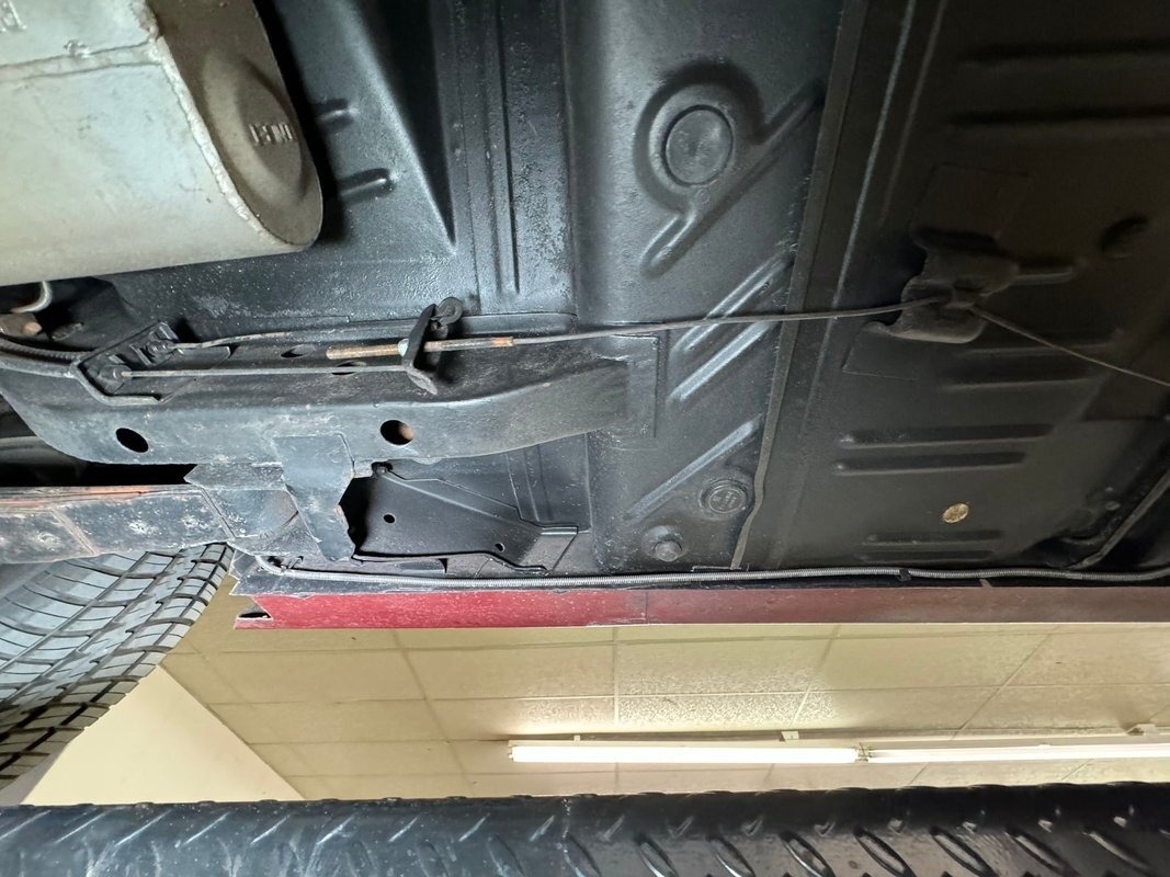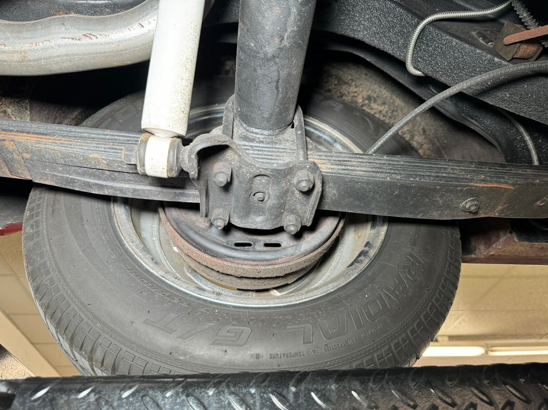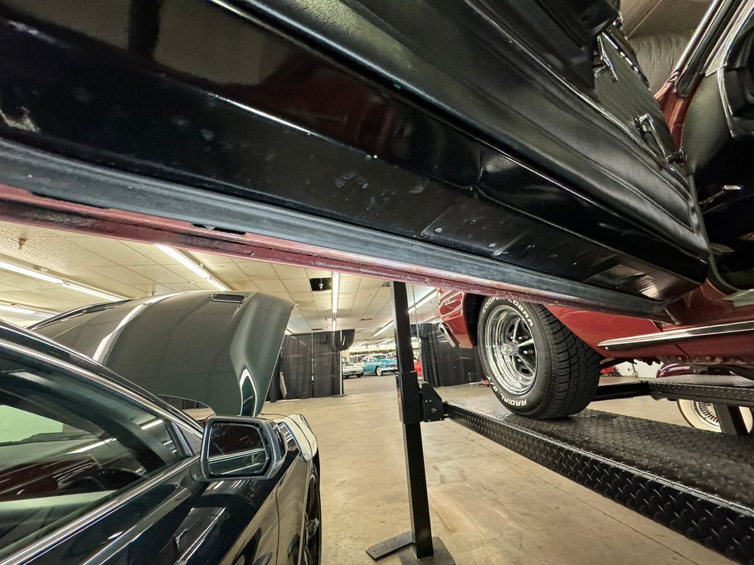 Pleasantly clean and dry underneath with minimal surface rust and no dirt or grease build up anywhere! The dual exhaust flow from headers to meet Flowmaster mufflers then a tailpipe that terminates discreetly under the car. Torsion bar suspension is found up front while leaf springs out back. Clean!