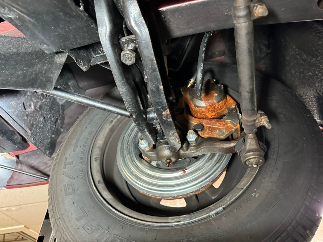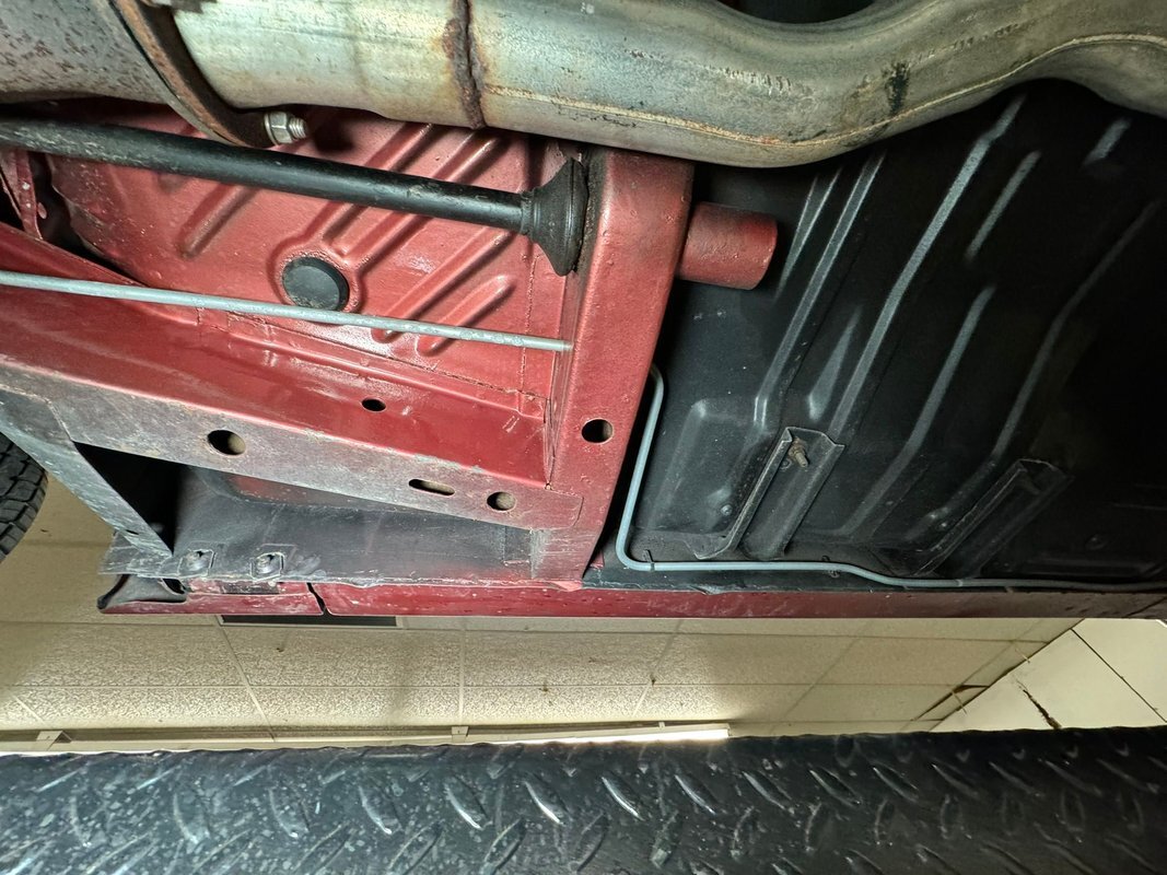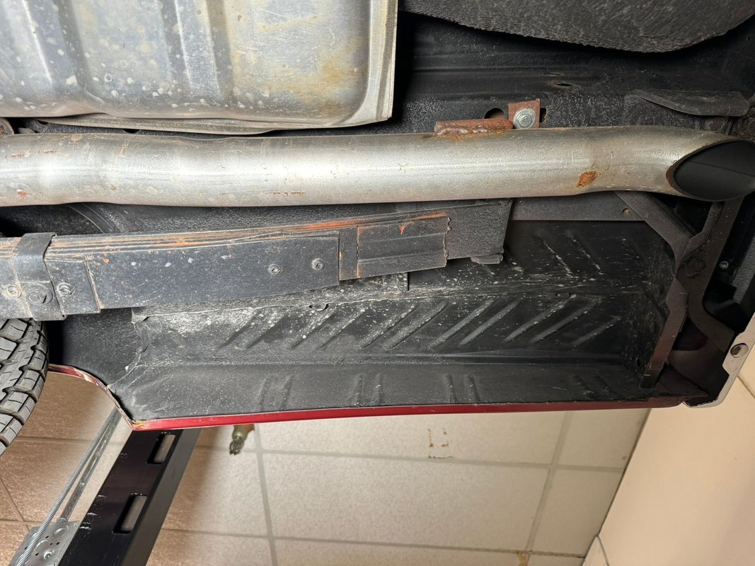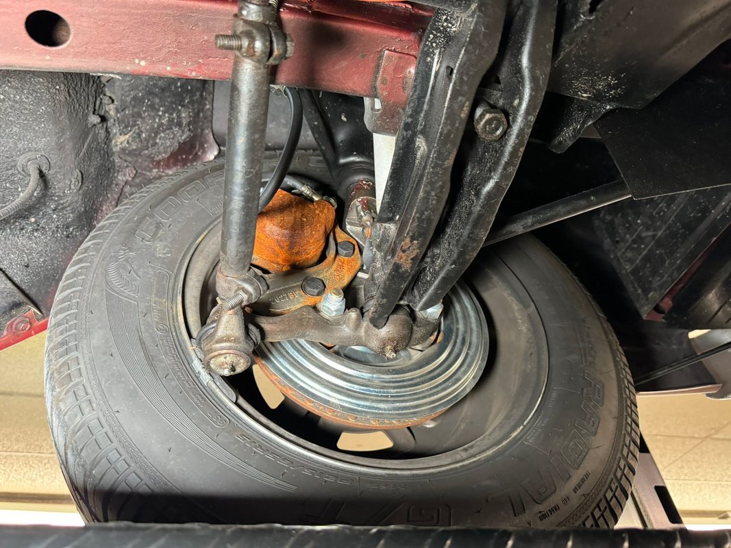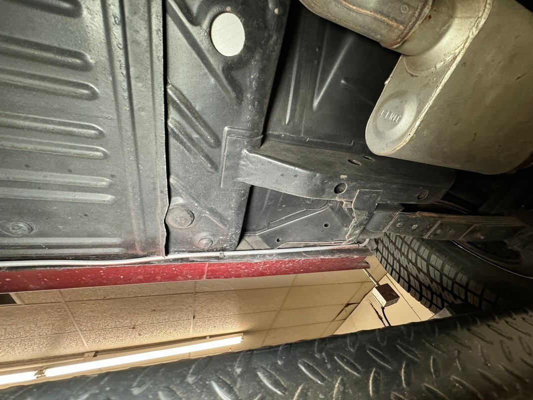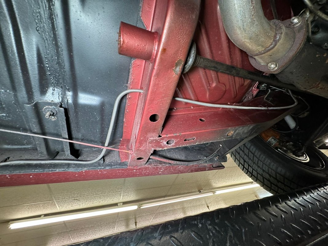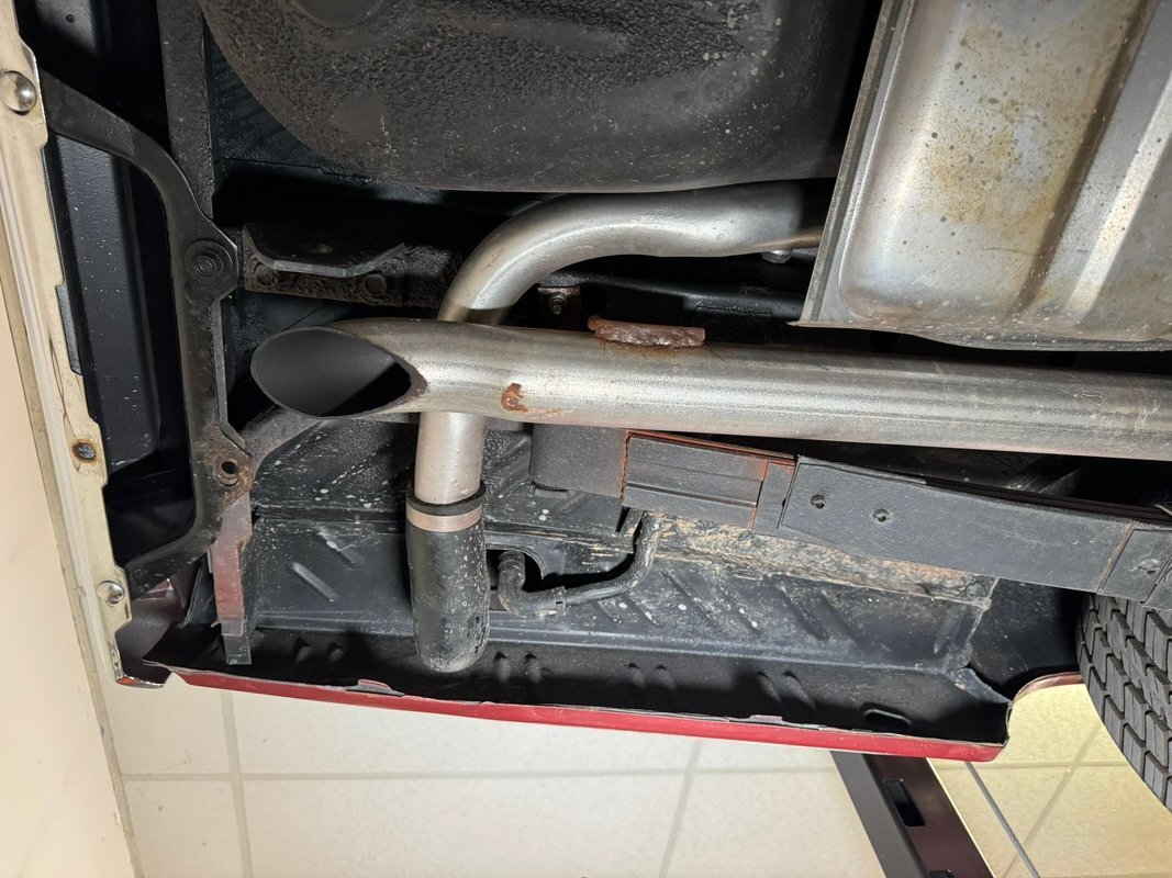 Pleasantly clean and dry underneath with minimal surface rust and no dirt or grease build up anywhere! The dual exhaust flow from headers to meet Flowmaster mufflers then a tailpipe that terminates discreetly under the car. Torsion bar suspension is found up front while leaf springs out back. Clean!