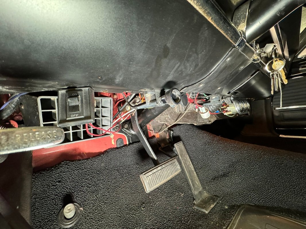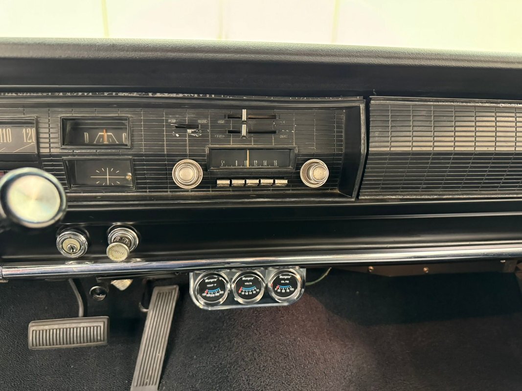 Black metal crowns over vinyl door panels cover the door in 60's simplicity. The split bench front seats are covered in black vinyl and are in great shape, as is the rear bench in the same tuck and roll pattern, with the rear illumination provided by courtesy lights on the rear pillars. The sidewalls and doors create a clean, uniform look with the repeating pattern. The plastic steering wheel has a couple of cracks, and the horn ring has some patina but otherwise in decent condition. The gear indicator is on the column along with the shifter. The dash panel repeats the geometric pattern of the grille and houses a horizontal speedometer flanked by four rectangular gauges, more right angles! An AM radio is in the center of the dash under which we find a tri-gauge pod with added Sunpro round gauges. The black loop style carpet is in good condition and the charcoal headliner and black visors look great. The trunk is clean and covered loosely with the period plaid mat.
