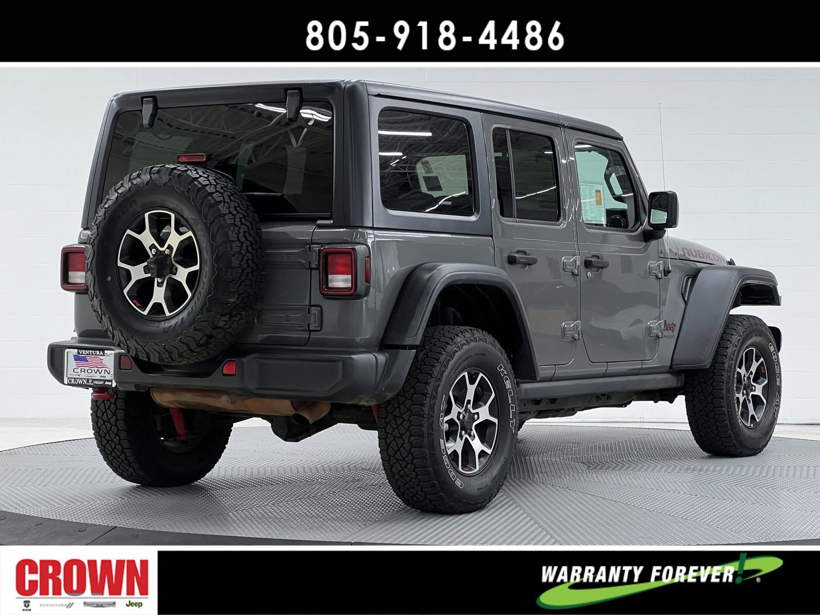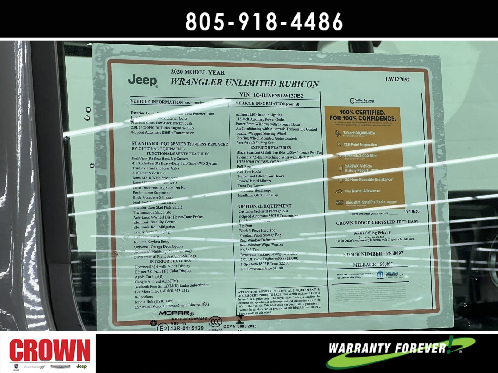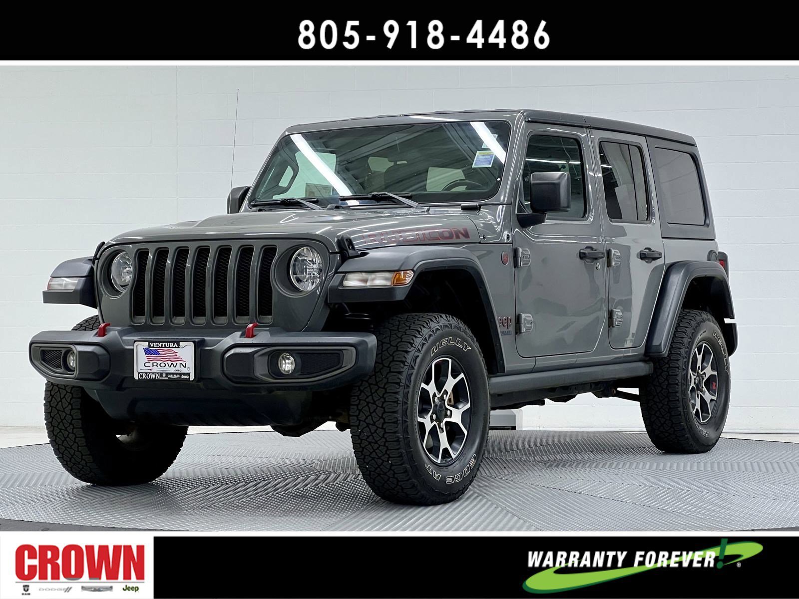 Certified. Sting-Gray Clearcoat 2020 Jeep Wrangler Unlimited Rubicon 4WD 8-Speed Automatic 2.0L I4 DOHC ** 1 Owner Clean CarFax **, Alloy wheels, AM/FM radio: SiriusXM, Apple CarPlay/Android Auto, Automatic temperature control, Aux Battery, Black 3-Piece Hard Top, Freedom Panel Storage Bag, Front dual zone A/C, Front fog lights, Fully automatic headlights, Garage door transmitter, No Soft Top, ParkView Rear Back-Up Camera, Quick Order Package 22R, Radio: Uconnect 4 w/7 Display, Rear Window Defroster, Rear Window Wiper/Washer, Remote keyless entry, Security system, Split folding rear seat, Steering wheel mounted audio controls, Stop-Start Dual Battery System.FCA US LLC Certified Pre-Owned Details:* Vehicle History* Transferable Warranty* Warranty Deductible: $100* Limited Warranty: 3 Month/3,000 Mile (whichever comes first) after new car warranty expires or from certified purchase date* Roadside Assistance* Powertrain Limited Warranty: 84 Month/100,000 Mile (whichever comes first) from original in-service date* 125 Point Inspection* Includes First Day Rental, Car Rental Allowance, and Trip Interruption Benefits. SiriusXM 3 month trial subscriptionHere at Crown Dodge Chrysler Jeep RAM, we believe that great service means more than just offering our new Dodge, Chrysler, Jeep, and RAM lineup. We believe that great service also includes helpful advice, friendly car financing, and the highest quality parts and repairs for your car. Our staff works hard to make your full automotive experience at our car dealership in Ventura, CA enjoyable, and we look forward to helping you today! All vehicles at Crown Dodge have our SWAT security system $995,Clear Shield $395, Pulse $395, Wheel Locks $395, Windshield Protection $995, Nitro Fill $499, Screen Protector $395 and $1295 Paint/Fabric Protection pre-installed. Prices on the website do not include dealer-added equipment. Discounts include $2,000 Trade-In Dealer Assist Cash. Must trade in a 2015 or newer vehicle on a retail purchase. Trade-in must have less than 15,000 miles on average per year stated on Carfax Report, clean title, and Clean vehicle history report. Expires 02/19/2024. Expires 02/29/2024.