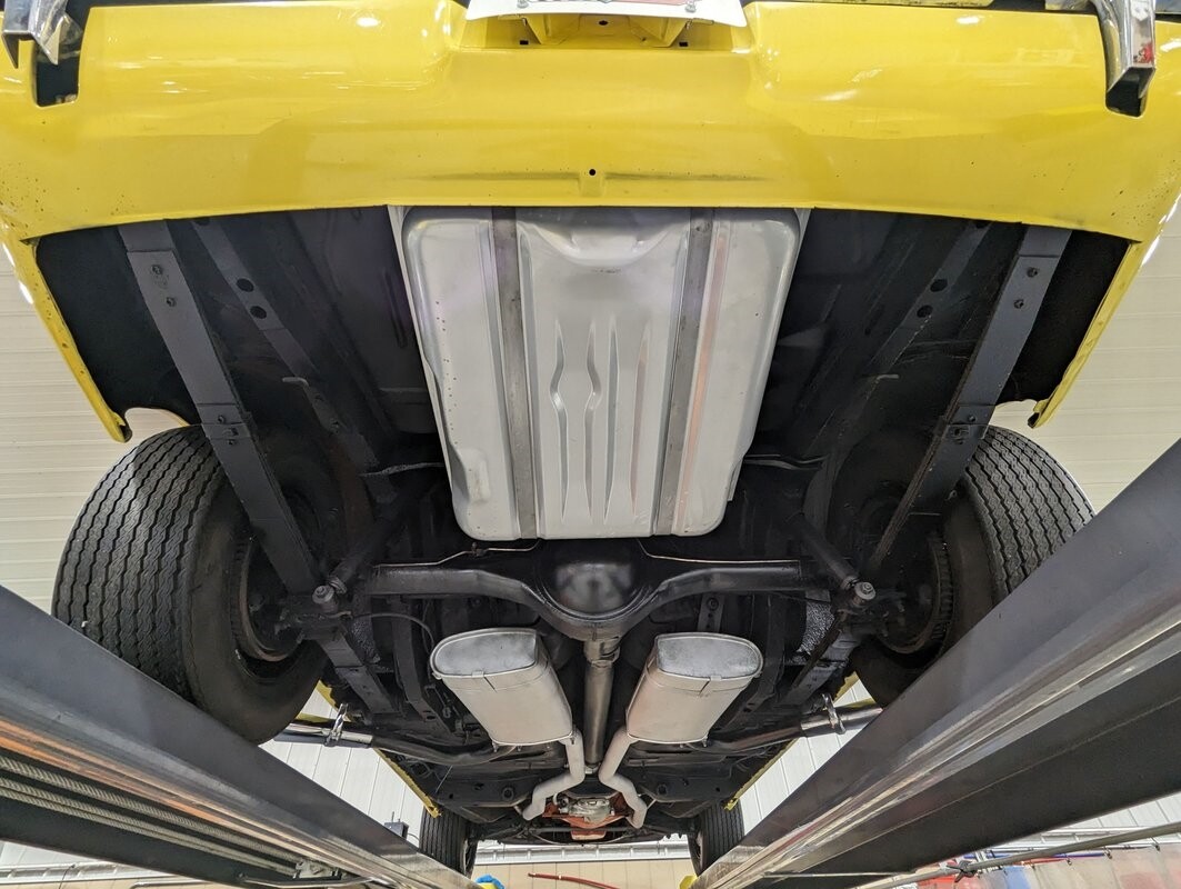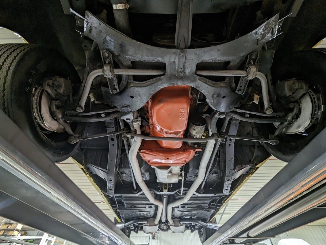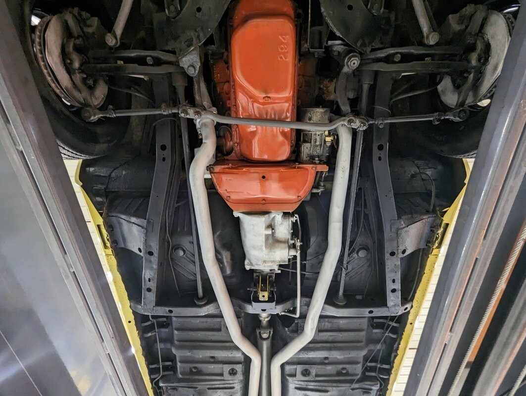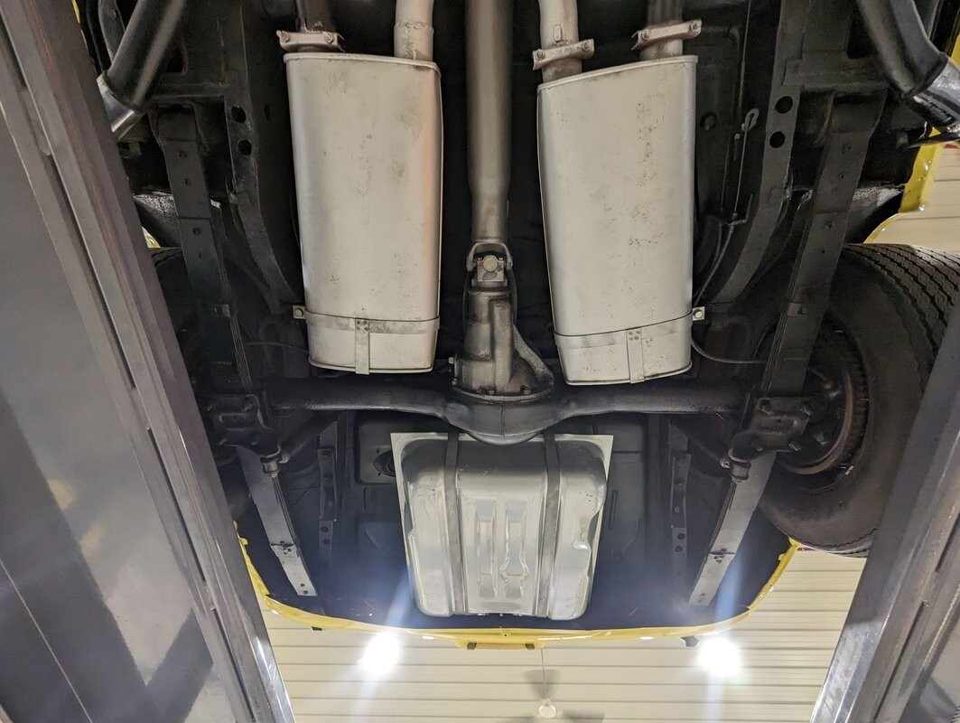 UNDERSIDE: It is very clean original condition, maintained as needed. Original rust free floors and frame rails. Very unique side exhaust with correct chrome tips. The fuel tank has been replaced. It has disc brakes in front, e-brake is hooked up. Looking up at the motor it is clean the VIN number stamped by the oil pan matches the car. That same exact VIN number is also stamped on it's original 4-speed trans. In back is the original 3.91 Sure Grip rear end with it's original tag.