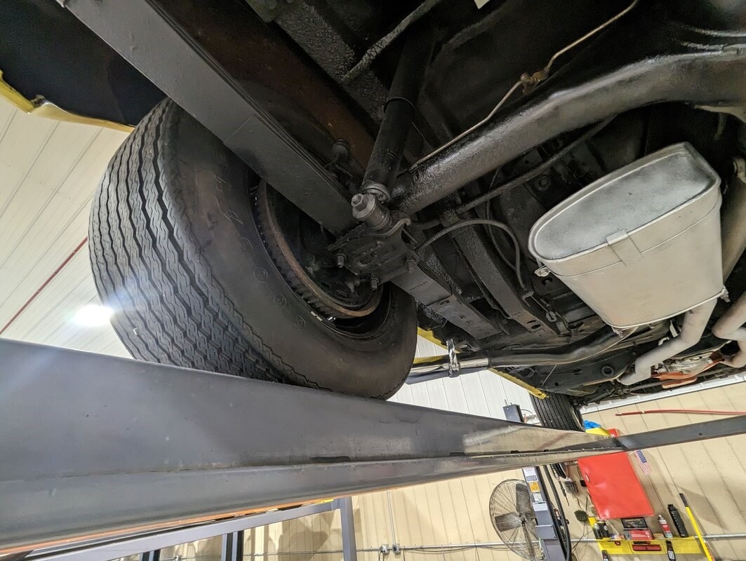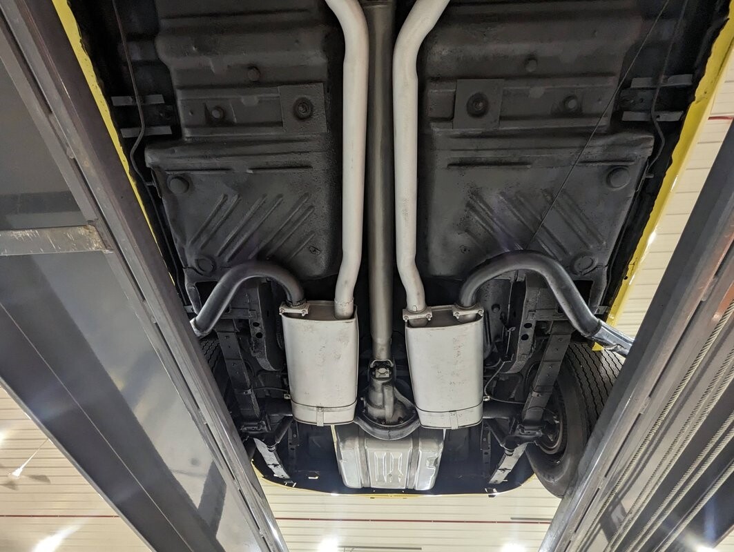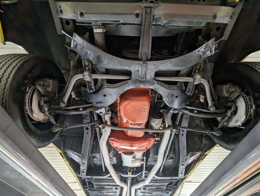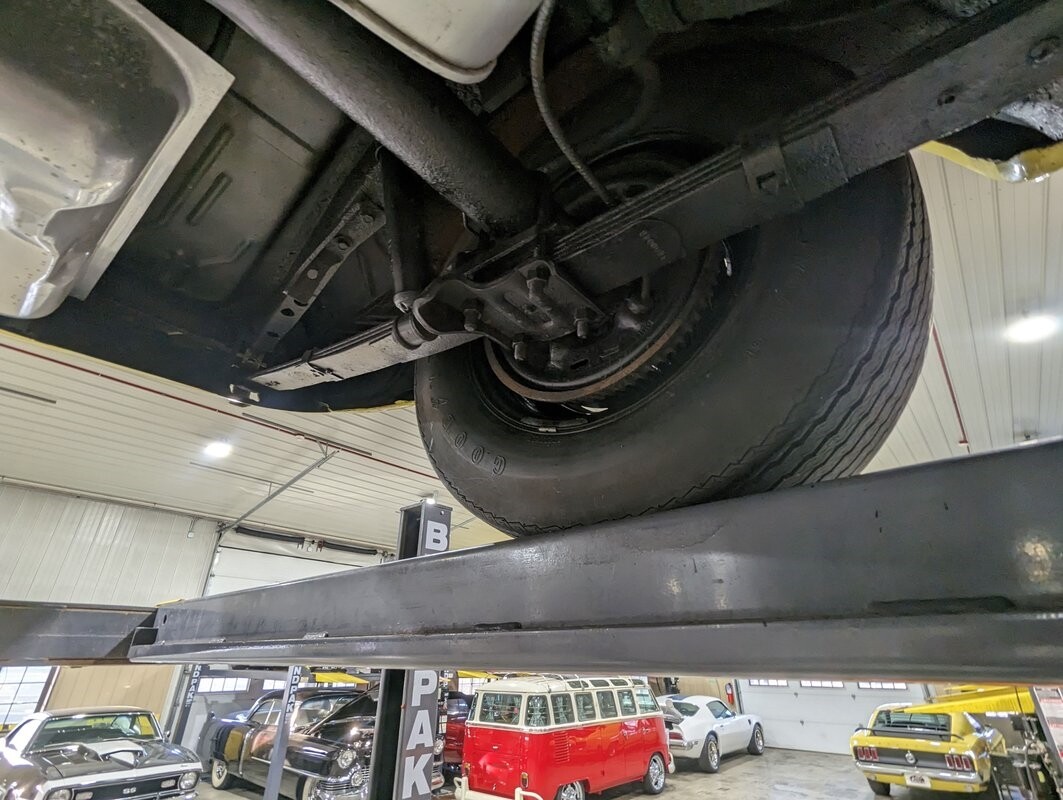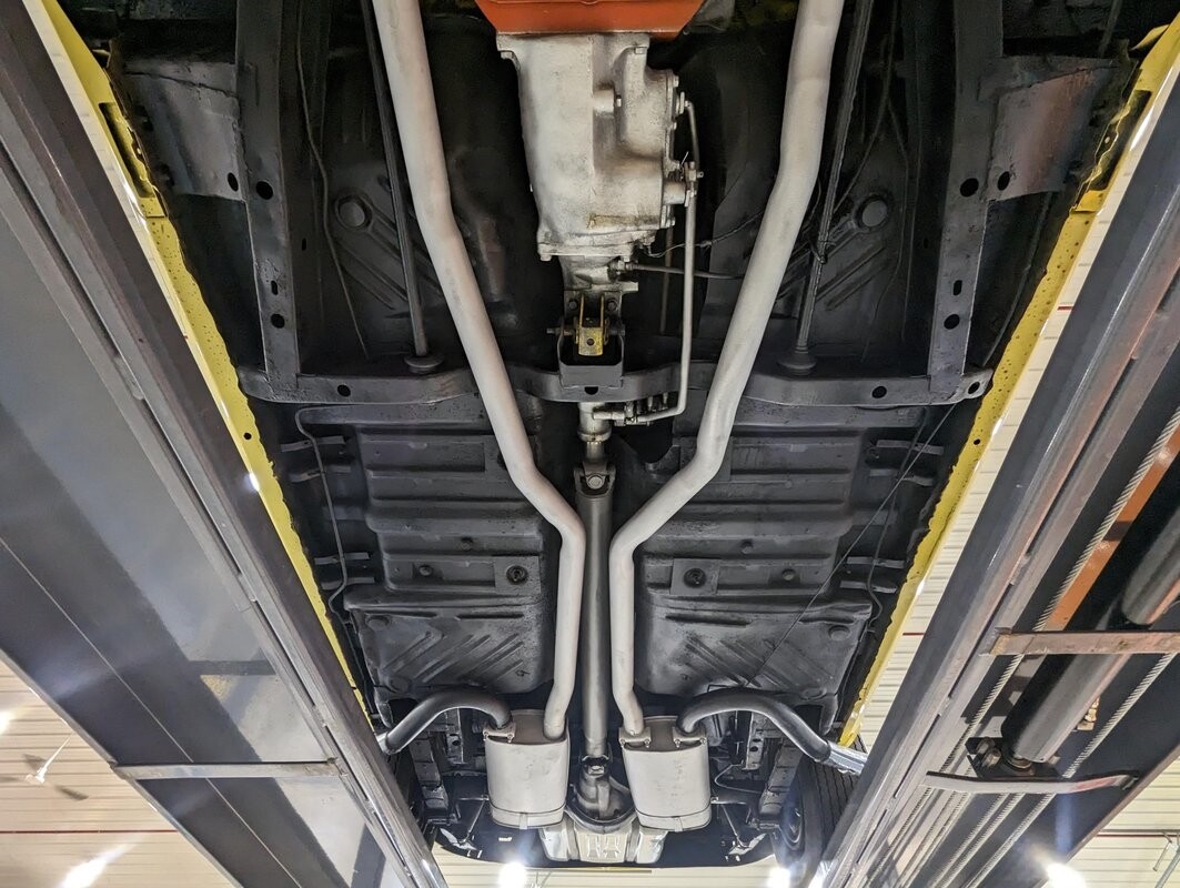UNDERSIDE: It is very clean original condition, maintained as needed. Original rust free floors and frame rails. Very unique side exhaust with correct chrome tips. The fuel tank has been replaced. It has disc brakes in front, e-brake is hooked up. Looking up at the motor it is clean the VIN number stamped by the oil pan matches the car. That same exact VIN number is also stamped on it's original 4-speed trans. In back is the original 3.91 Sure Grip rear end with it's original tag.