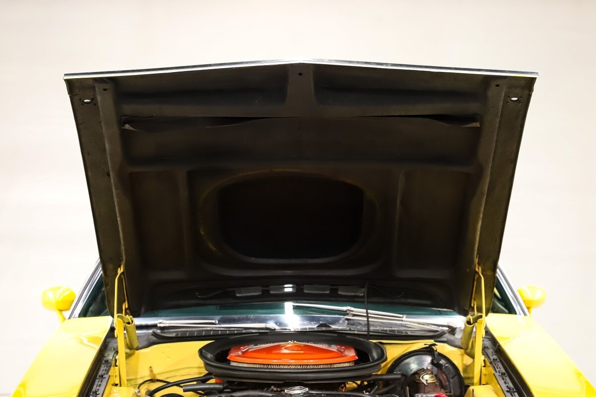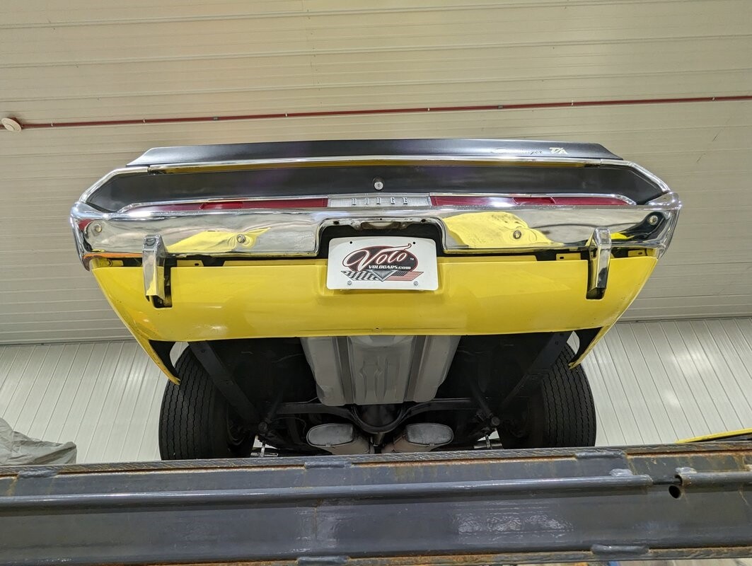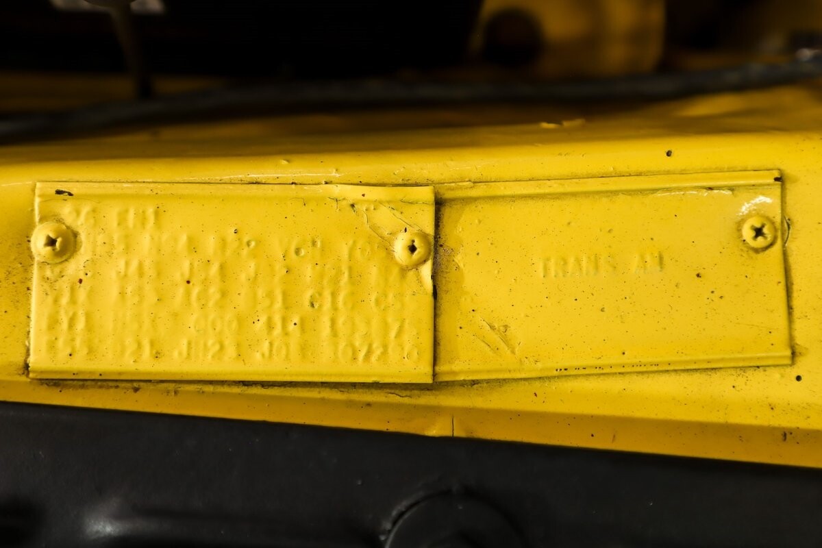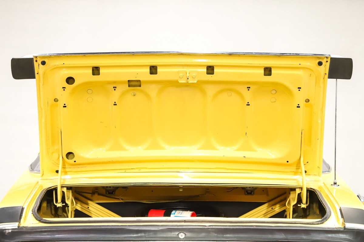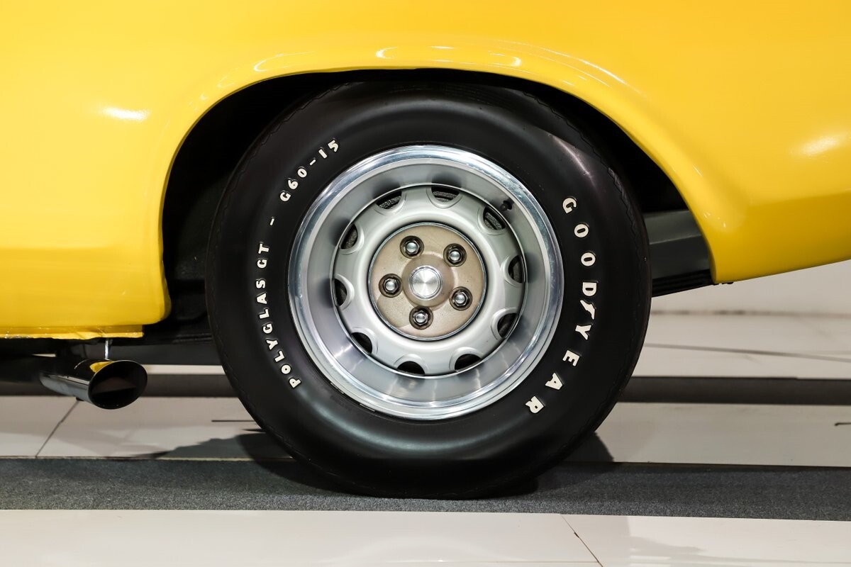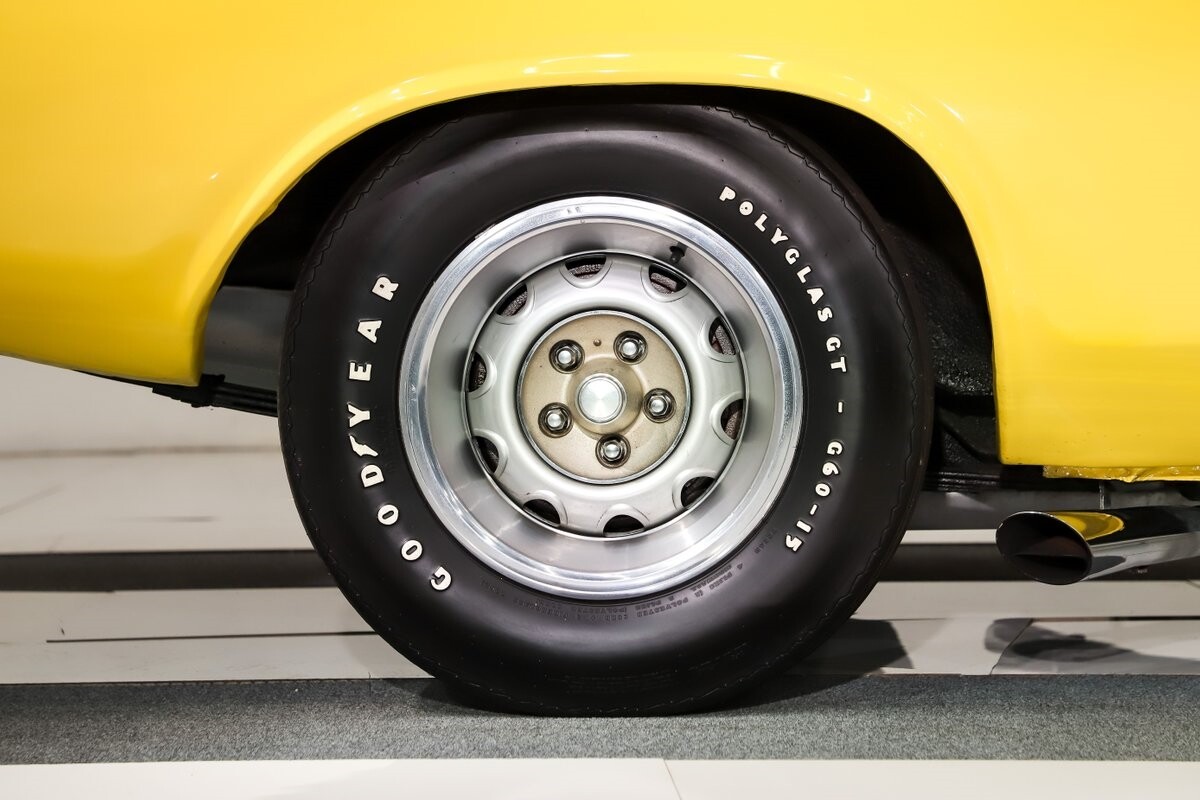 EXTERIOR: It looks like it has its original body panels. Original non glare, lightweight fiberglass hood with racing pins and it fits really well. It has original chin and dovetail spoilers. Optional racing mirrors on each door. Repainted only one time, original high impact Top Banana Yellow. The jambs are mostly original with original weatherstrips and VIN sticker. Original chrome including the flip top gas cap. Even the vinyl top is original. The glass is all original. Rolling on 15 inch rallye wheels with staggered size reproduction tires. They are F70s in front, taller G60s in back to raise the car for the exhaust.