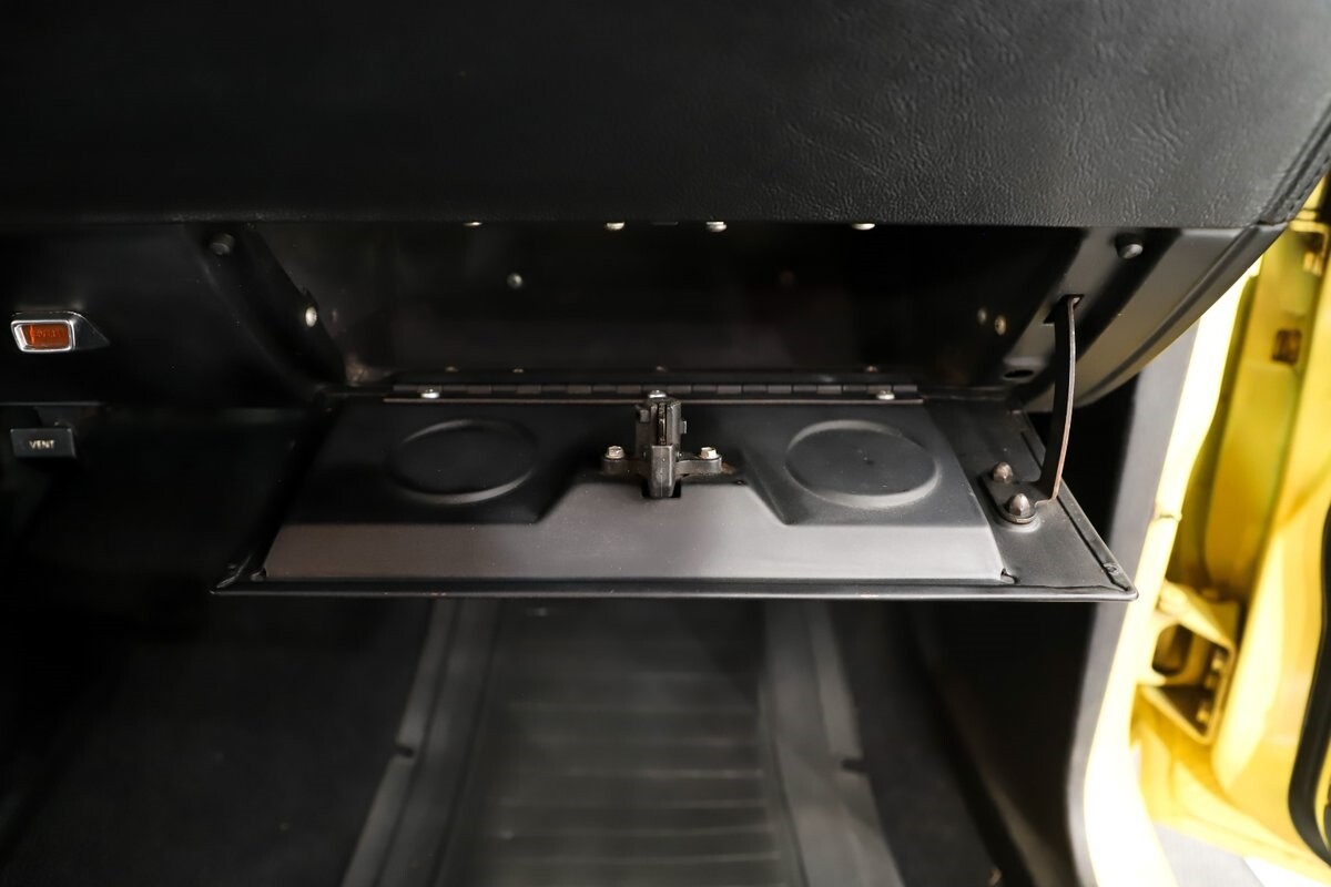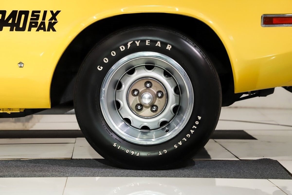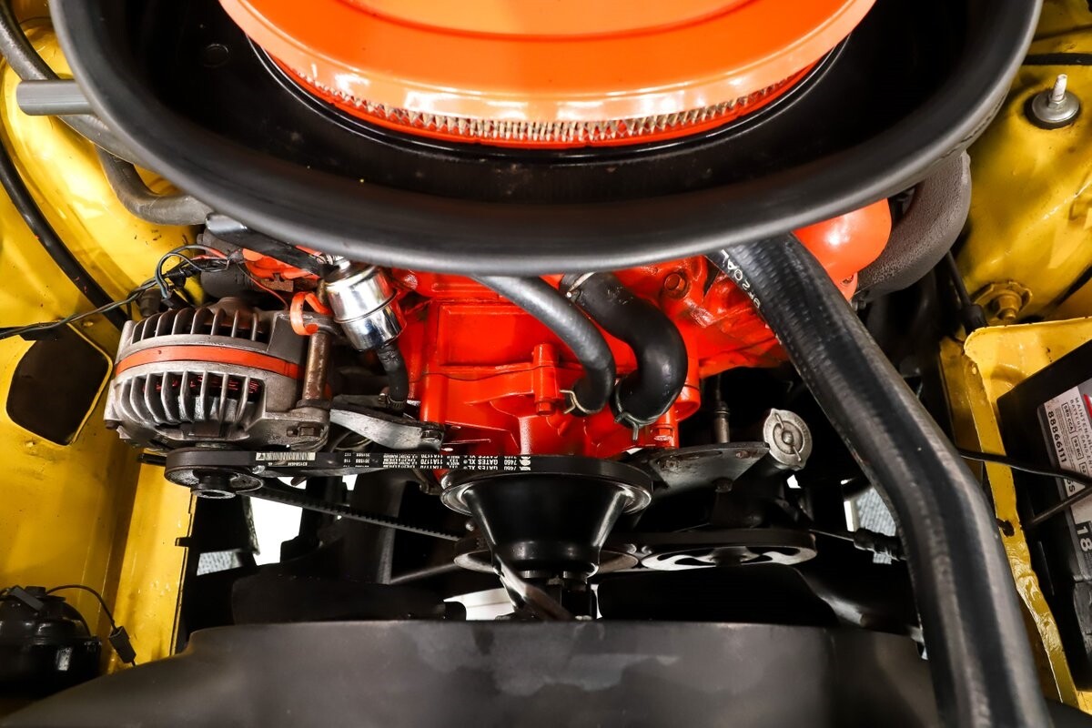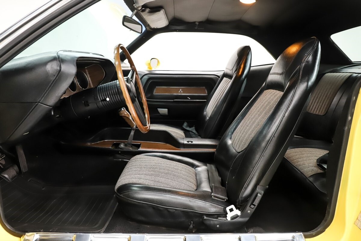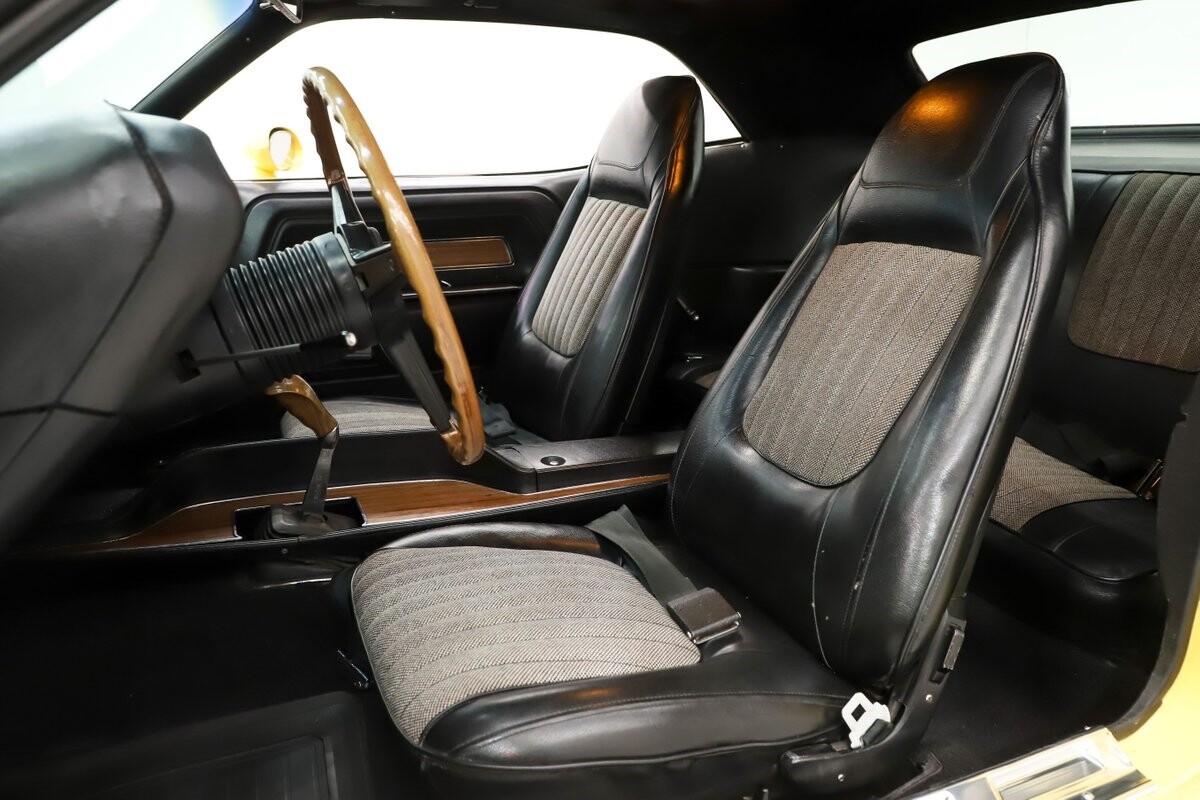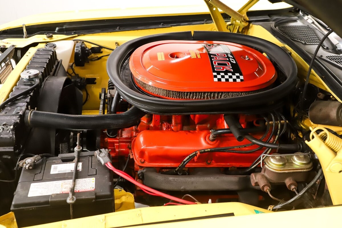 EXTERIOR: It looks like it has its original body panels. Original non glare, lightweight fiberglass hood with racing pins and it fits really well. It has original chin and dovetail spoilers. Optional racing mirrors on each door. Repainted only one time, original high impact Top Banana Yellow. The jambs are mostly original with original weatherstrips and VIN sticker. Original chrome including the flip top gas cap. Even the vinyl top is original. The glass is all original. Rolling on 15 inch rallye wheels with staggered size reproduction tires. They are F70s in front, taller G60s in back to raise the car for the exhaust.