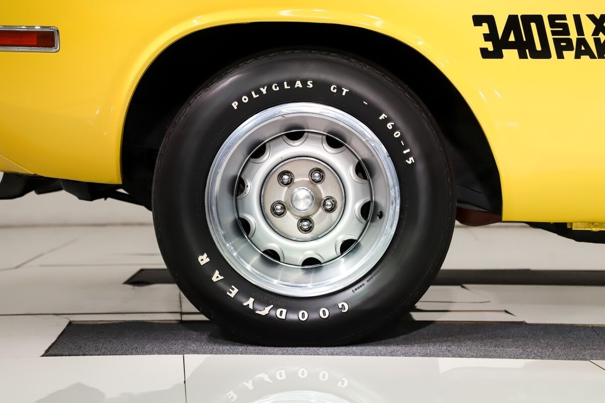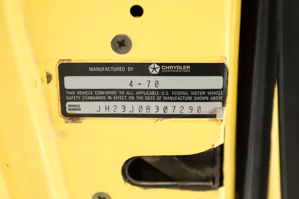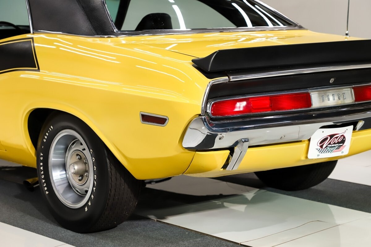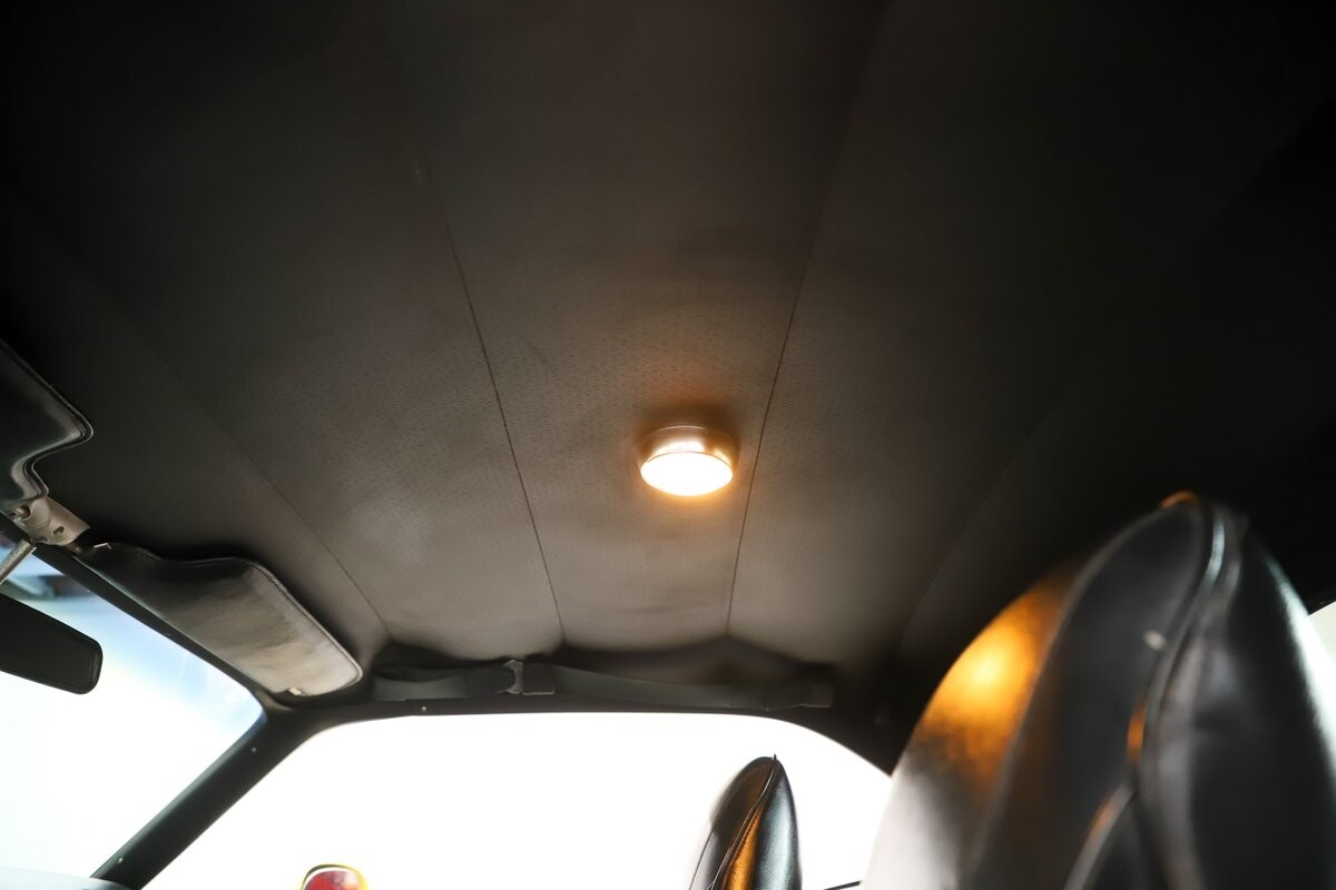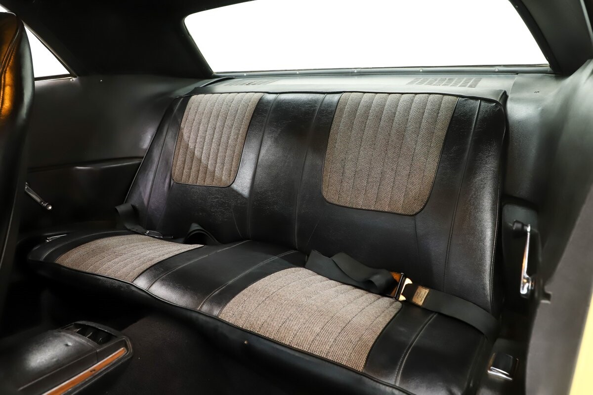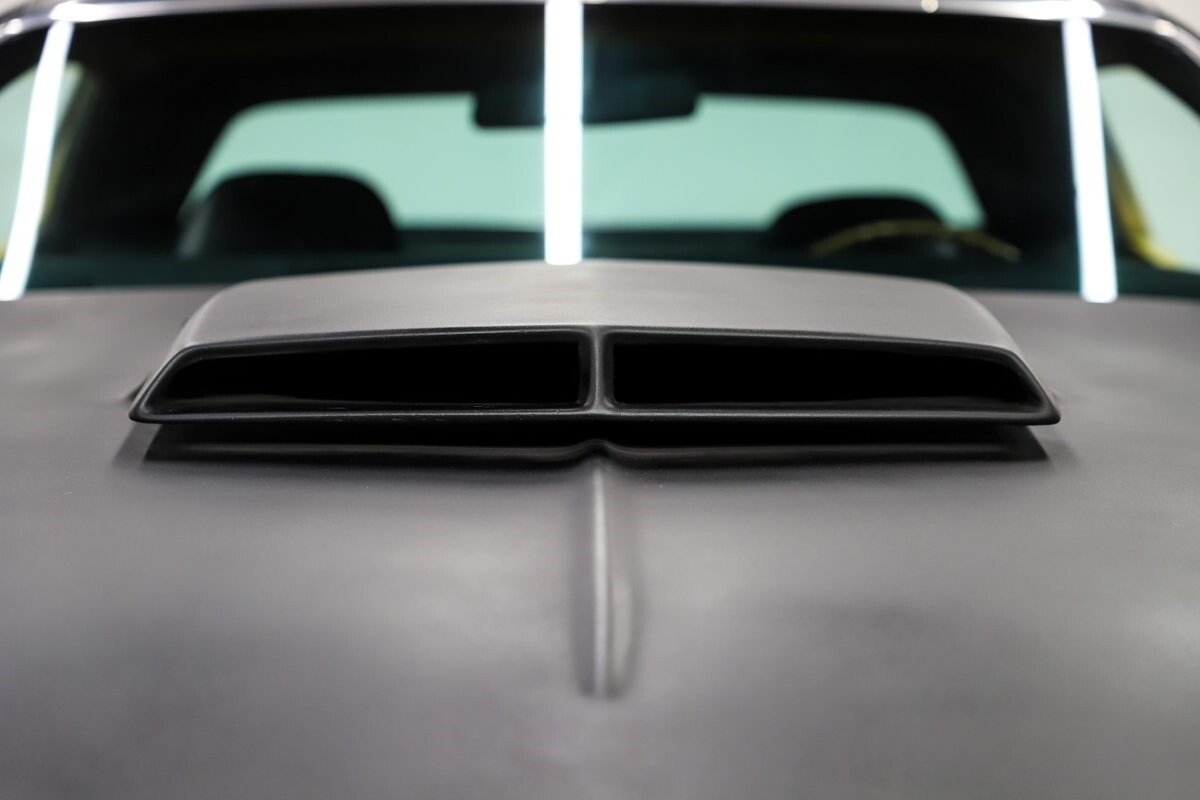 EXTERIOR: It looks like it has its original body panels. Original non glare, lightweight fiberglass hood with racing pins and it fits really well. It has original chin and dovetail spoilers. Optional racing mirrors on each door. Repainted only one time, original high impact Top Banana Yellow. The jambs are mostly original with original weatherstrips and VIN sticker. Original chrome including the flip top gas cap. Even the vinyl top is original. The glass is all original. Rolling on 15 inch rallye wheels with staggered size reproduction tires. They are F70s in front, taller G60s in back to raise the car for the exhaust.