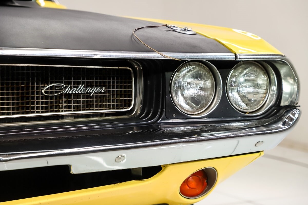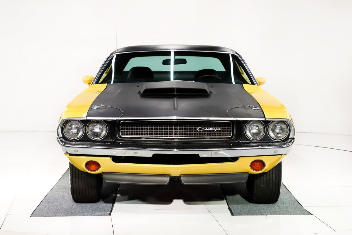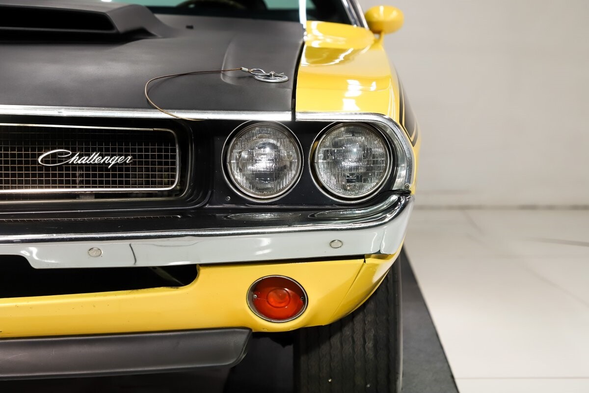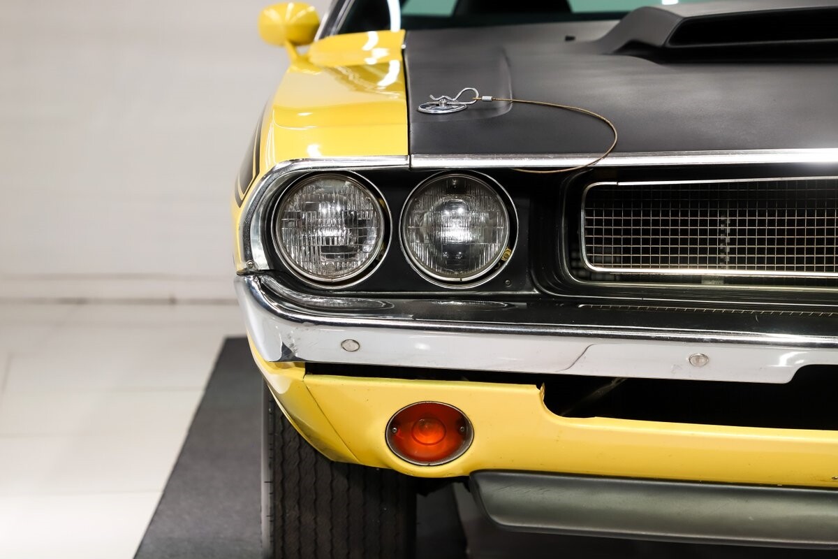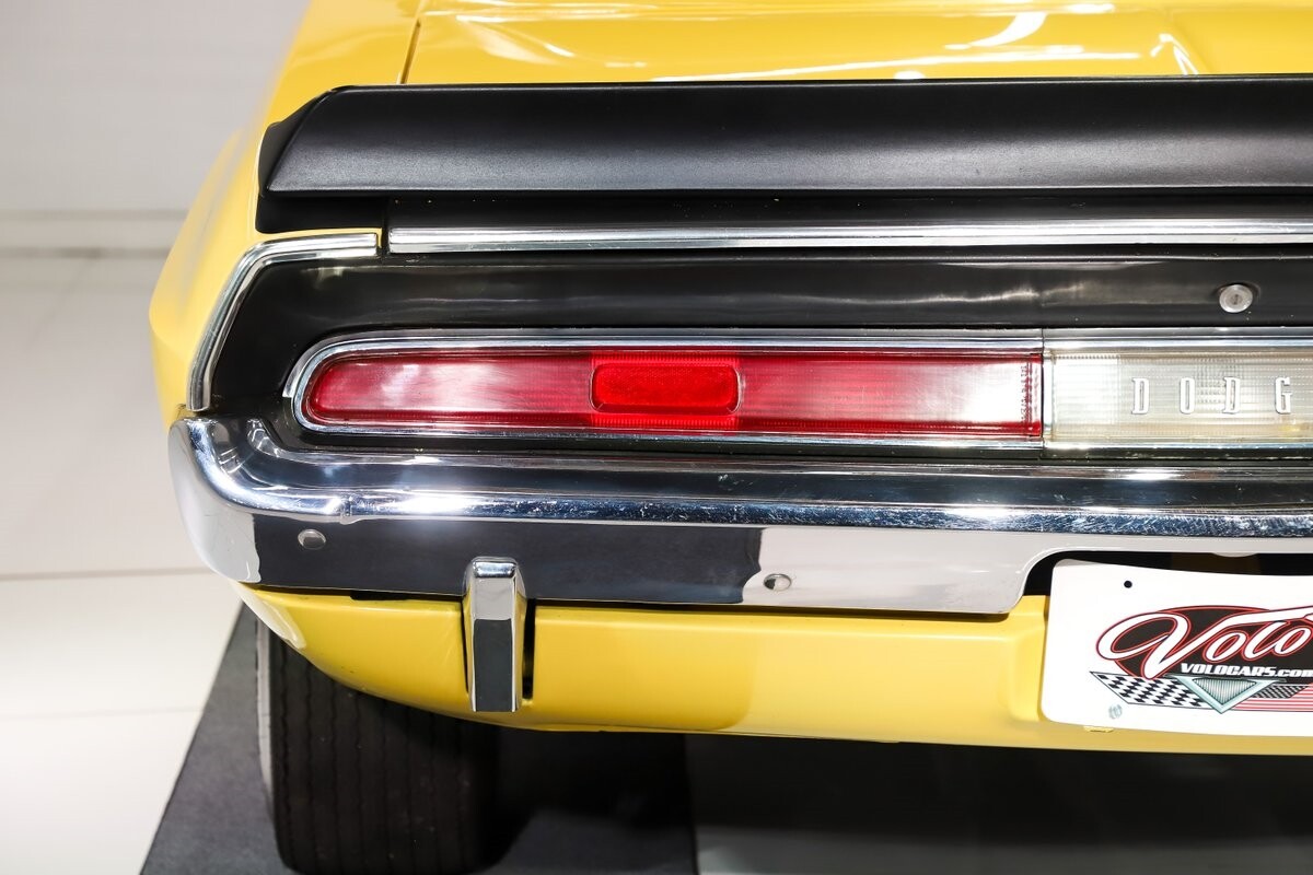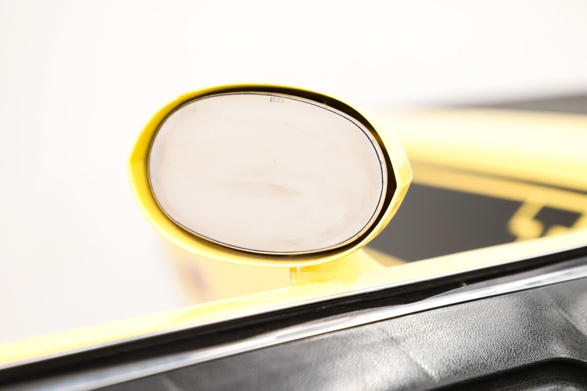 EXTERIOR: It looks like it has its original body panels. Original non glare, lightweight fiberglass hood with racing pins and it fits really well. It has original chin and dovetail spoilers. Optional racing mirrors on each door. Repainted only one time, original high impact Top Banana Yellow. The jambs are mostly original with original weatherstrips and VIN sticker. Original chrome including the flip top gas cap. Even the vinyl top is original. The glass is all original. Rolling on 15 inch rallye wheels with staggered size reproduction tires. They are F70s in front, taller G60s in back to raise the car for the exhaust.