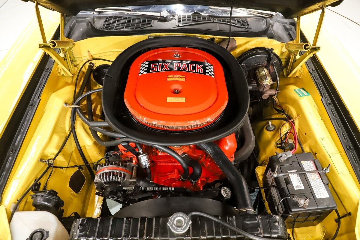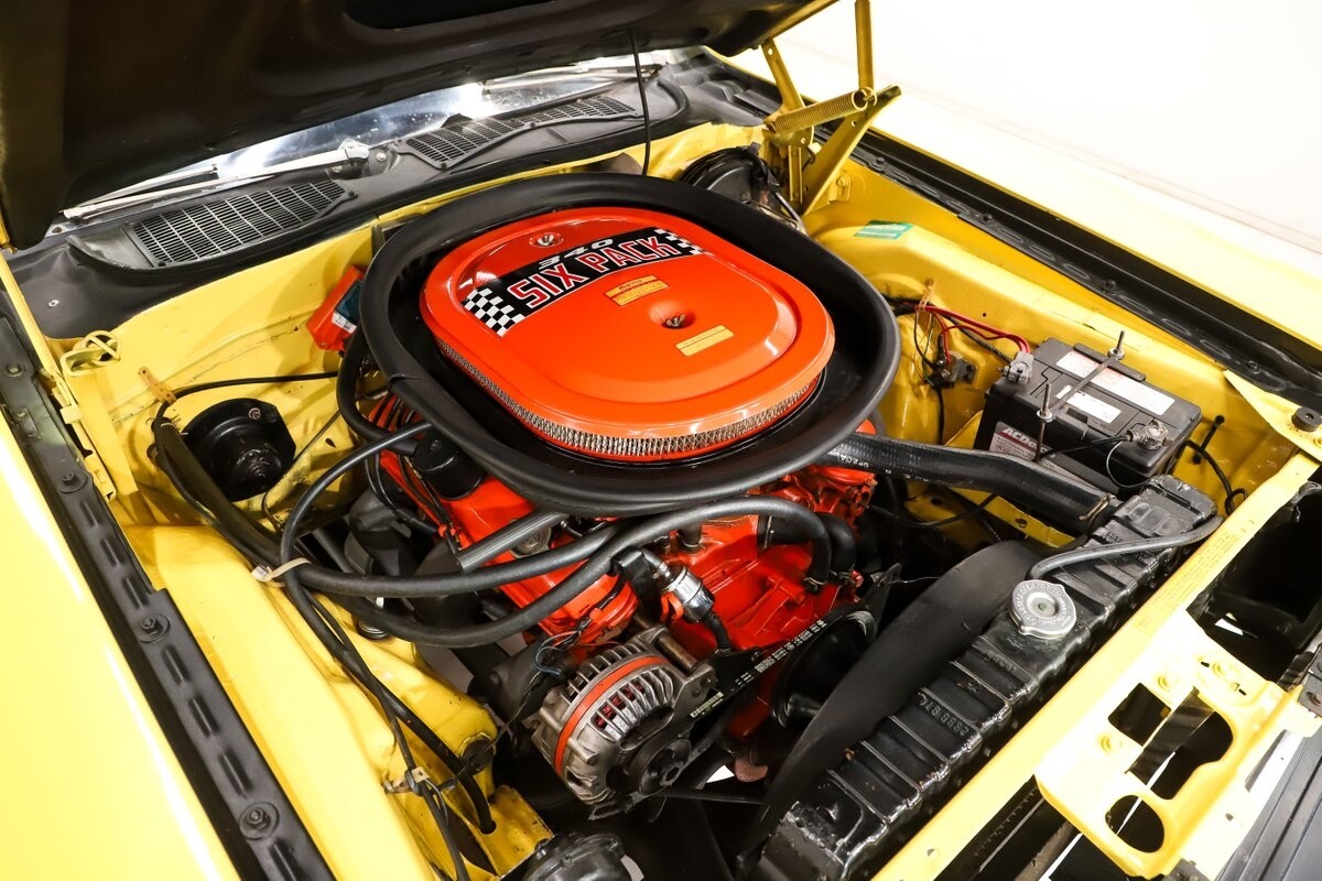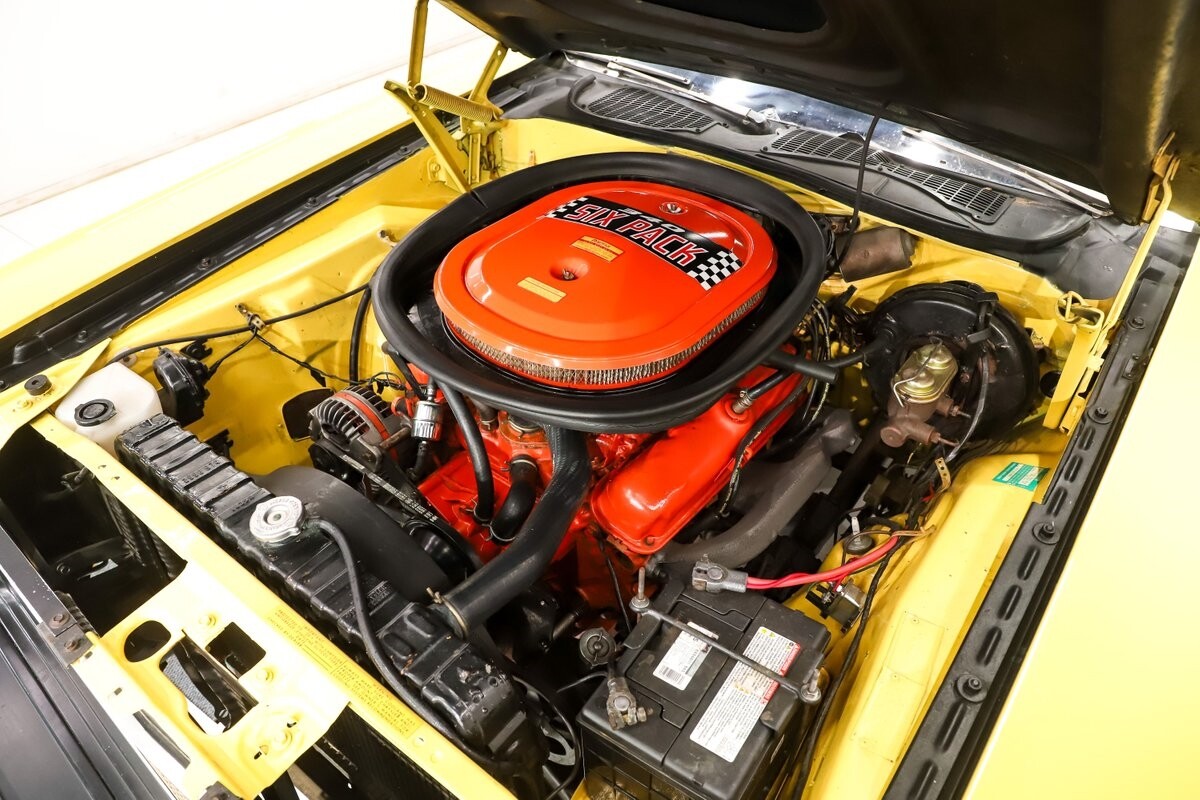 ENGINE COMPARTMENT: Original vin # matching high performance 340 6 pack. 340TA is cast right on the block, it is a unique block made stronger for the T/A. On top is the original Edelbrock intake with Holley 6-pack carbs being force fed through the ram air system. The original distributor is included. This one has optional power steering and power brakes. Overall, it looks very proper. Both fender tags are originals. The VIN on the core support and cowl match the car.