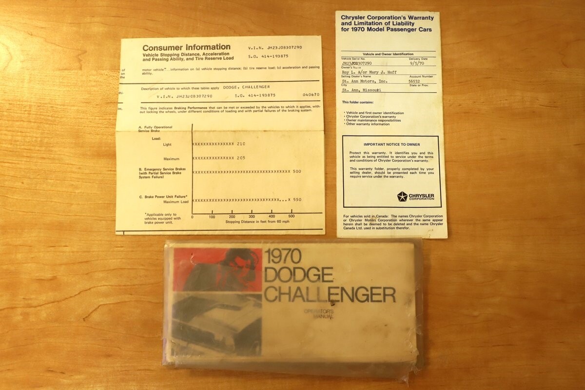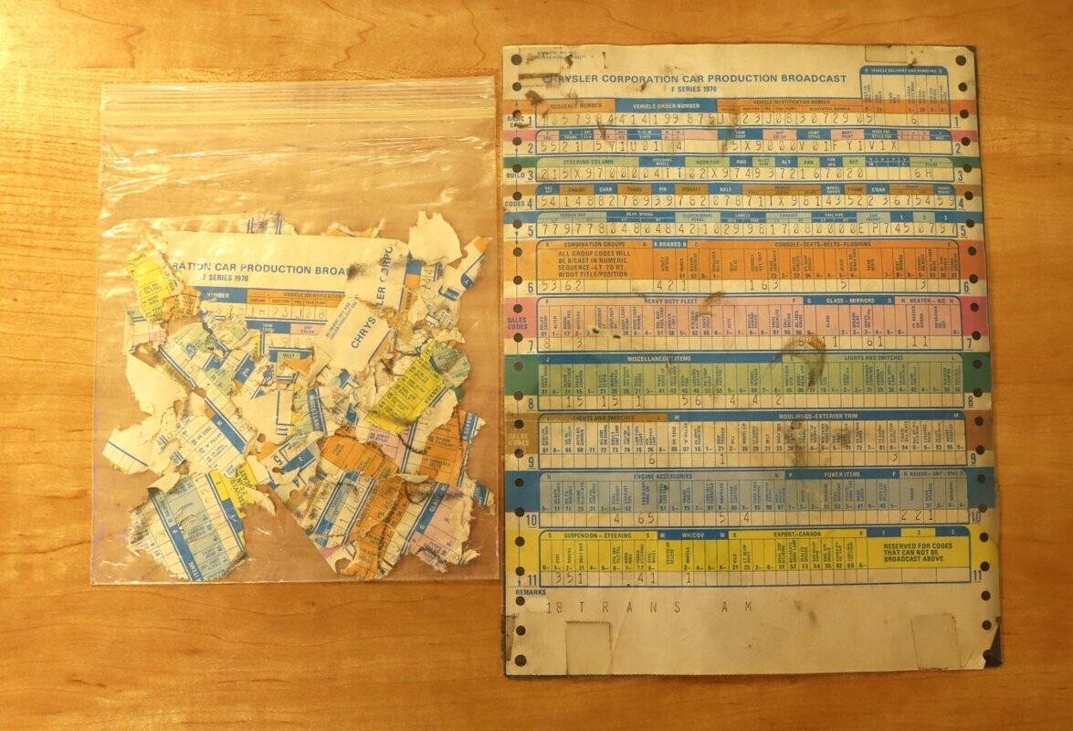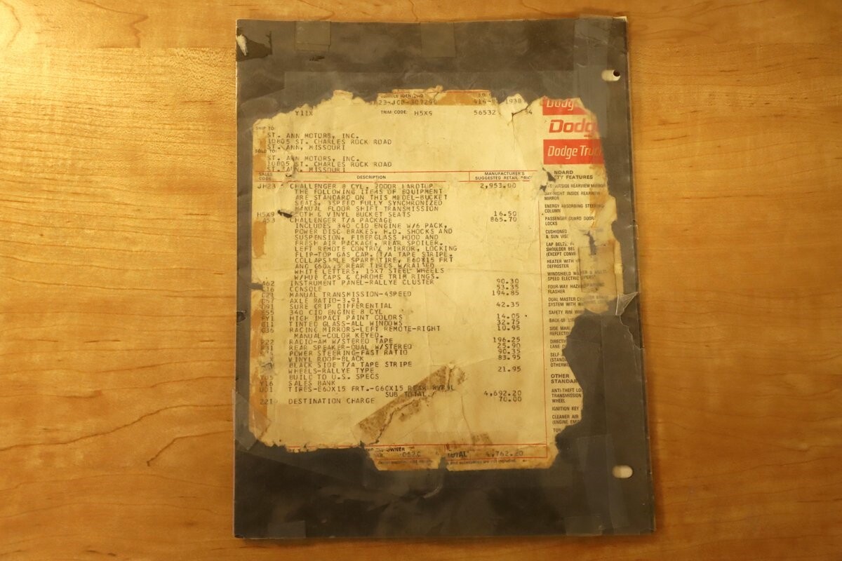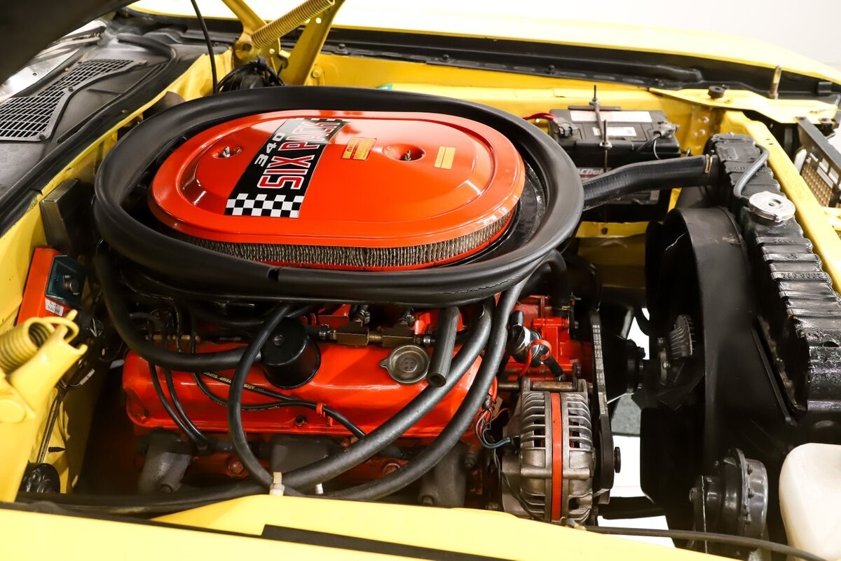 ENGINE COMPARTMENT: Original vin # matching high performance 340 6 pack. 340TA is cast right on the block, it is a unique block made stronger for the T/A. On top is the original Edelbrock intake with Holley 6-pack carbs being force fed through the ram air system. The original distributor is included. This one has optional power steering and power brakes. Overall, it looks very proper. Both fender tags are originals. The VIN on the core support and cowl match the car.