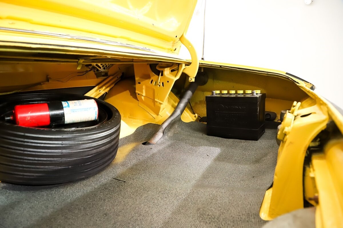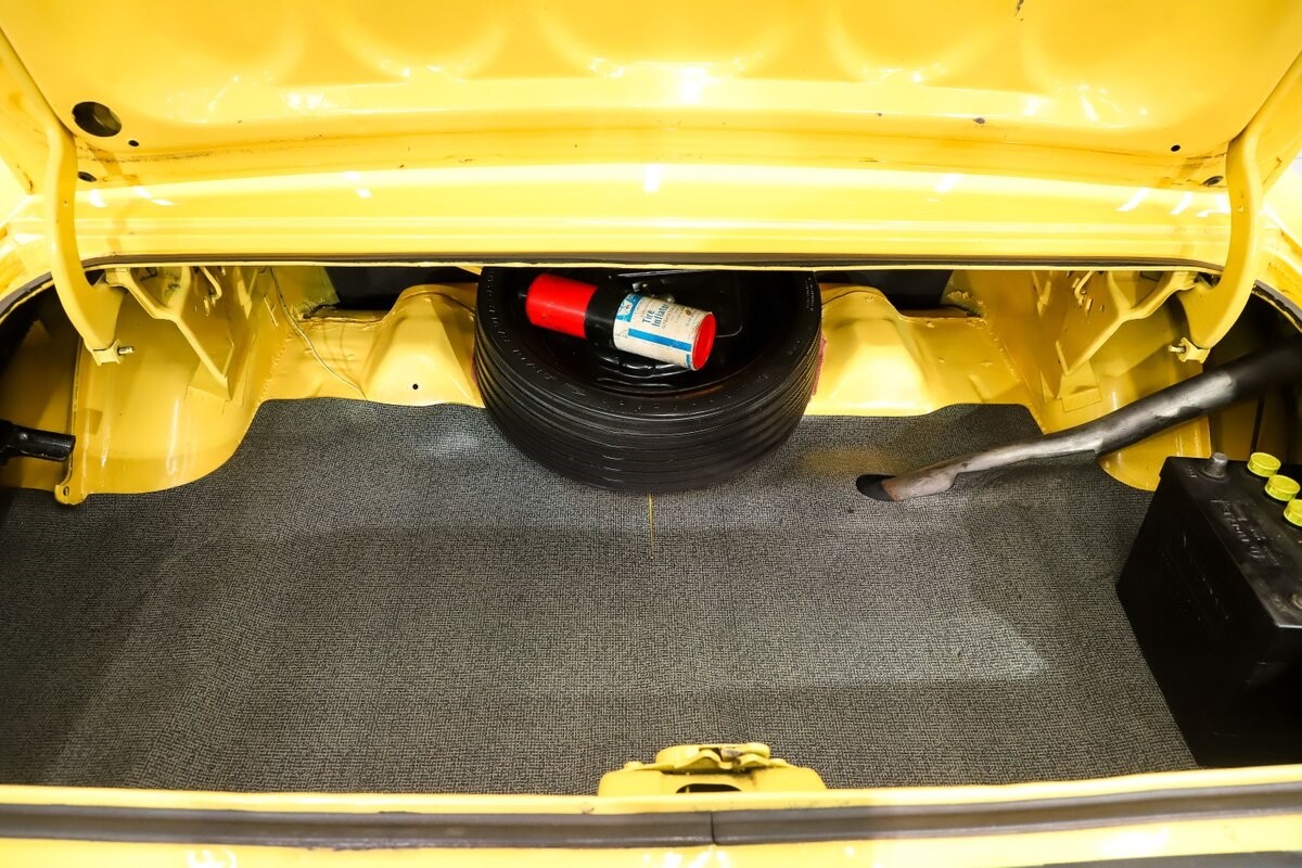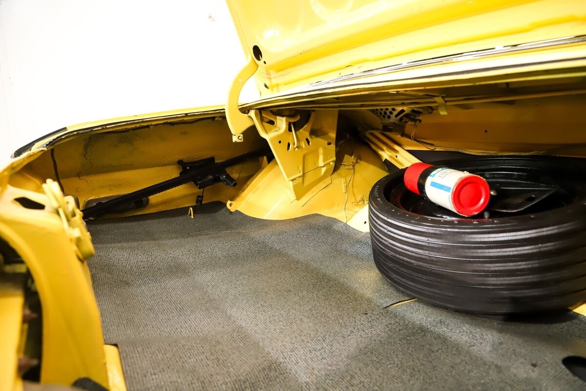 TRUNK COMPARTMENT: Clean metal painted yellow, new mat. Original weatherstrip. It still has it's original collapsible spare with air bottle and the jack assembly.