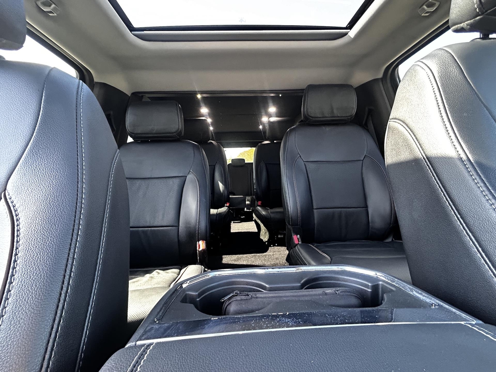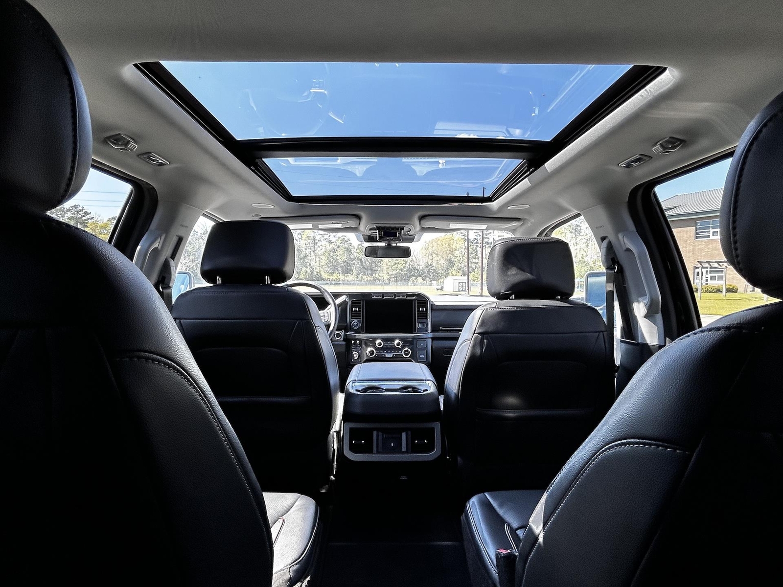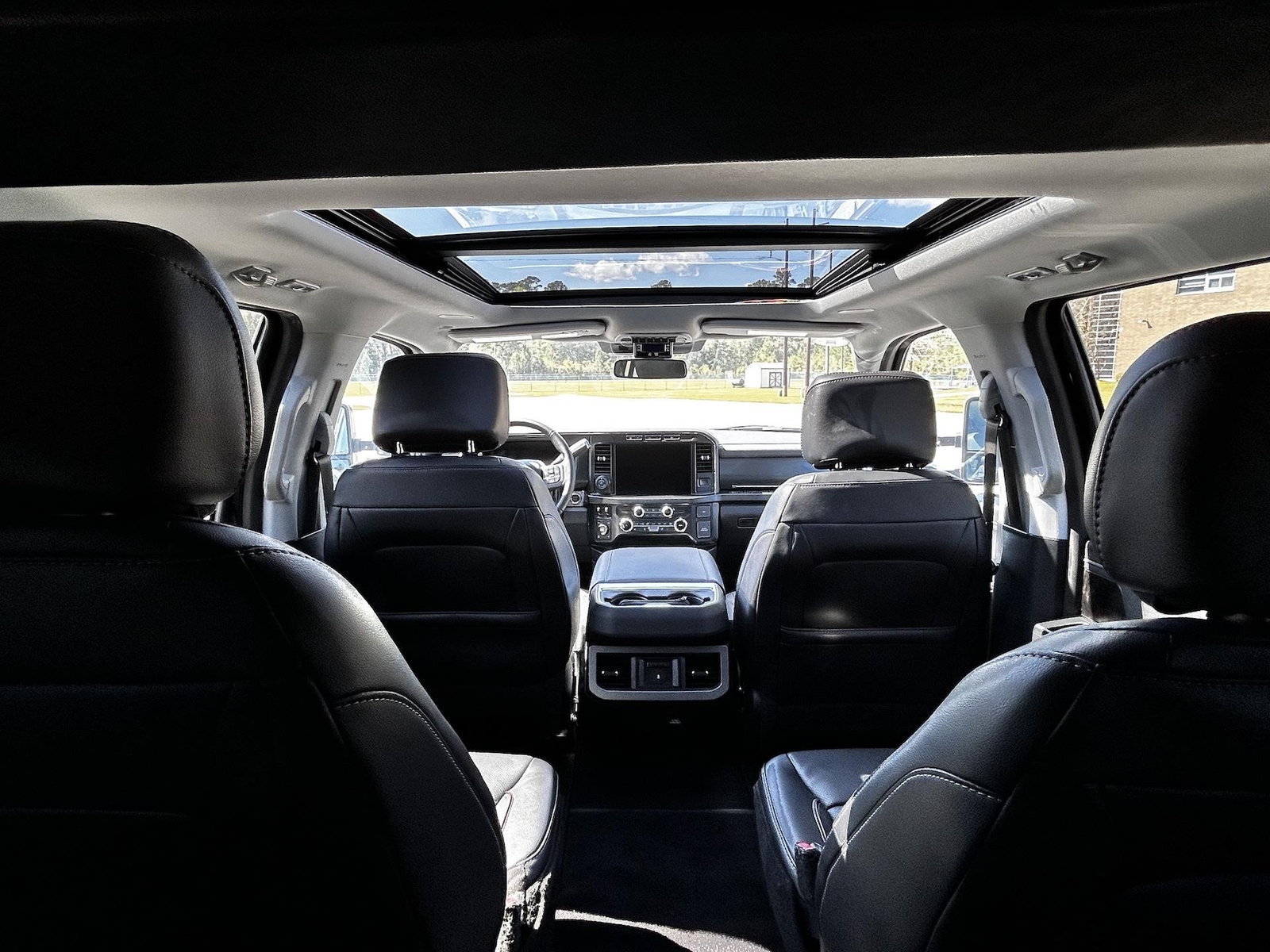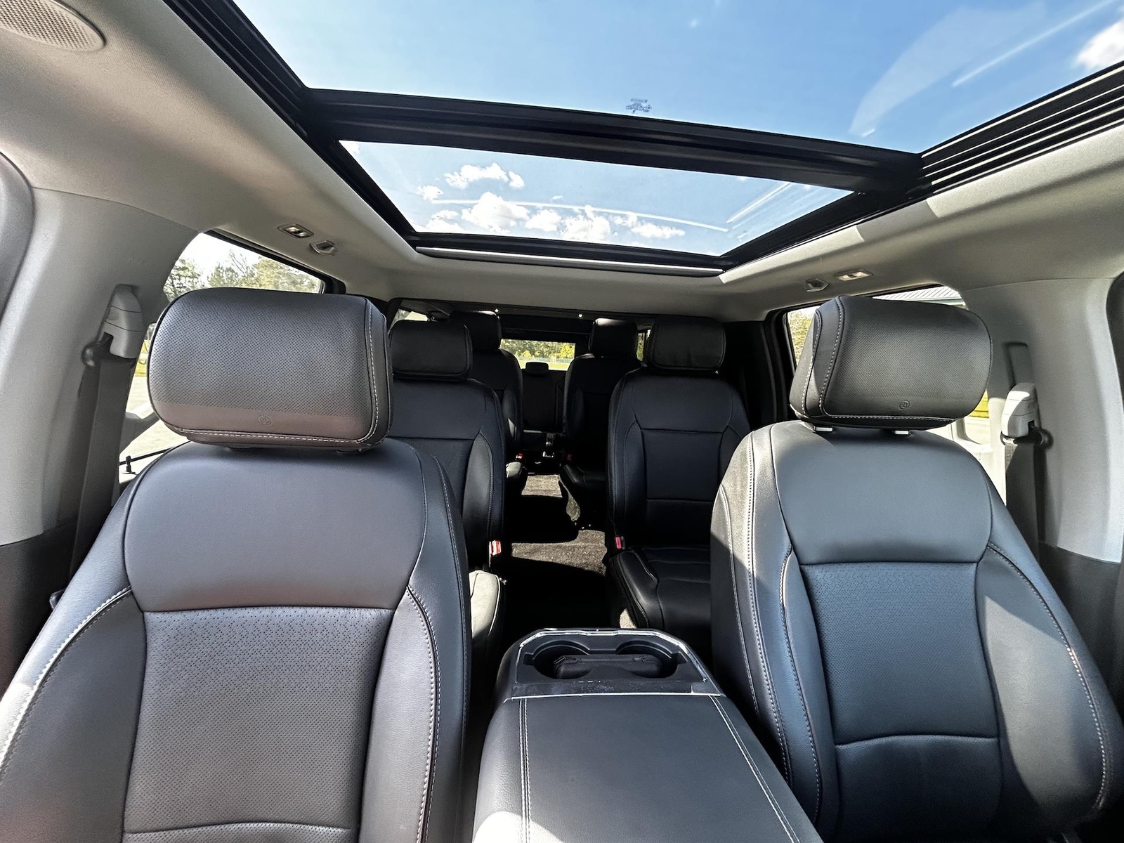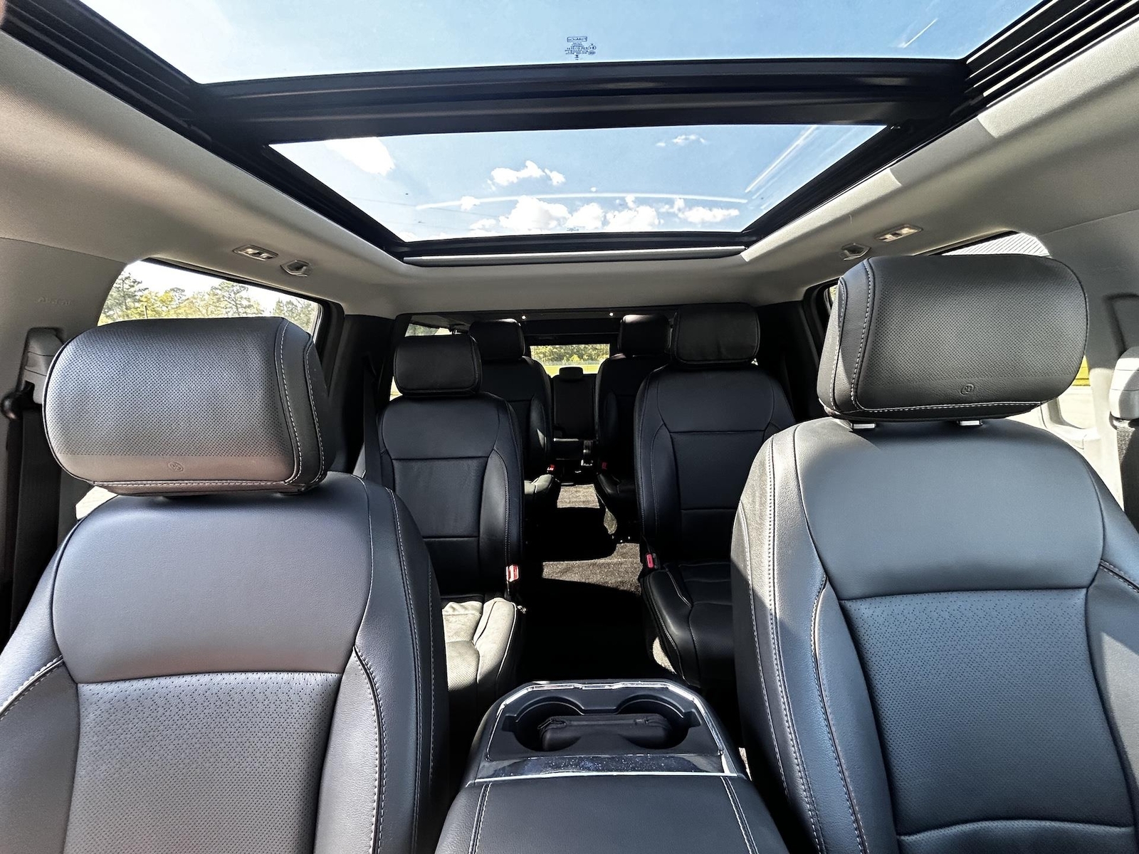 Chrome-trimmed, power running boards facilitate access to the richly appointed cabin. Inside, an expansive twin-panel panoramic power moonroof sheds abundant natural light on the heated and ventilated front row seats with driver-side memory upholstered in luxurious Black Onyx micro-perforated premium leather. To maintain a unified interior design, the second-row and third-row Captain’s seats and the conveniently accessible, power-folding fourth-row bench seat sourced from the Ford® Expedition® all feature matching leather upholstery.