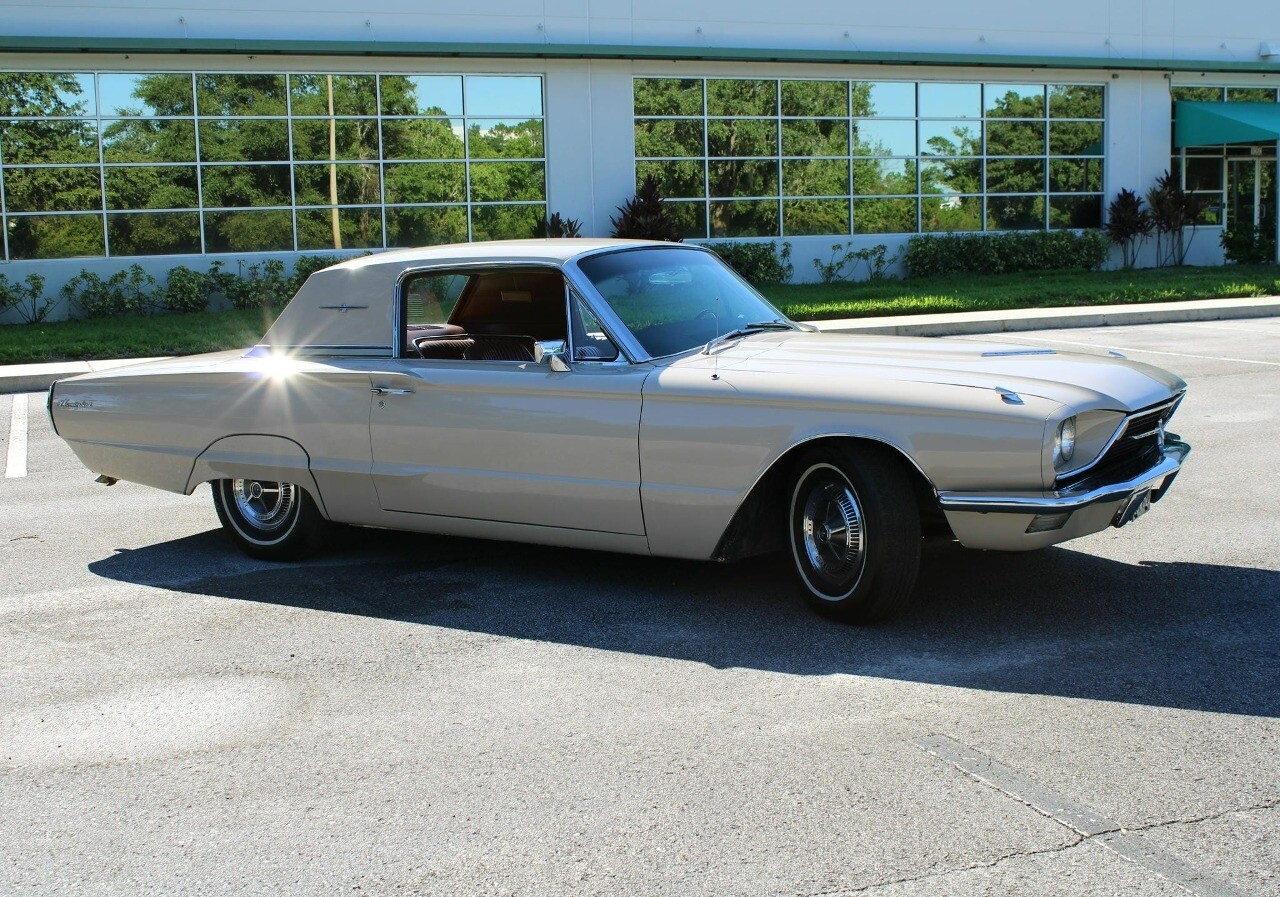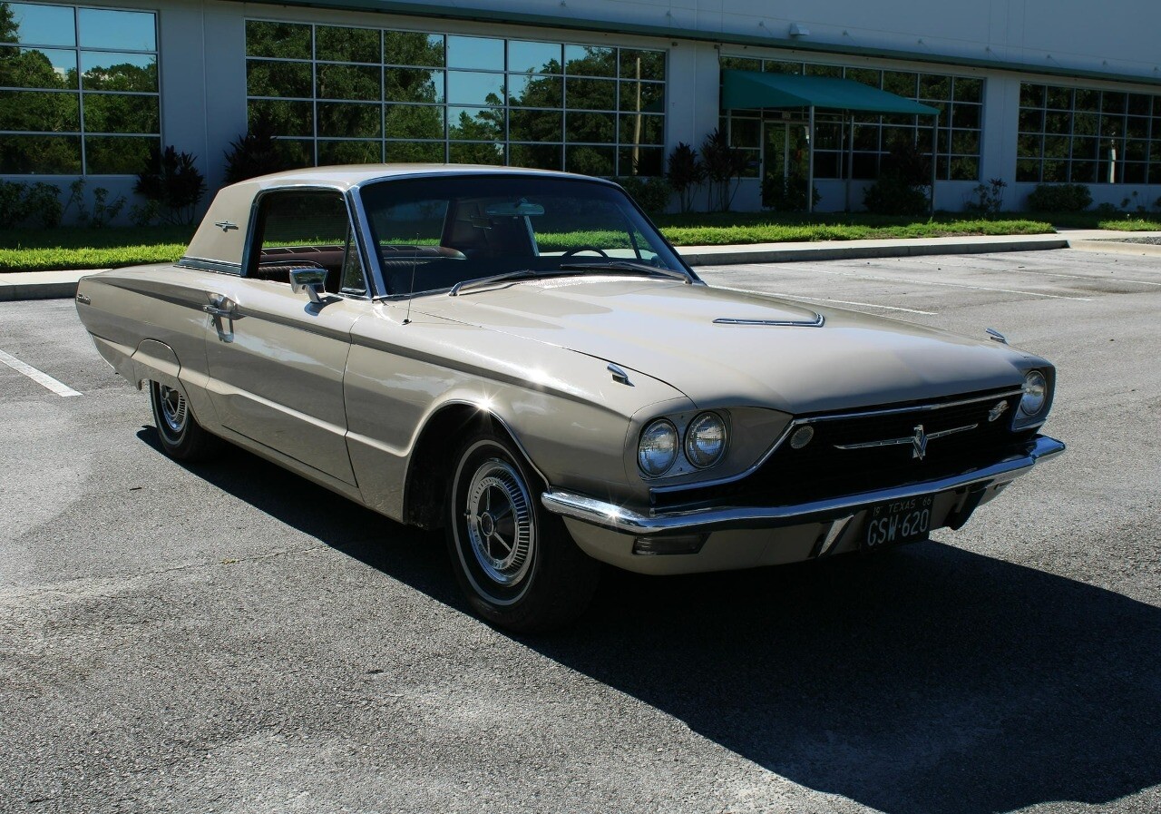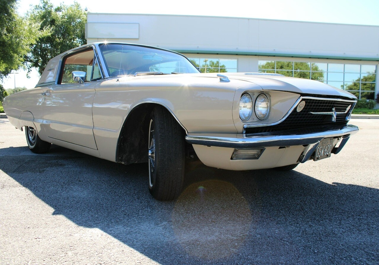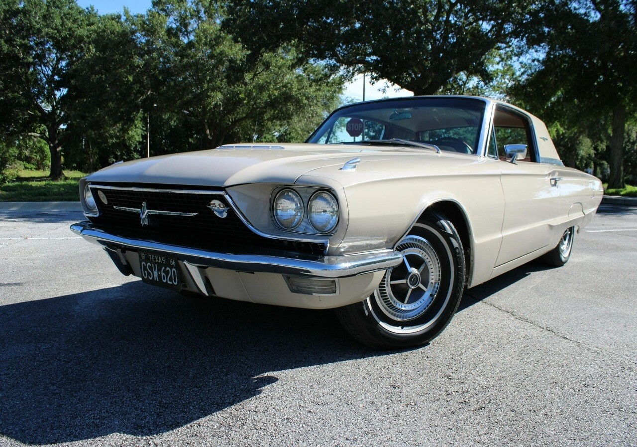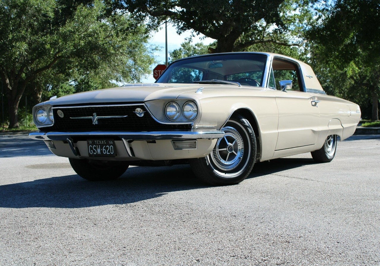 Introducing a classic icon of American automotive design: the 1966 Ford Thunderbird. This stunning vehicle boasts a sophisticated Desert Sand exterior color that complements its elegant lines and timeless appeal. Step inside to find a luxurious Saddle interior, crafted with high-quality vinyl that exudes both comfort and style.