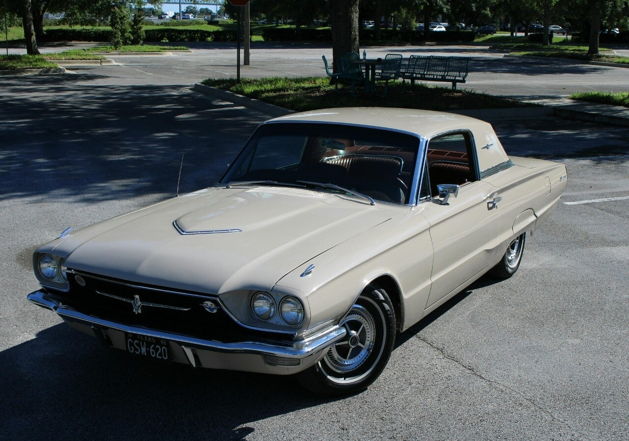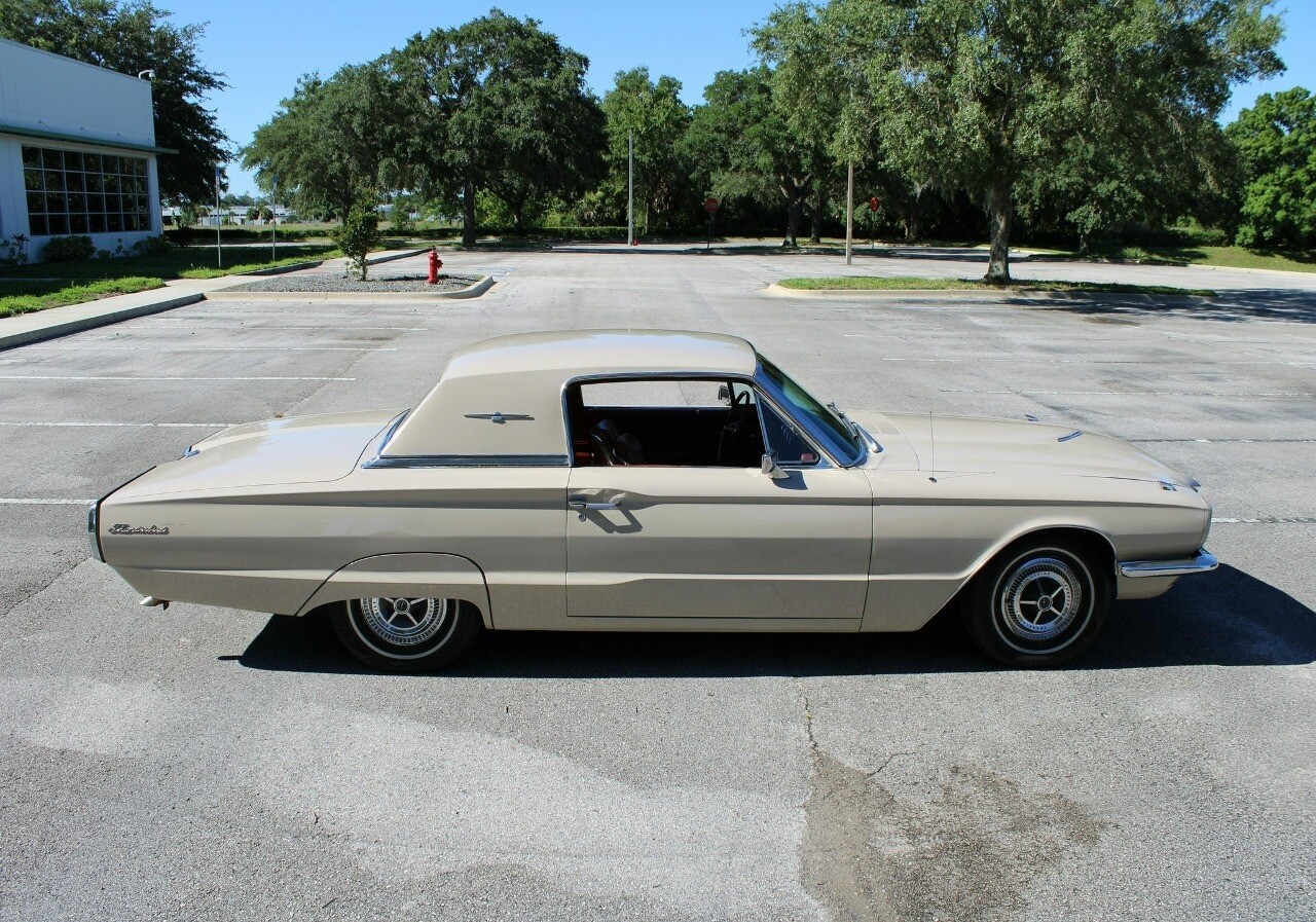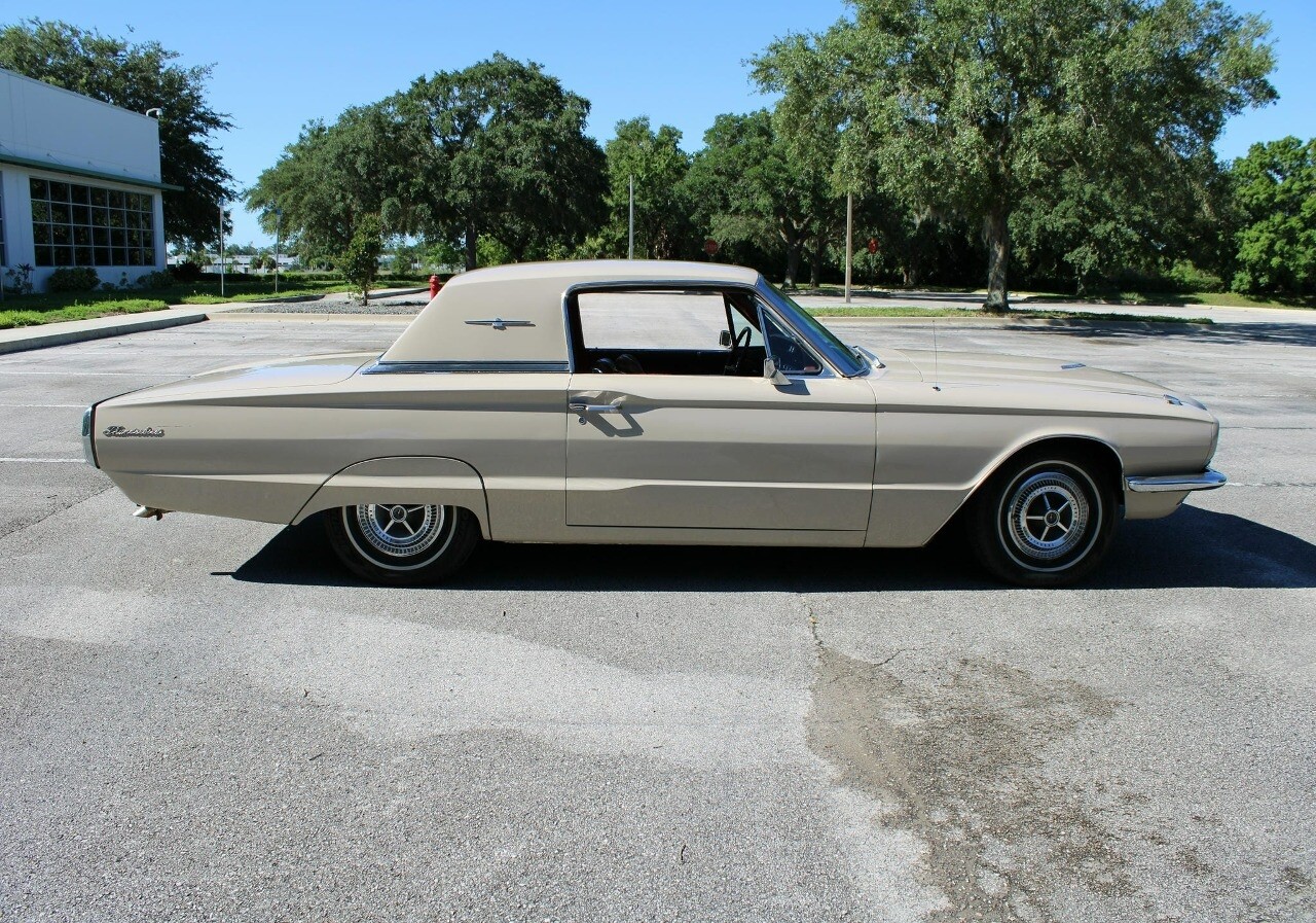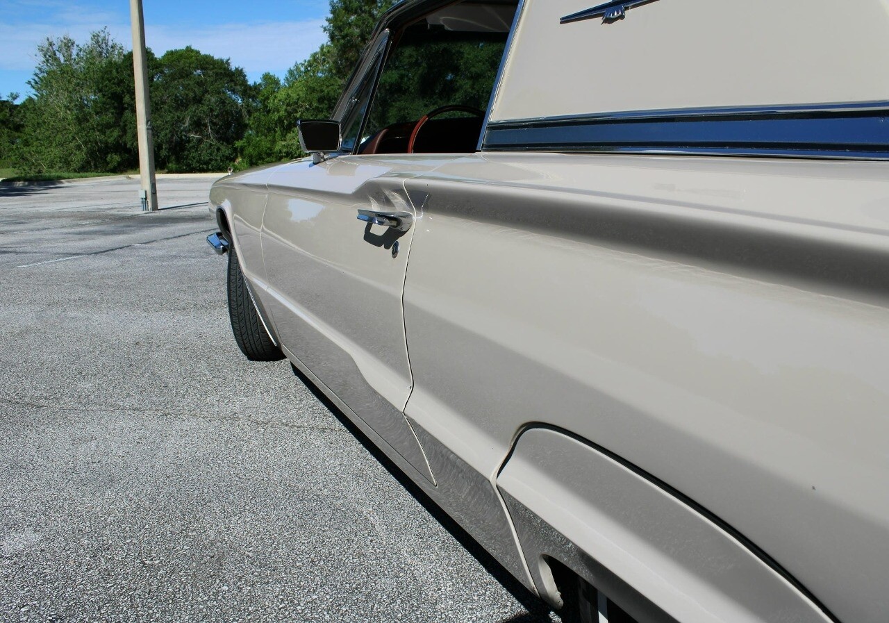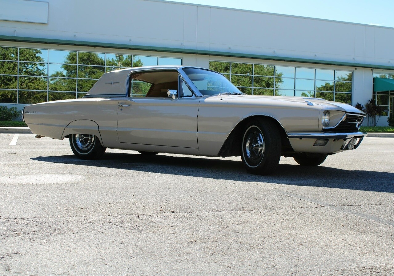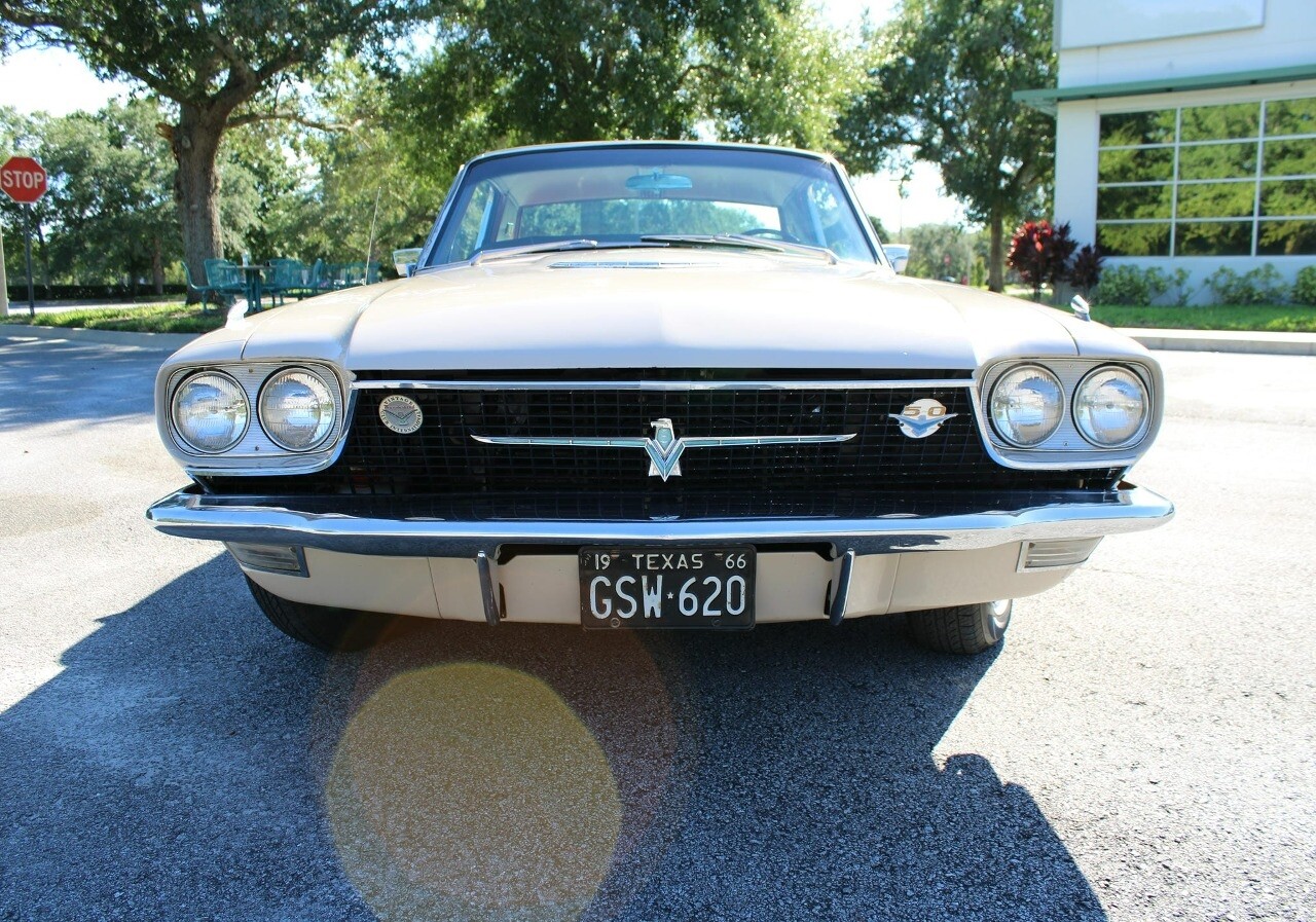 Introducing a classic icon of American automotive design: the 1966 Ford Thunderbird. This stunning vehicle boasts a sophisticated Desert Sand exterior color that complements its elegant lines and timeless appeal. Step inside to find a luxurious Saddle interior, crafted with high-quality vinyl that exudes both comfort and style.
