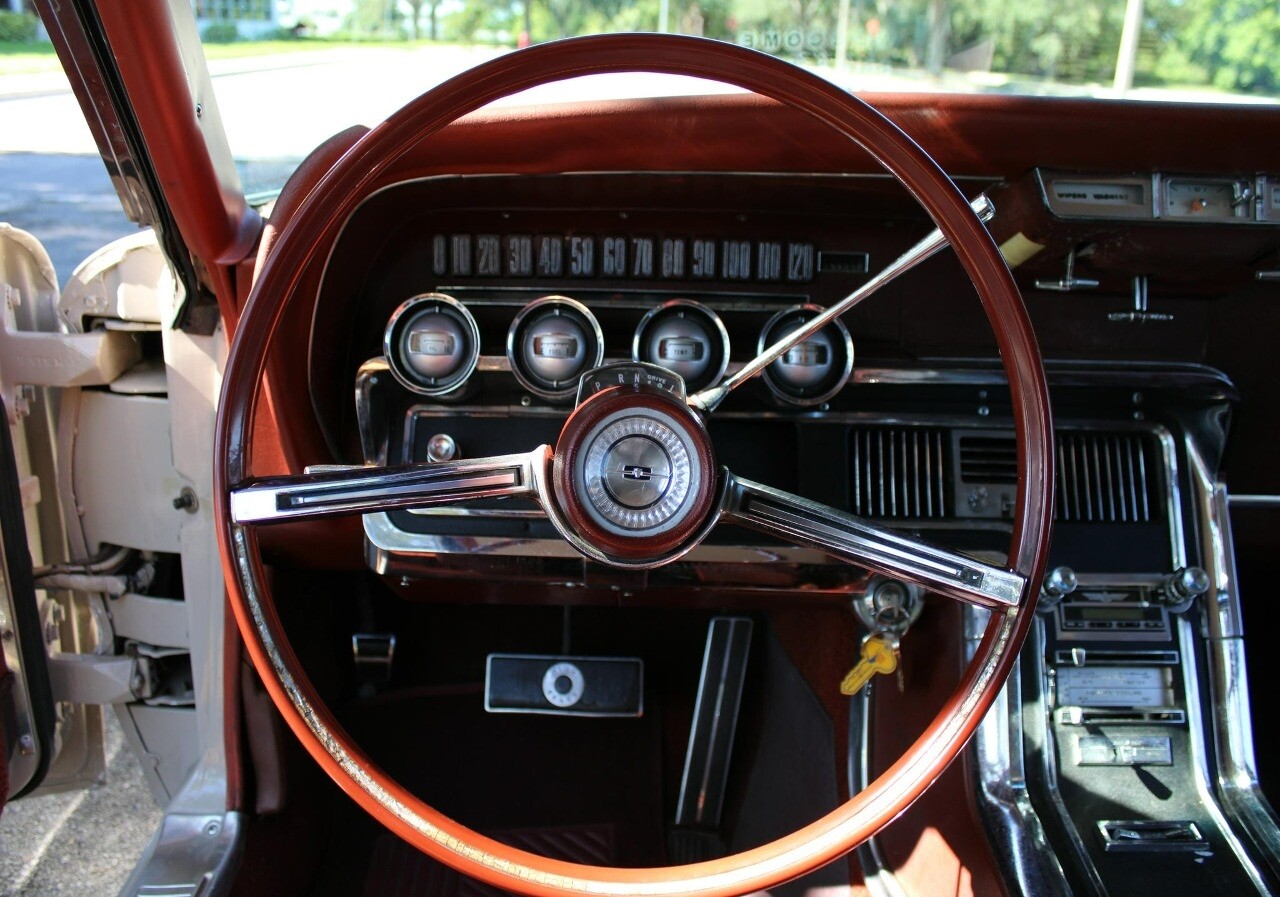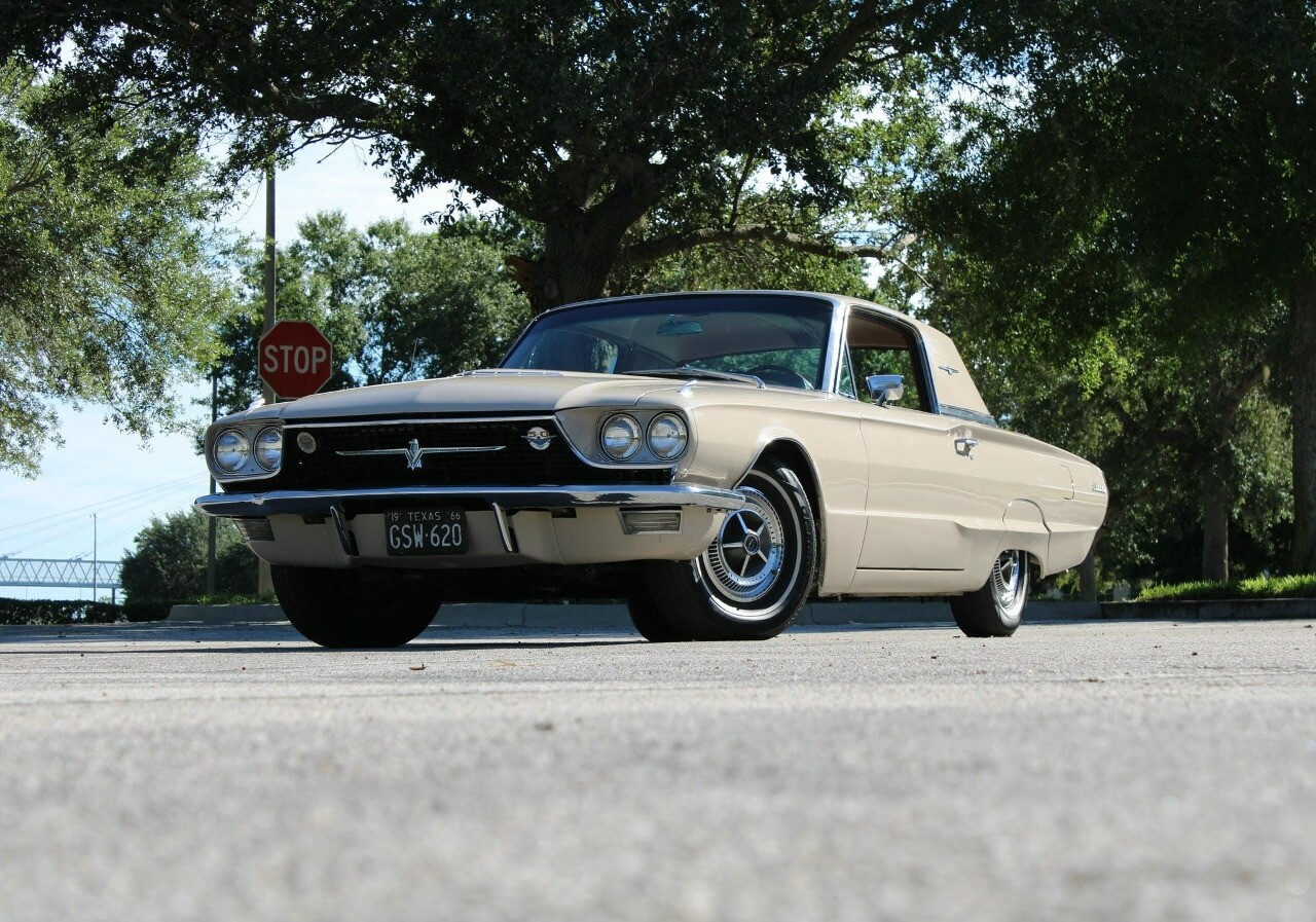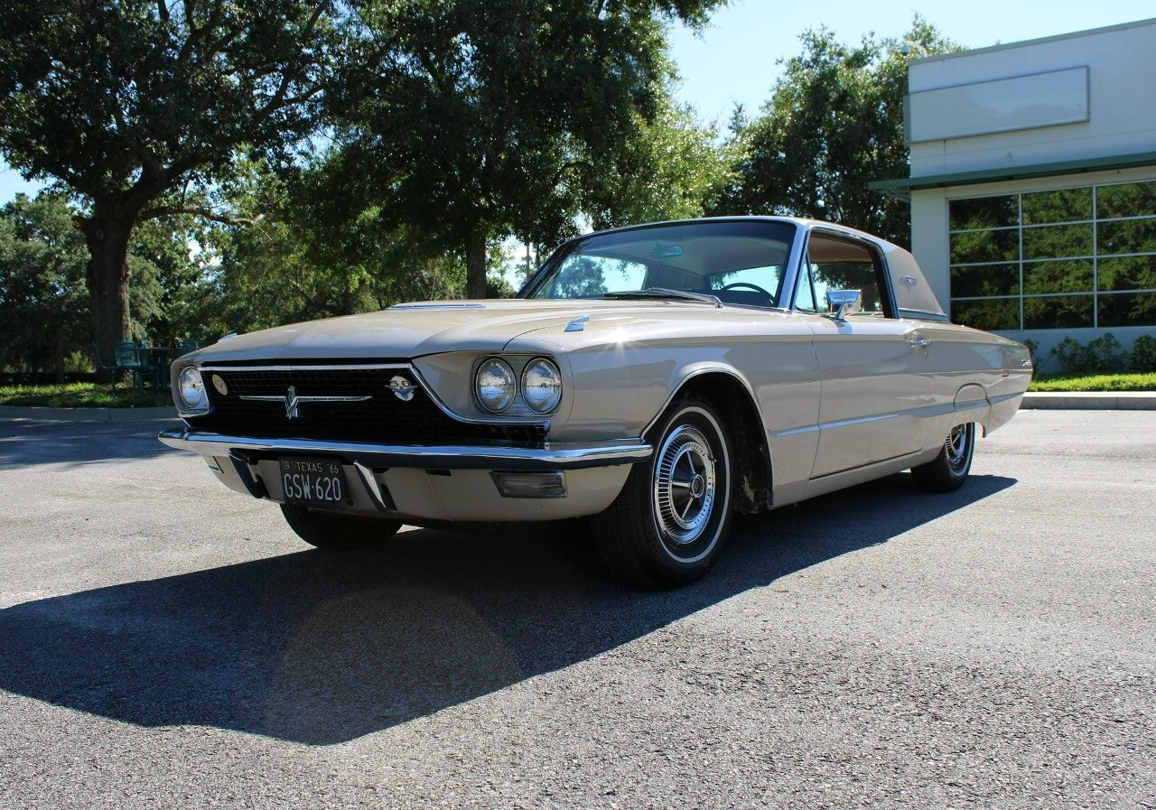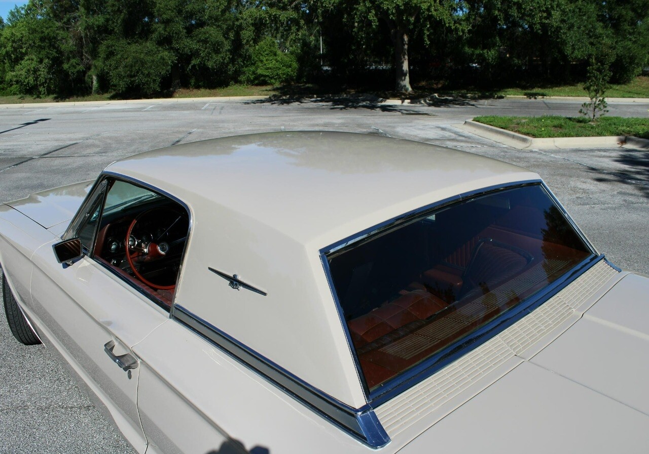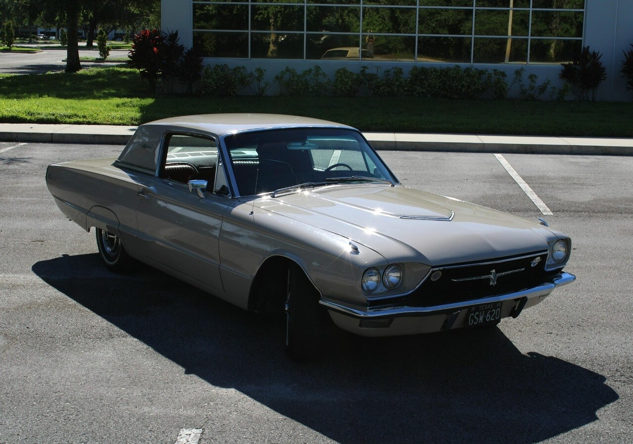 Introducing a classic icon of American automotive design: the 1966 Ford Thunderbird. This stunning vehicle boasts a sophisticated Desert Sand exterior color that complements its elegant lines and timeless appeal. Step inside to find a luxurious Saddle interior, crafted with high-quality vinyl that exudes both comfort and style.