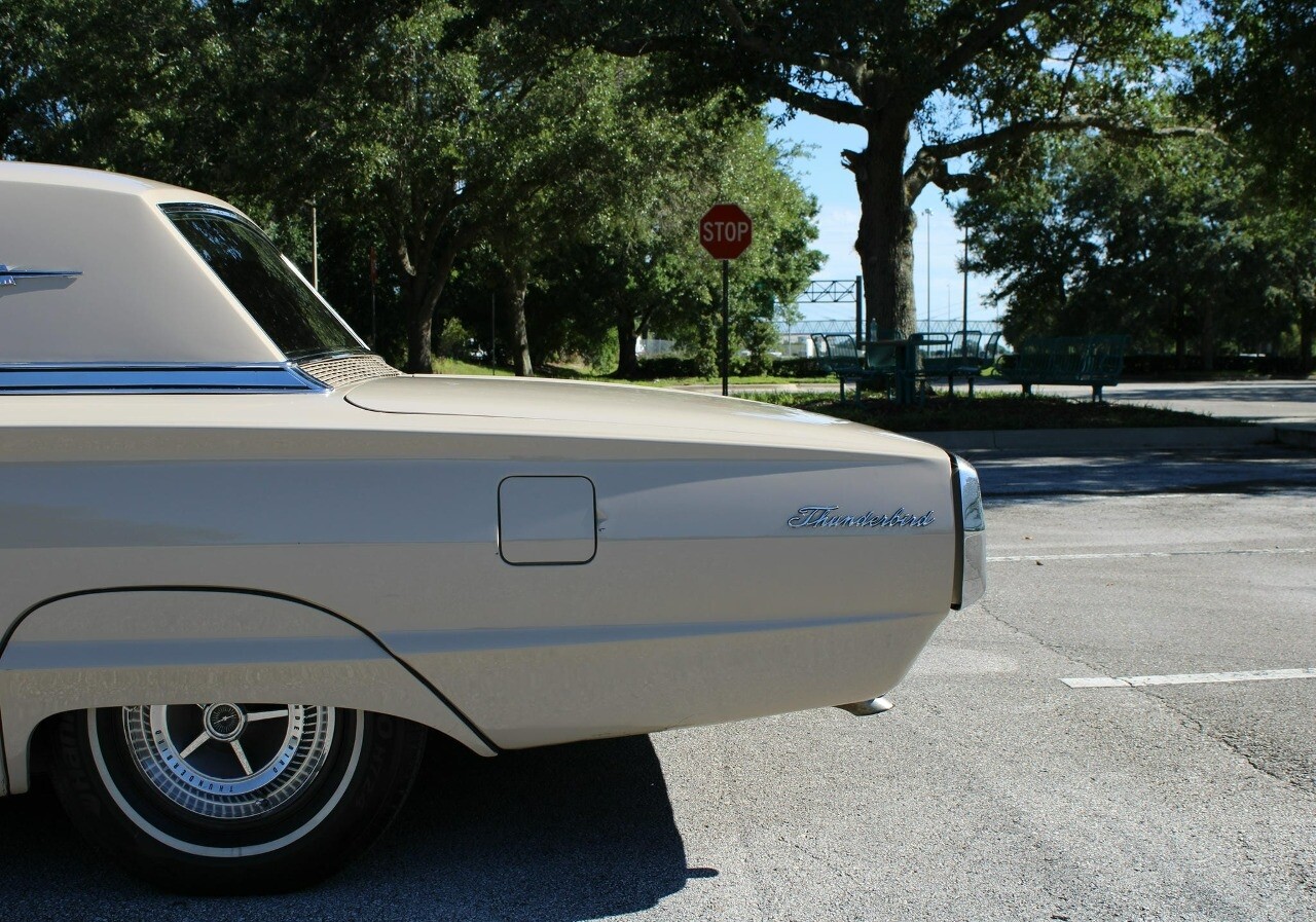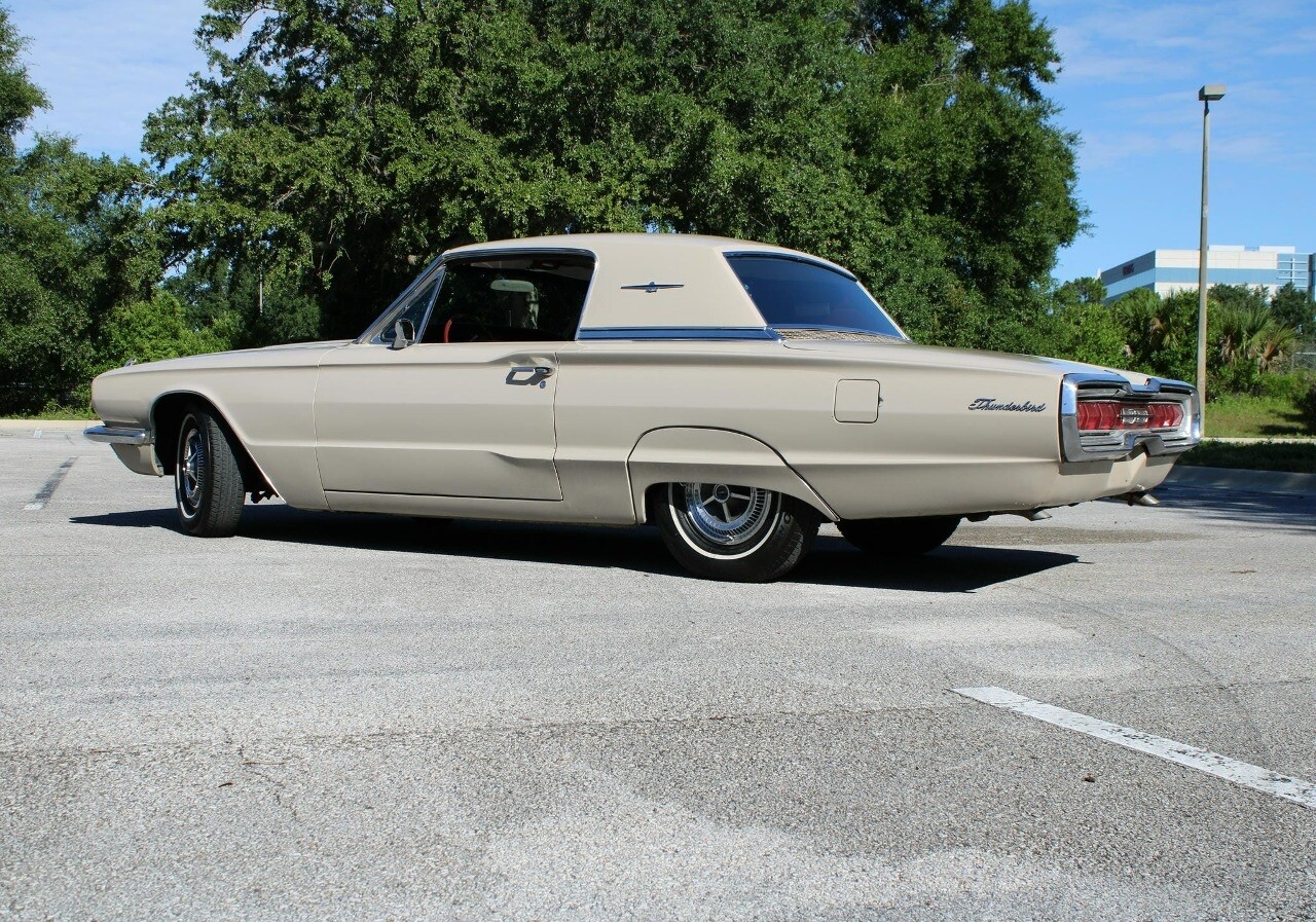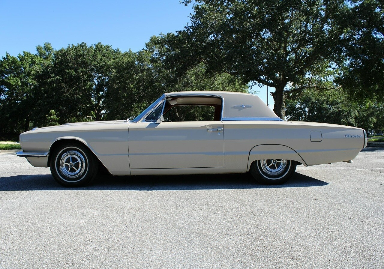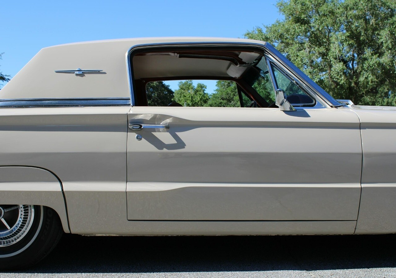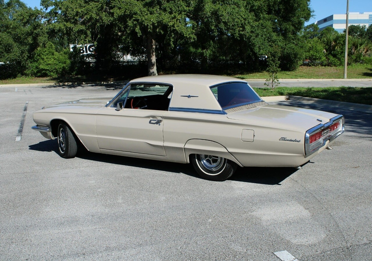 Introducing a classic icon of American automotive design: the 1966 Ford Thunderbird. This stunning vehicle boasts a sophisticated Desert Sand exterior color that complements its elegant lines and timeless appeal. Step inside to find a luxurious Saddle interior, crafted with high-quality vinyl that exudes both comfort and style.