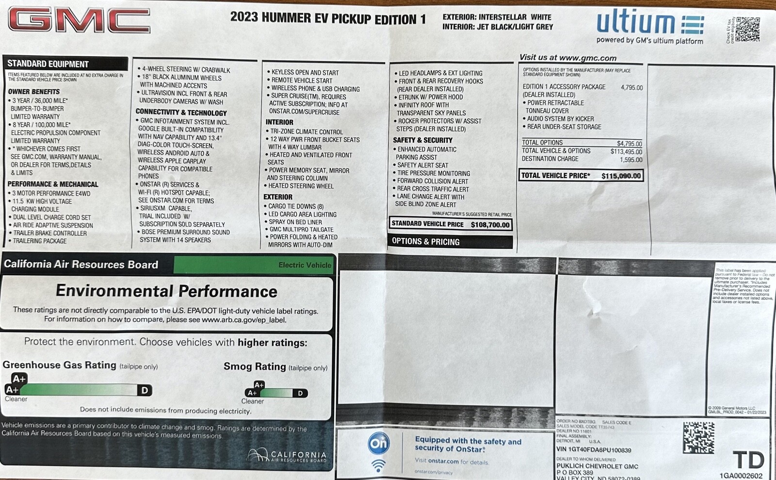This 2023 GMC Hummer EV Pickup is an original. The owner has had it for 1 year. The vehicle runs great and is not regularly driven.Seller's Notes