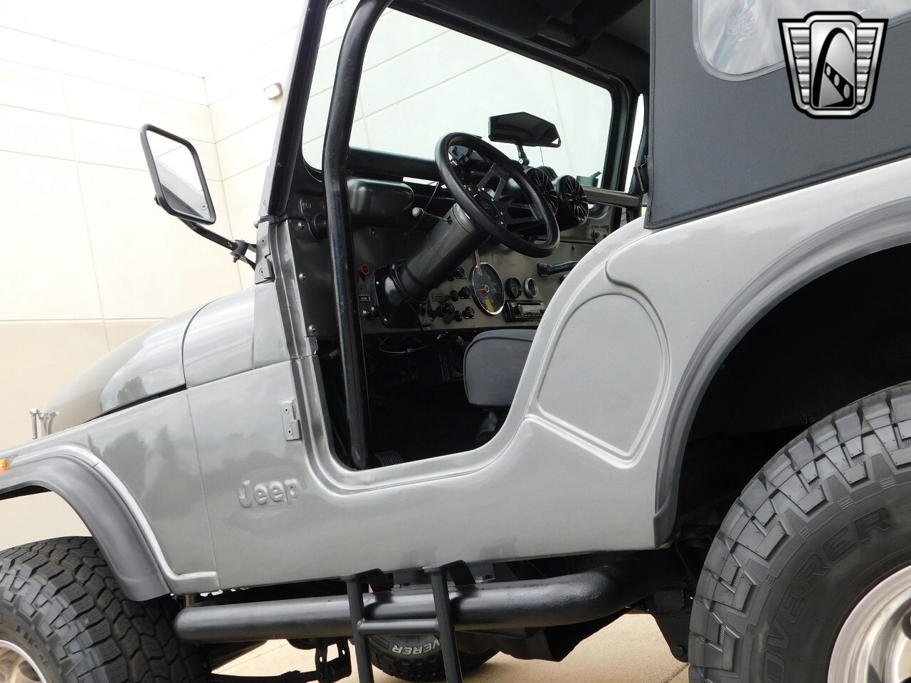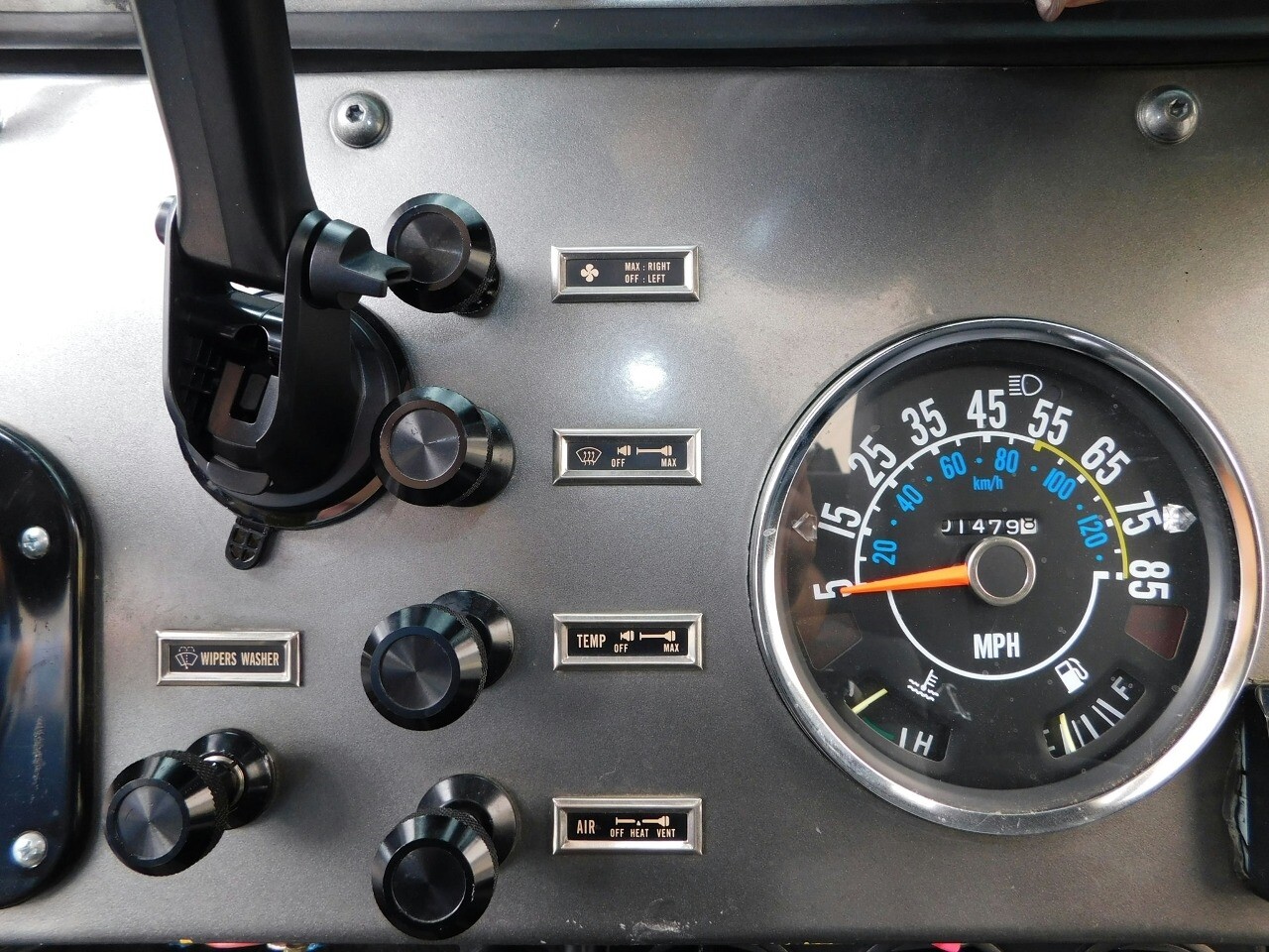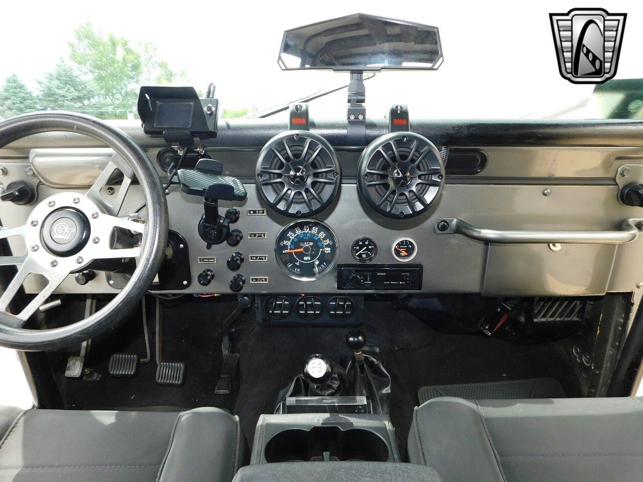 For your entertainment, the Jeep CJ-5 is equipped with an AM/FM radio, providing a touch of modern convenience amidst its vintage charm. Safety is also a priority, with seatbelts included for both driver and passengers. The radial tires further enhance the vehicle's performance, offering improved stability and traction on various terrains.