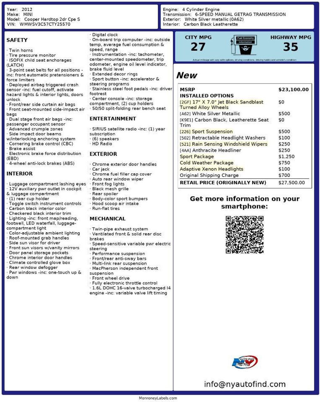 Take a look at this 2012 White Silver Metallic MINI Cooper S with Carbon Black Leatherette Interior, a Clean Carfax, only One Owner and only 111,801 miles. This is one sporty looking MINI with a ton of quality to back it up. It has an absolutely ideal one owner, clean history and a ton of amazing options. It also has phenomenal looks both inside and out. It's quite impressive all around. It comes equipped with a 1.6L 4-cylinder engine paired to a 6-speed Manual Transmission, Sport Package (with 17 Black Spoke Alloy Wheels, Dynamic Traction Control, White Turn Signals, Xenon Headlights), Cold Weather Package (with Heated Front Seats, Heated Mirrors and Washer Jets, Power-Folding Mirrors), Adaptive Xenon Headlights, Anthracite Headliner, Rain Sensing Windshield Wipers and Automatic Headlights, Retractable Headlight Washers, Sport Suspension with Stiffer Front and Rear Stabilizer Bars, Cruise Control, Steering Wheel Controls, AM/FM/HD Radio, Sirius Satellite Radio, Power Windows, Power Locks, Air Conditioning and so much more. Every NY Auto Find vehicle comes with a complimentary Limited Warranty and a Carfax Vehicle Report. Our vehicles are priced to sell quickly. Please call to check availability and to schedule an appointment. -