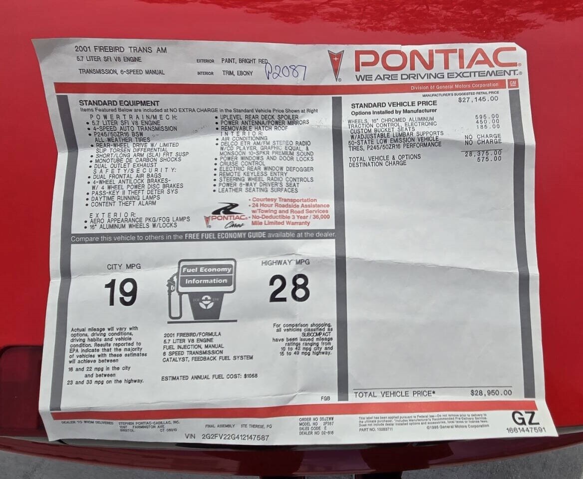 2001 Pontiac Firebird Trans Am WS-6 Coupe ***Only 1 Meticulous Owner Since New! ***32,xxx Original & Certified Miles ***WS-6 Performance Package ***Ram-Air ***6-Speed Manual Transmission ***Removable Glass T-Tops W/Original Unused Shades ***Optional Chrome 17 Wheel Package Wrapped In GoodYear Rubber ***100% Stock & Never Raced Or modified ***All Original Paint & Body Panels ***Immaculate Undercarriage ***Pristine Non-Smoker Leather Cockpit ***Ice Cold Air Conditioning ***Original Books, Manuals, Supplements, Keys, Remotes, Spare, Jack, T-Top Shades, Wheel Lock, & Window Sticker Are Included! ***This Is Certainly One Of The Best Preserved And Original WS-6 Trans Am's Available For Sale Anywhere ***Absolutely No Disappointments!!! ***Financing & Inexpensive Front Door Delivery Are Available BUY IT NOW! $31,990 Visit our 35,000 sq ft showroom MGM Classic Cars LLC 150 S. Church Street Addison IL 60101 Call or Text Dan (630) 802-4772