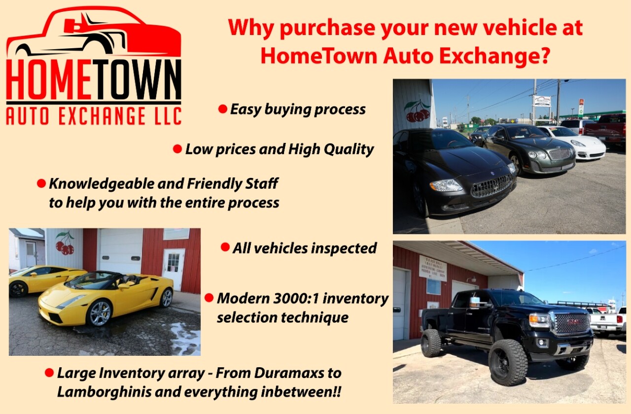 Nationwide shipping available directly to your door!! Financing available!! Warranties available for most vehicles!! Visit us at Hometownautoexchange.com to view detailed pictures and additional information. We pride ourselves in offering our customers the highest quality vehicle for the absolute LOWEST price possible! Local? Come see us at 2491 Vista Dr, Lake Geneva WI 53147, call us at 262-586-8028 or email us at hometownautoexchange@gmail.com. Long Distance? Fly in, we will pick you up from the airport (ORD and MKE)! Call/email us today to schedule your test drive!